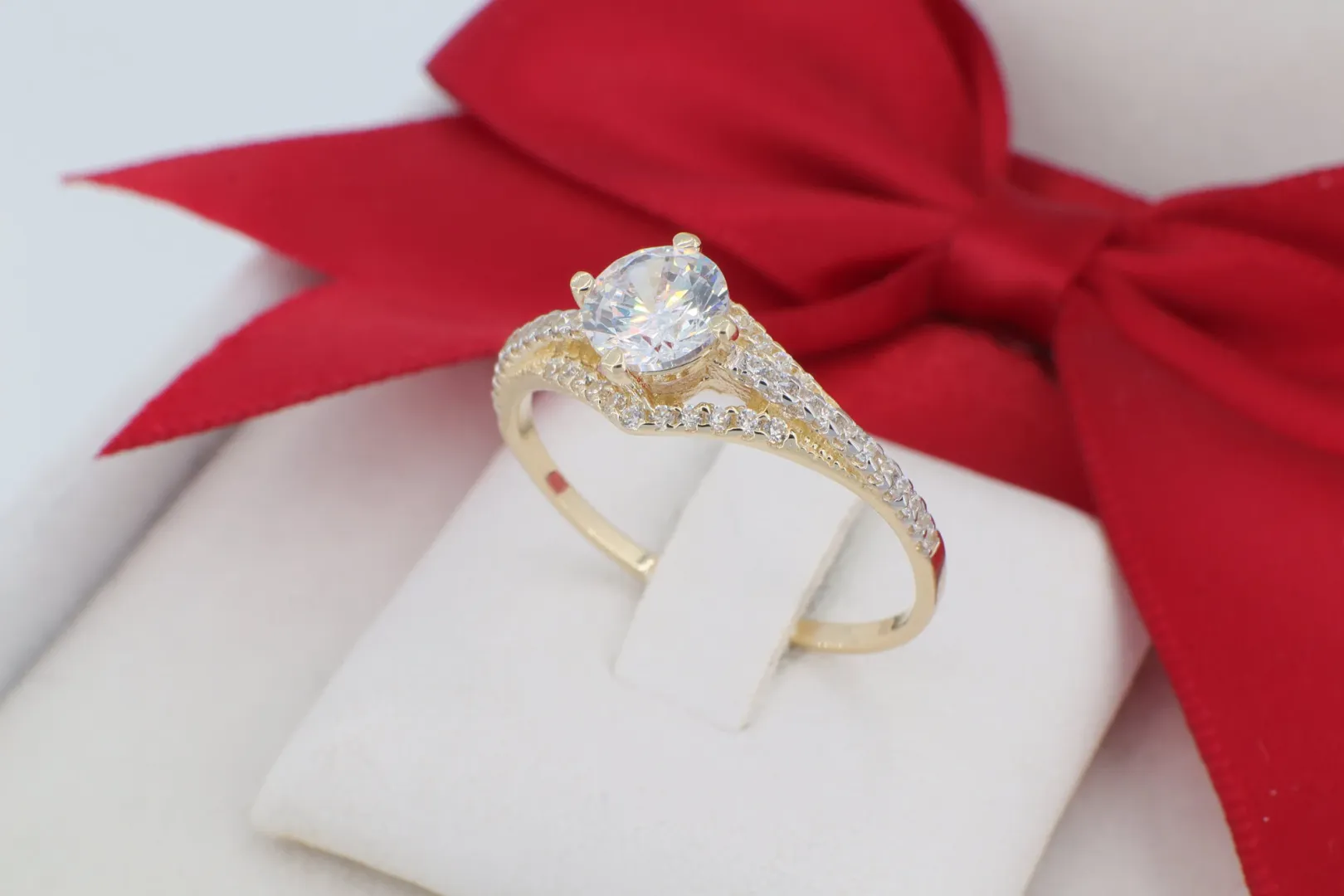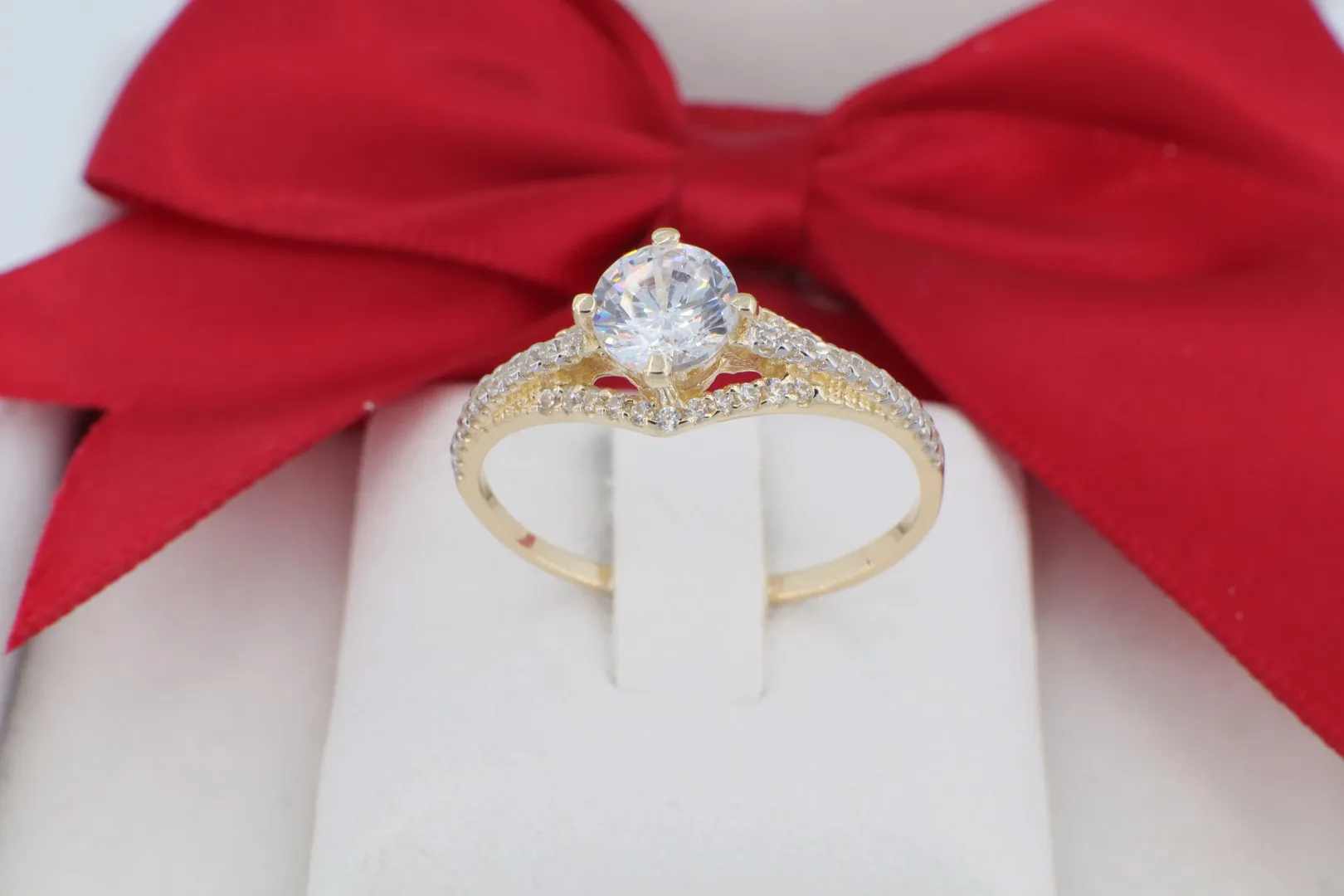 14 Karátos Arany Eljegyzési Gyűrű V-alakban Osztott, Kövezett Szárral (gy1490)