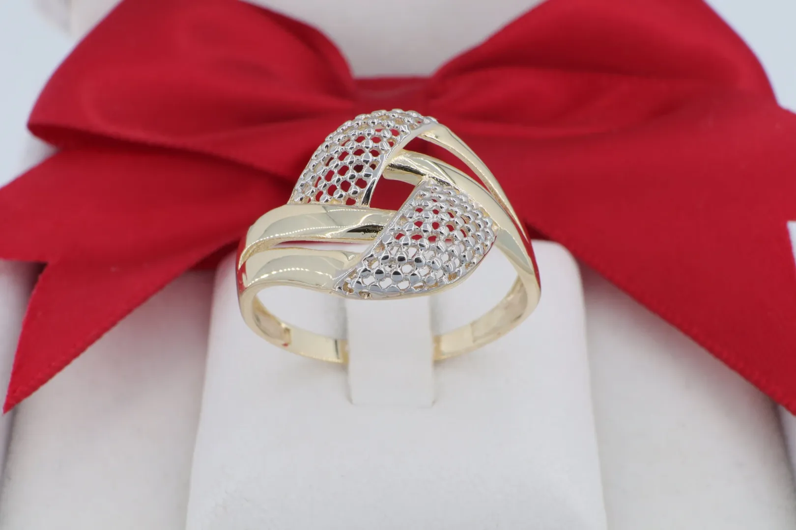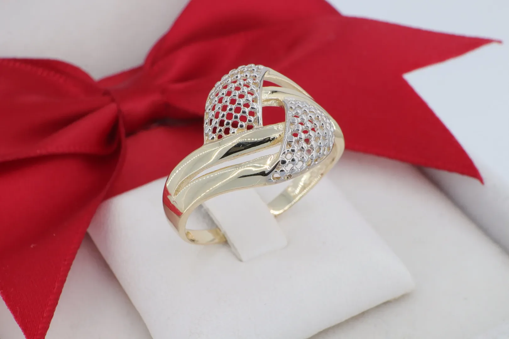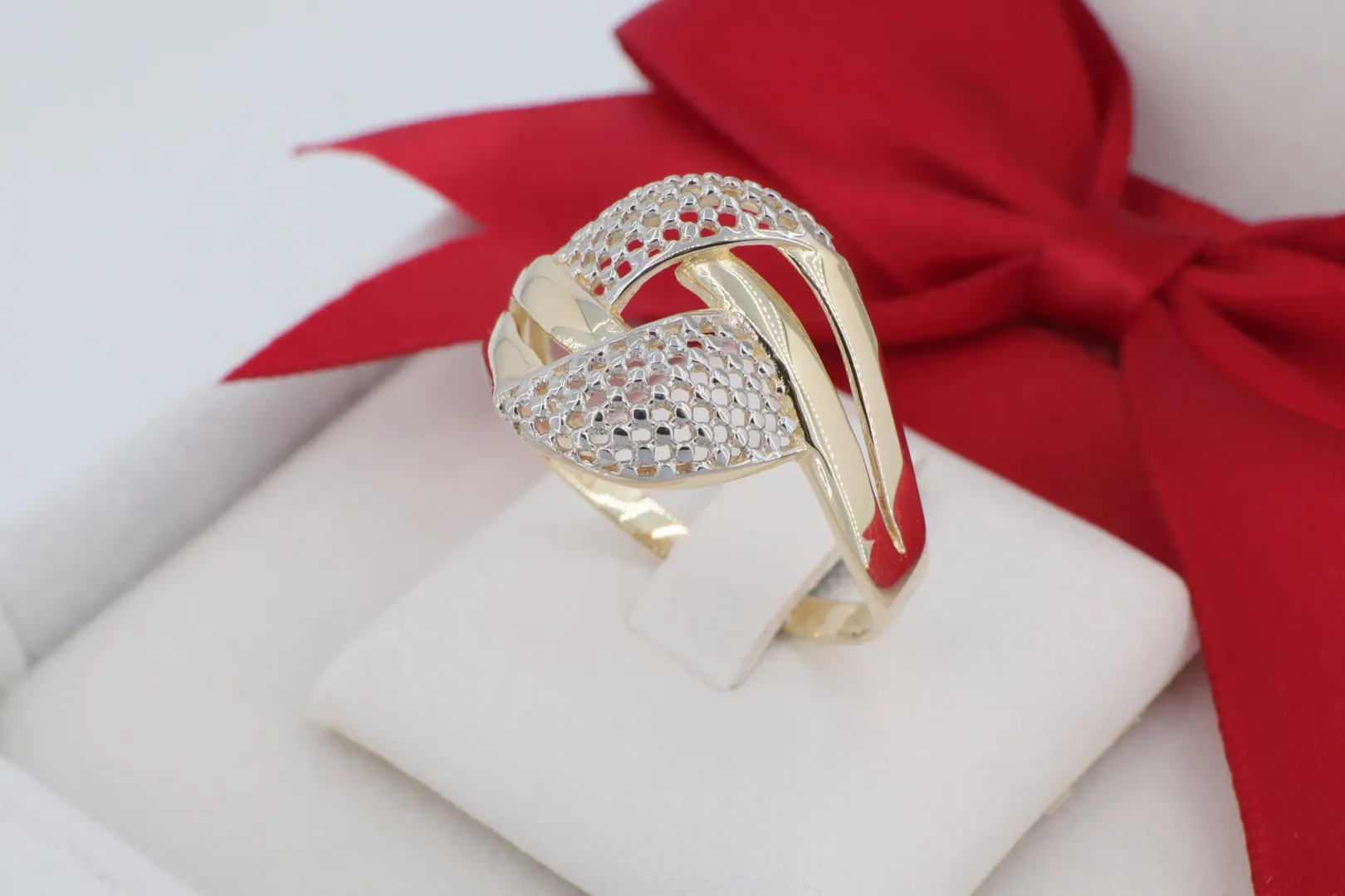 Az ékszer anyaga hitelesített 14 karátos sárga arany (585‰ finomságú). A dizájn egyik legnagyobb vonzereje a kéttónusú (bicolor) hatás: az áttört részek fehér arany hatású ródium bevonatot és precíz gyémántvésett pontozást kaptak. Ez a technika biztosítja, hogy a gyűrű minden mozdulatnál szikrázóan verje vissza a fényt, mintha apró kövekkel lenne kirakva, miközben megőrzi a kő nélküli ékszerek praktikumát.