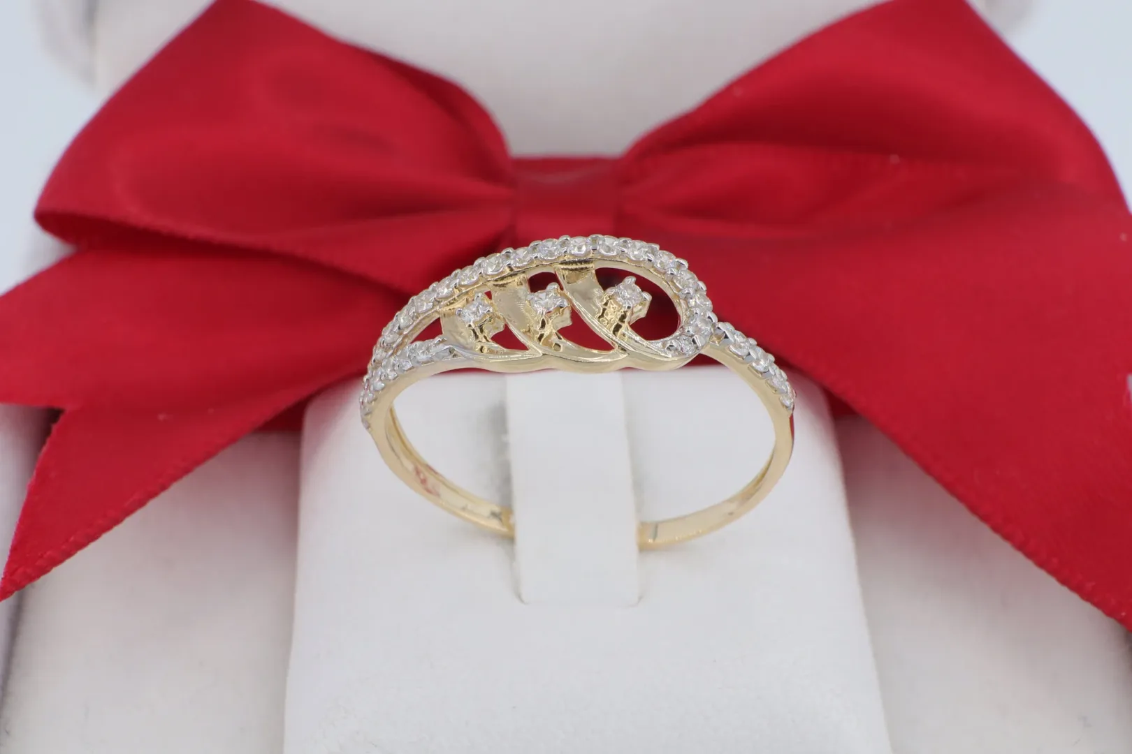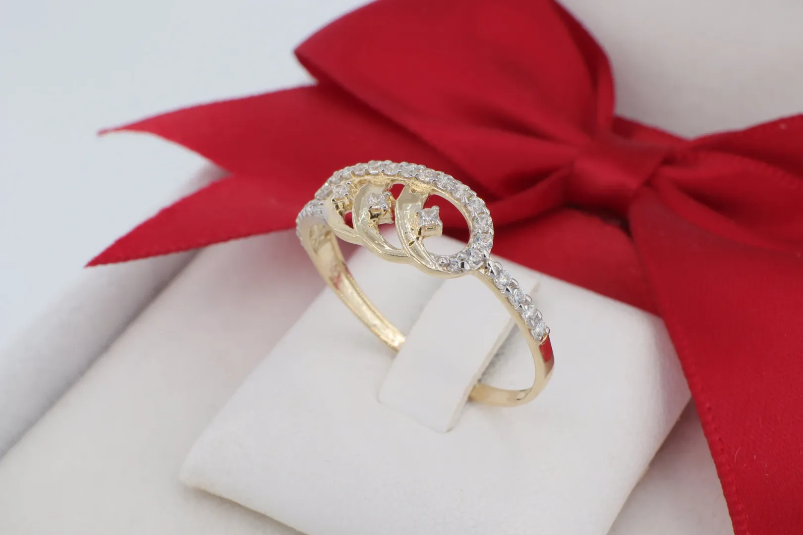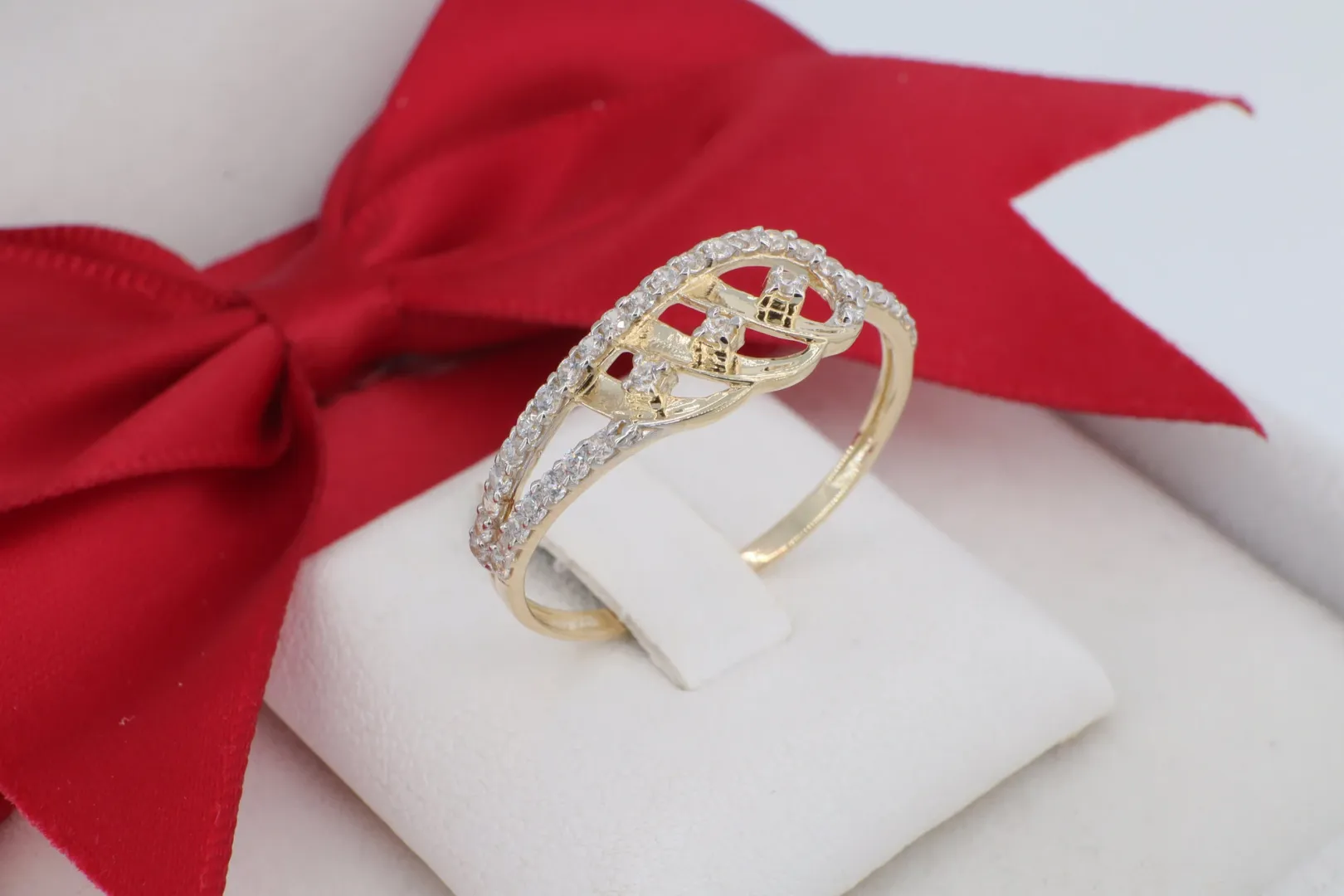 14 Karátos Arany Gyűrű Egymásba Fonódó Dupla Szárral és Cirkóniával (gy2140)