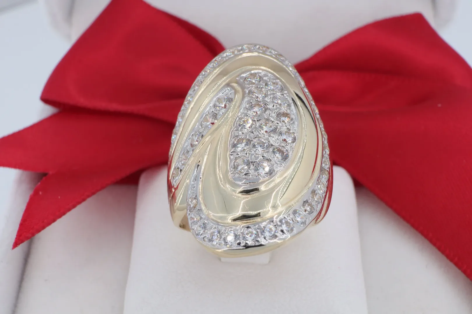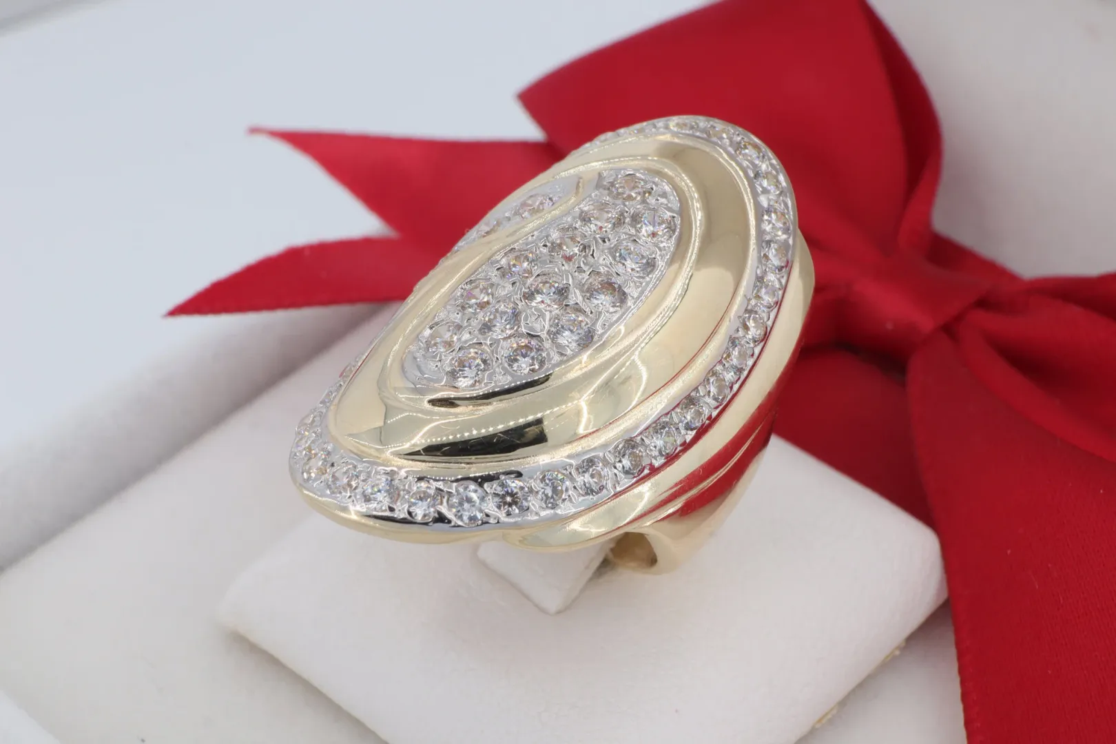 A GY0042-es cikkszámú, 14 karátos arany gyűrű a magabiztos elegancia és a modern ékszerművészet lenyűgöző példája. Ez a darab nem csupán egy kiegészítő, hanem egy látványos stílusnyilatkozat: a széles, dinamikus ívekből felépülő gyűrűfej vonzza a tekintetet és különleges megjelenést kölcsönöz viselőjének. A vízcseppre emlékeztető, áramló formák és a gazdag kövezés találkozása egy igazán karakteres, prémium ékszert eredményez.