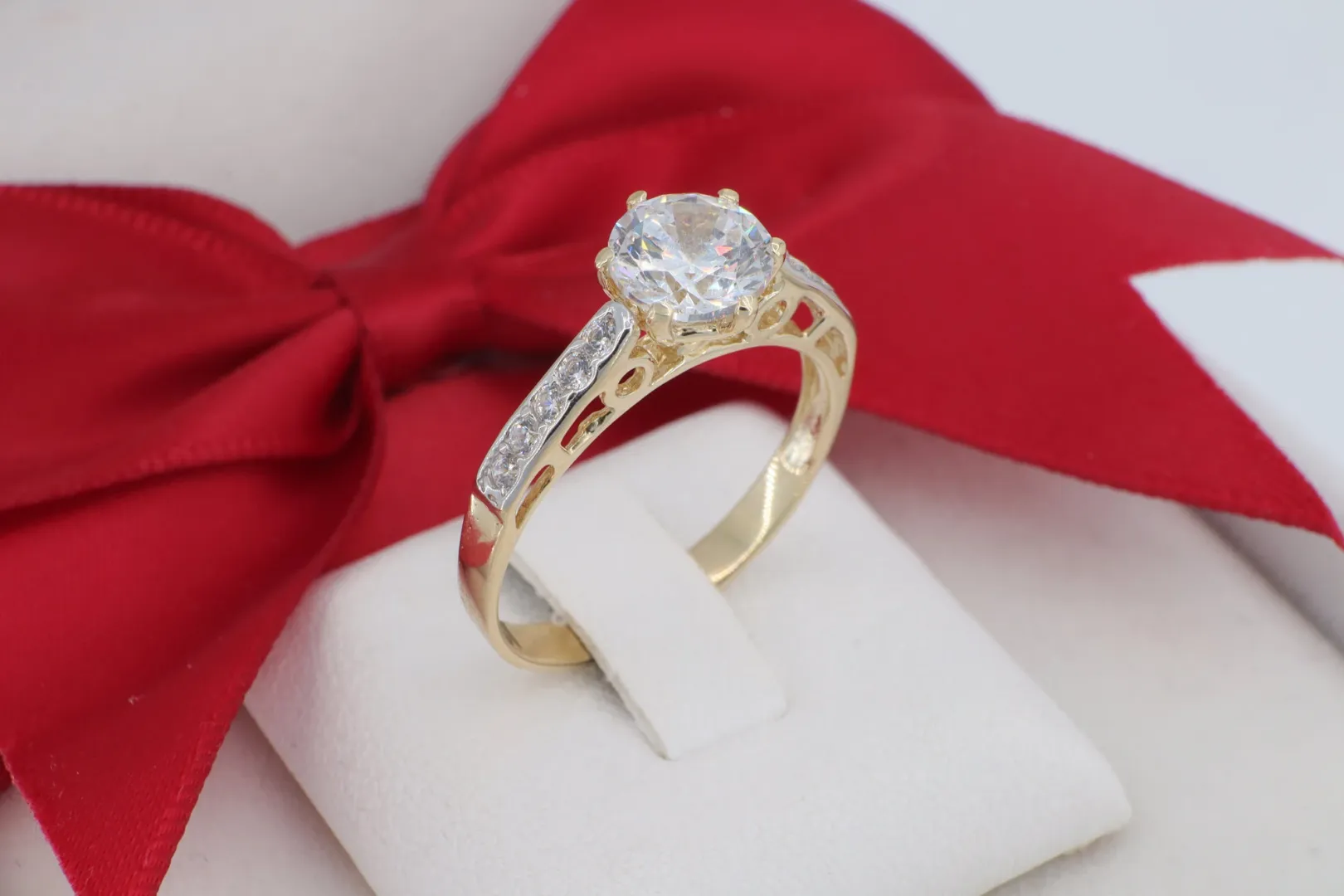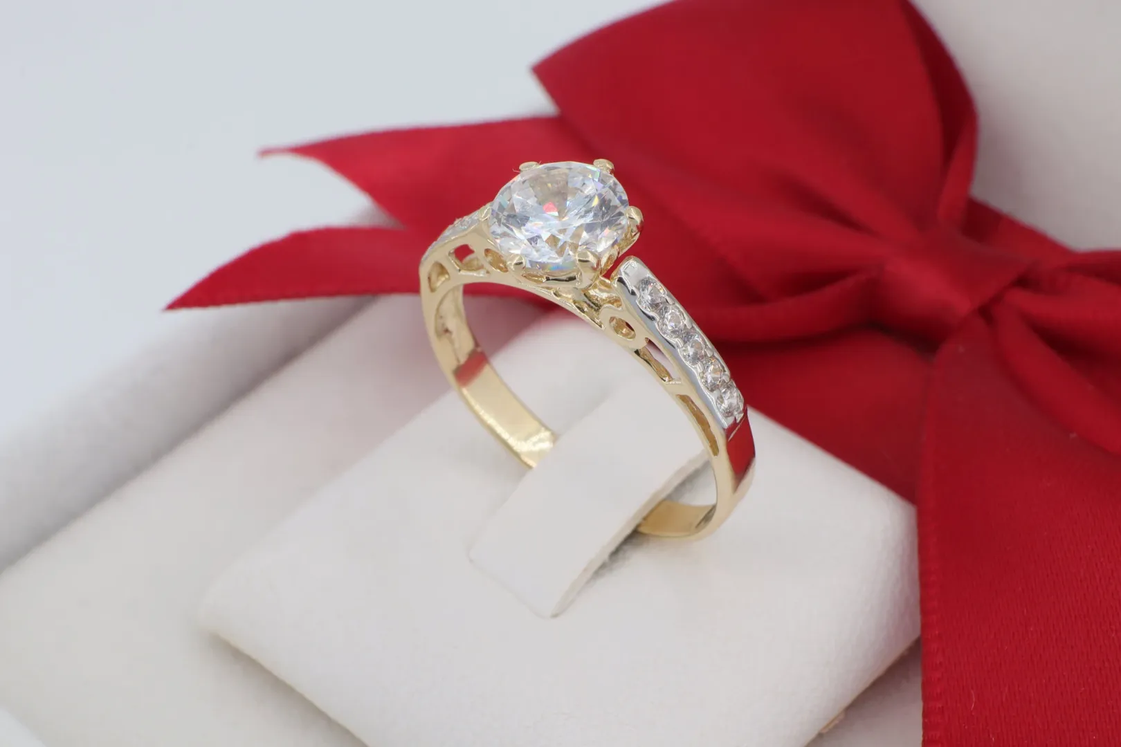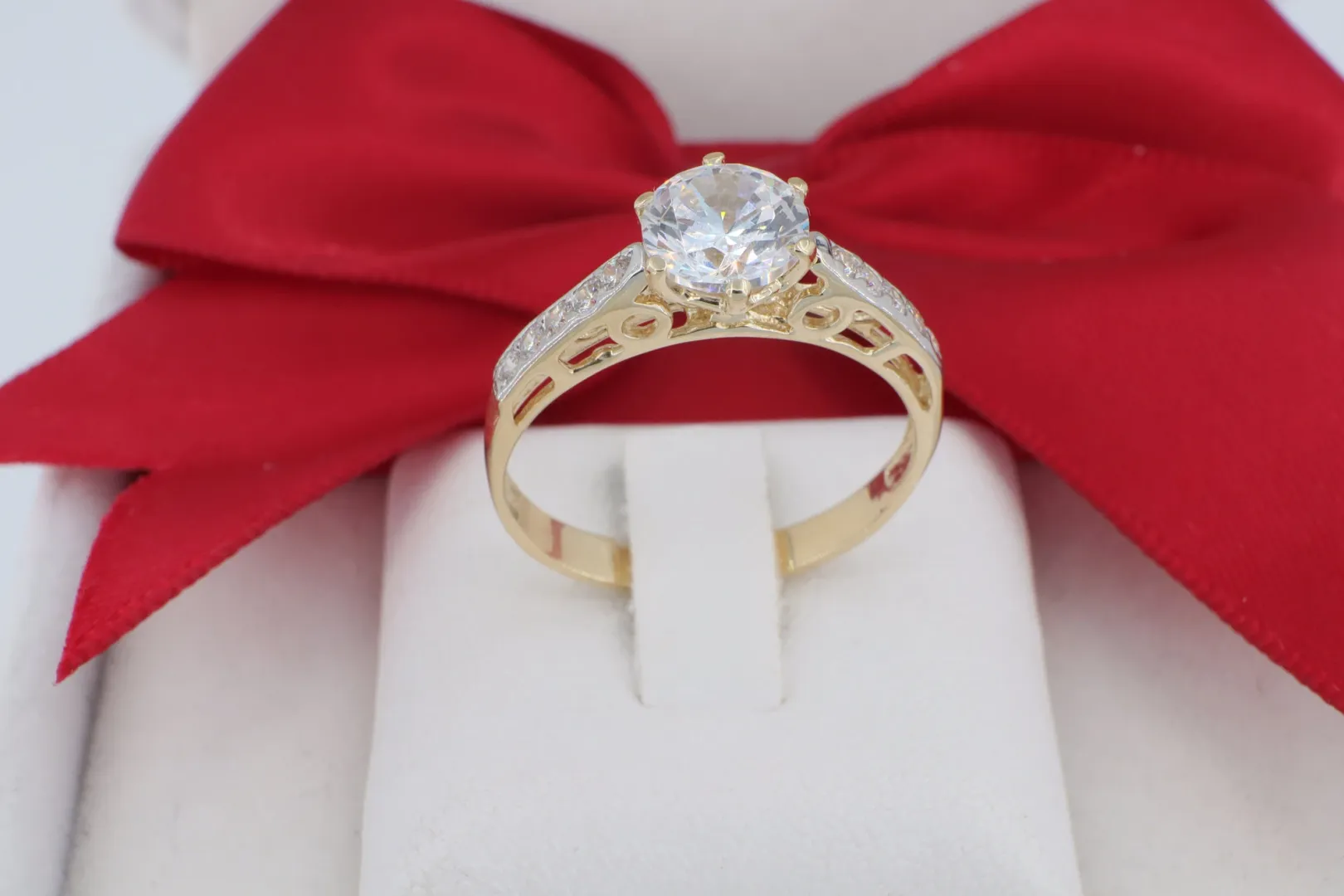 A gy0724-es, 14 karátos arany gyűrű a klasszikus eljegyzési stílus és a grandiózus díszítettség remekműve. Az ékszer fókuszpontjában egy impozáns méretű, briliáns csiszolású központi cirkónia kő tündököl, amelyet hat karom tart biztonságosan, utat engedve a fénynek a maximális szikrázás érdekében. A gyűrű különlegessége a rendkívül részletgazdag, áttört sínkialakítás, amely antik eleganciát és luxus megjelenést kölcsönöz a darabnak.