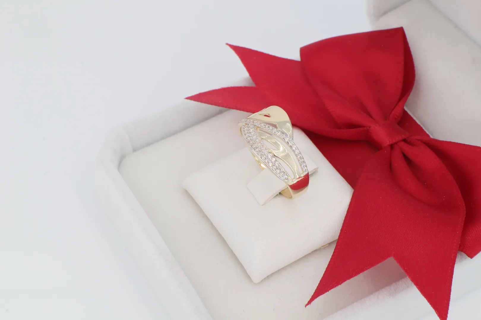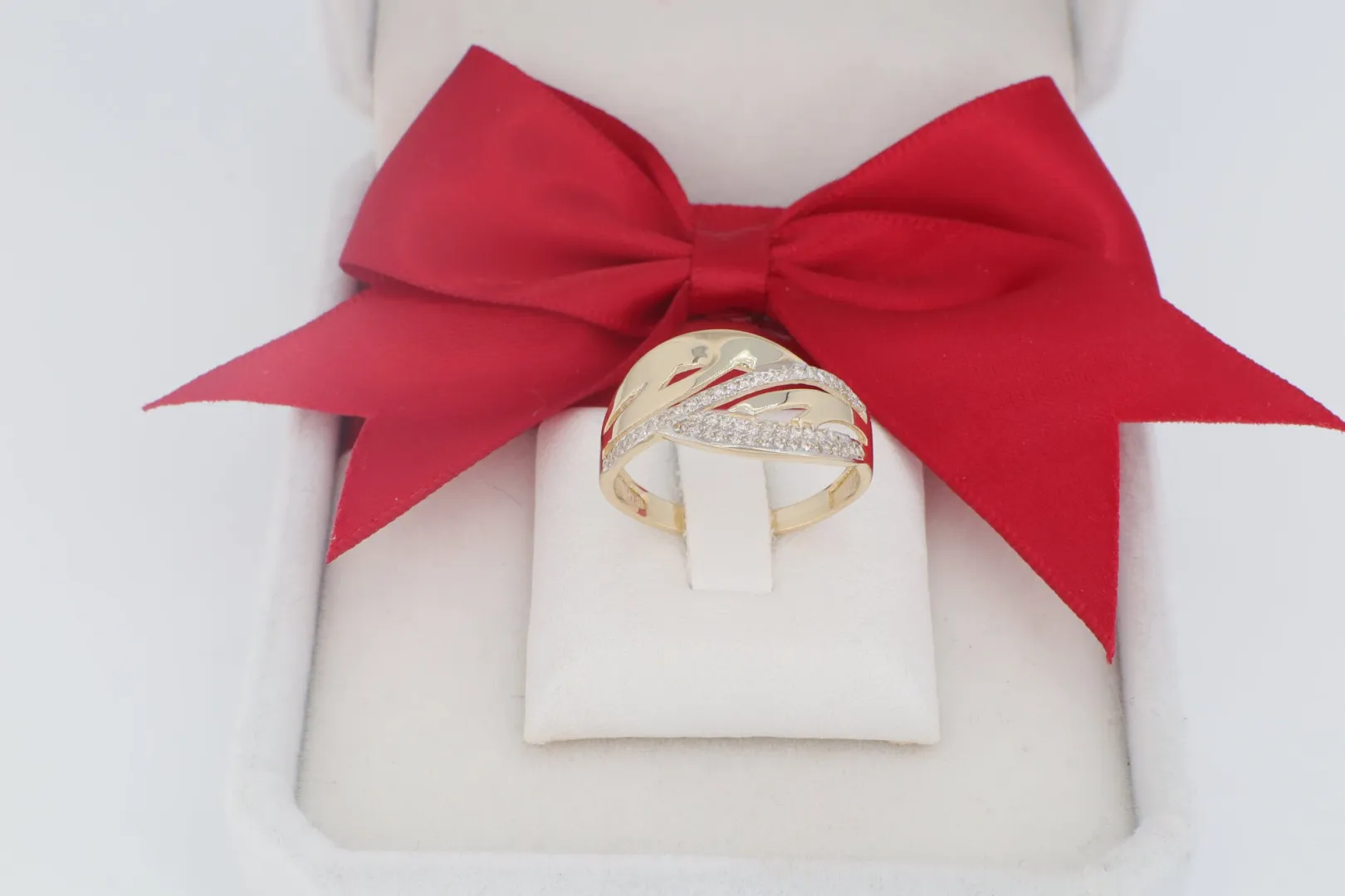 A gy1695-ös Női Arany Gyűrű (14 karátos) a modern elegancia és az organikus forma tökéletes ötvözete. A gyűrű feje egy domború, ívelt motívumot formáz, melyet két markánsan elkülönülő sávra osztottak. Az egyik sáv sima, magasan polírozott, tükörfényes aranyból készült, amely kiemeli az ékszer plasztikus vonalát. A másik, keskenyebb sávot apró, pave foglalatos cirkónia kövek borítják, biztosítva a fókuszált, szikrázó ragyogást. A design a mozgás és a kontraszt elegáns játékát kínálja.