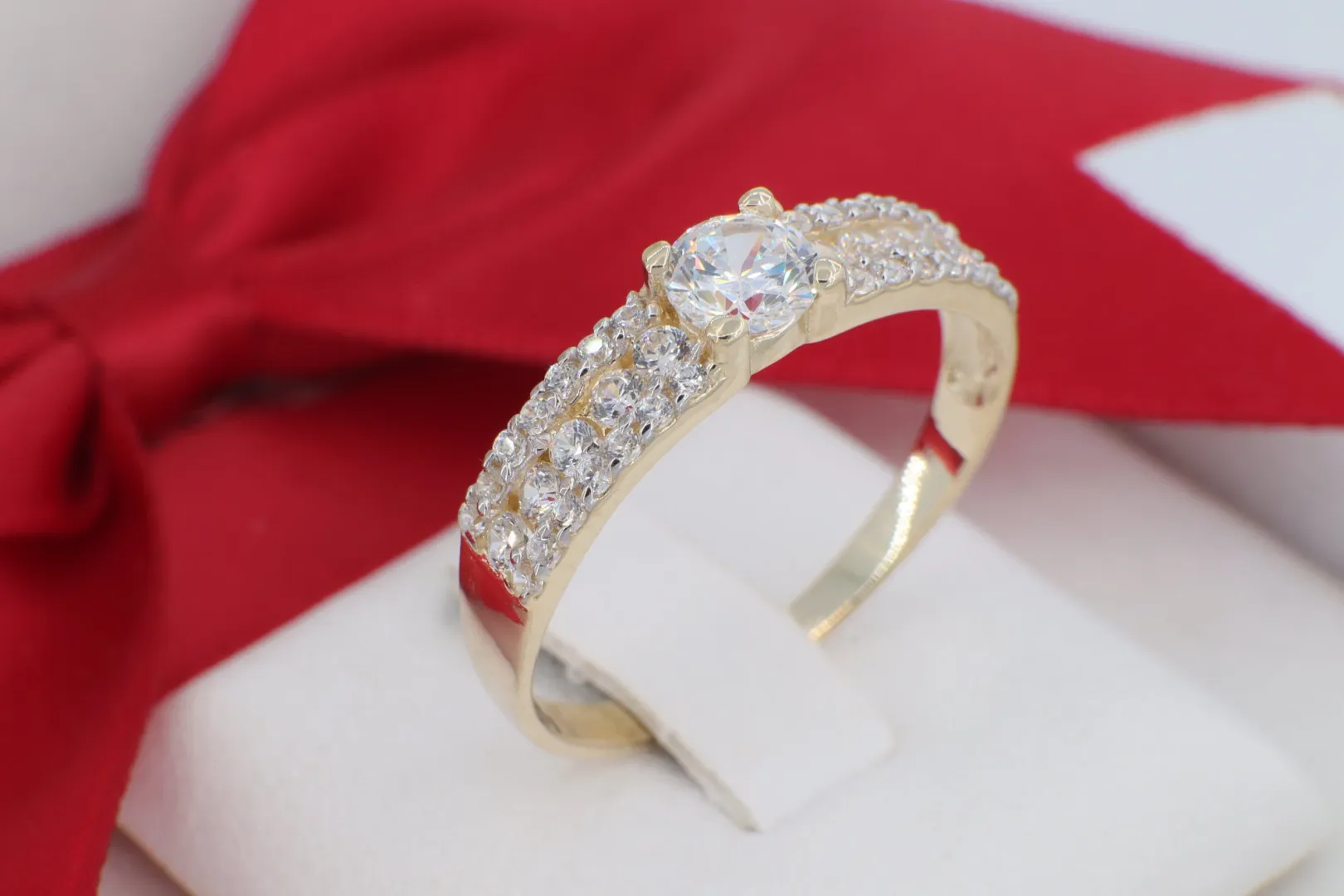 A GY2042-es sorszámú, 14 karátos arany gyűrű a luxus és a ragyogás legmagasabb szintjét képviseli. Ez a modell azoknak a hölgyeknek készült, akik szeretik a látványos, hangsúlyos ékszereket, amelyek minden mozdulatnál vonzzák a tekintetet. A gyűrű különlegessége a rendkívül gazdag díszítés: a központi, briliáns csiszolású követ a gyűrű sínjén elhelyezkedő, összesen három sorban futó cirkónia kősor egészíti ki, páratlan fényjátékot eredményezve.