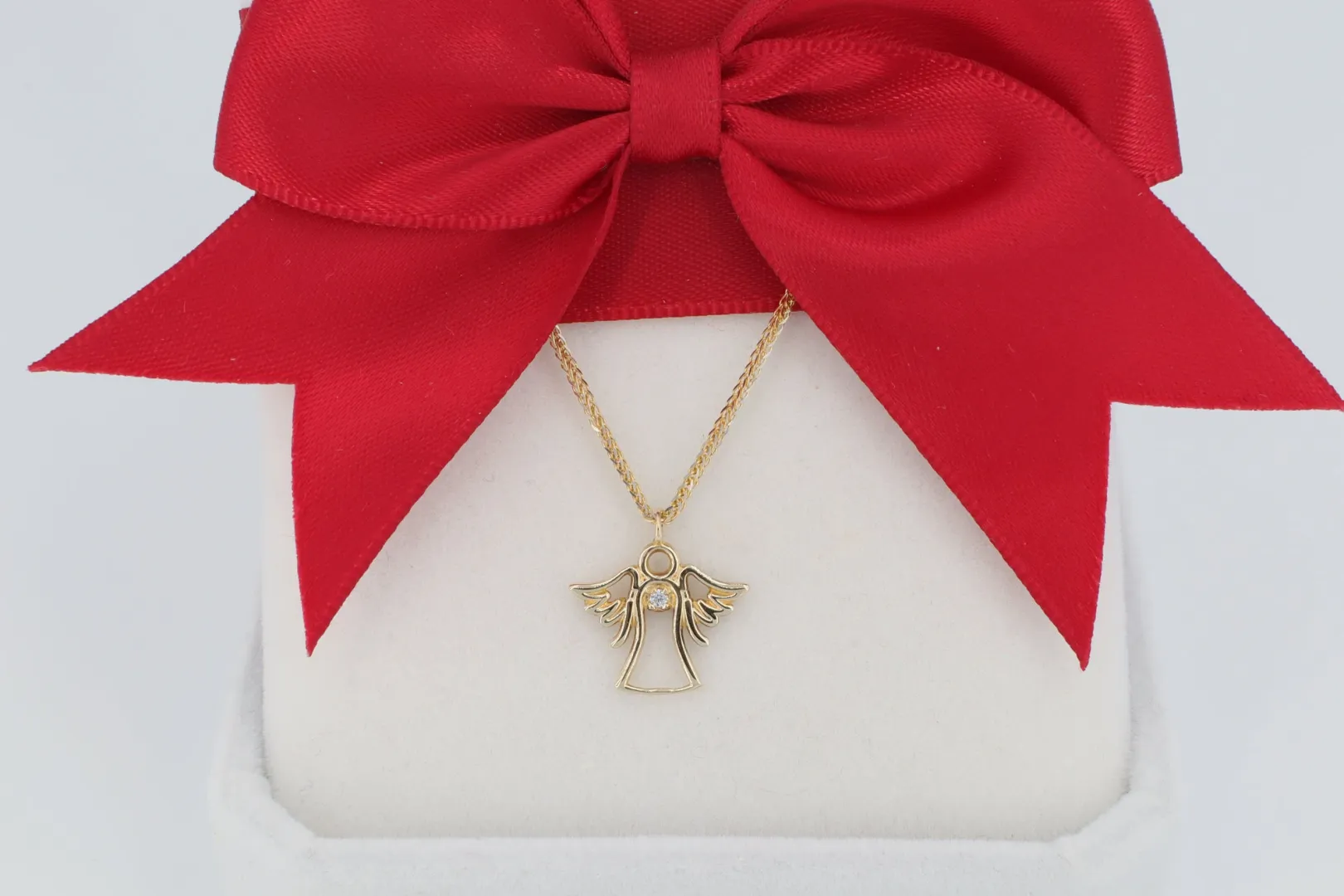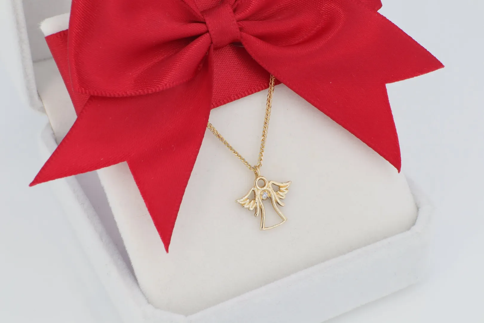 Készleten, várható szállítási idő: 2026.03.18. 14 karátos sárga arany nyaklánc, áttört anygyal medállal, egy csillogó cirkónia kővel