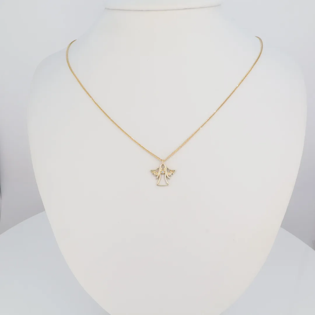 14 karátos sárga arany nyaklánc, áttört anygyal medállal, egy csillogó cirkónia kővel