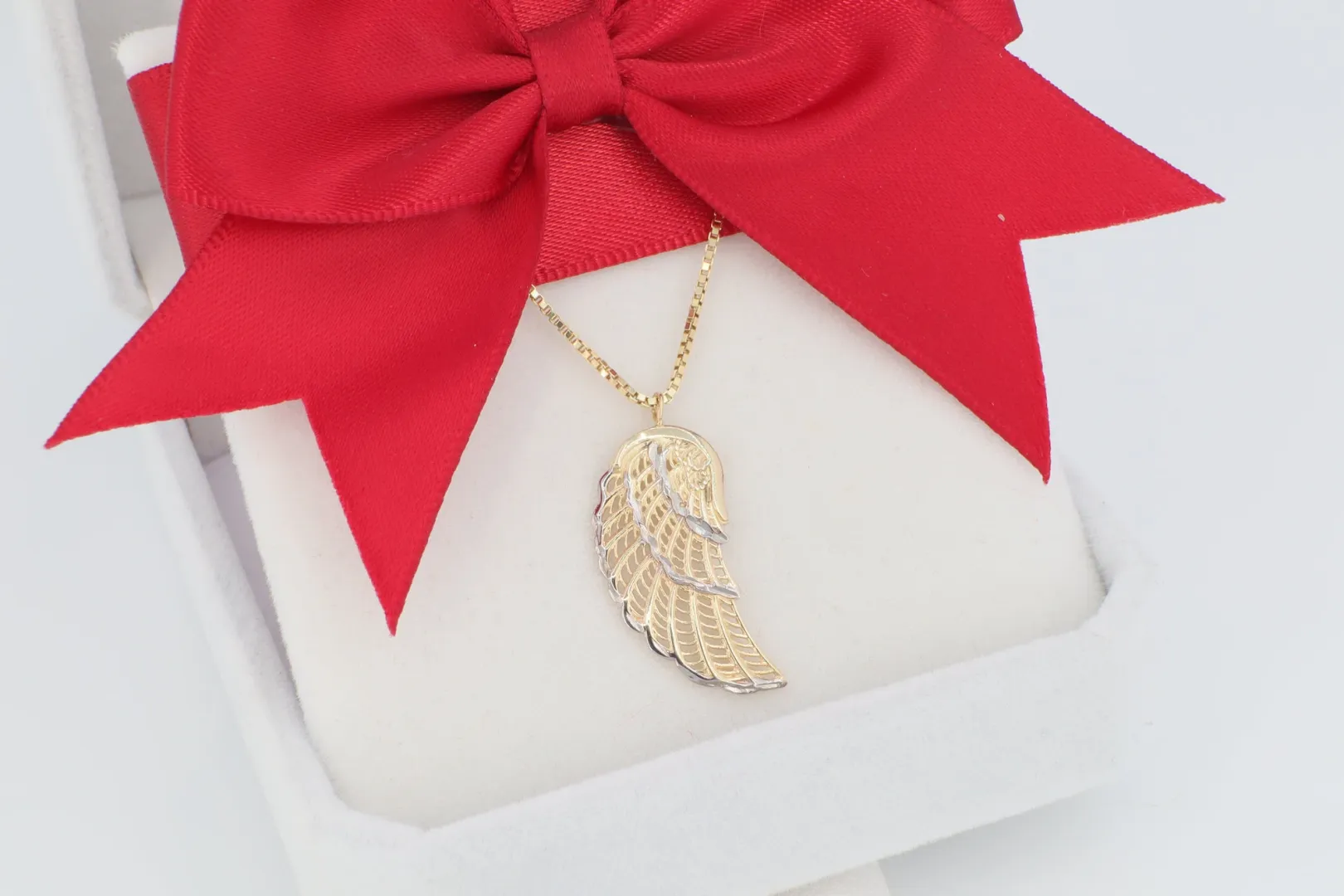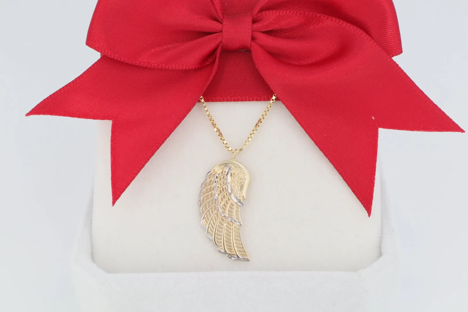 Ez a 14 karátos arany medál a védelem, a remény és az égi kapcsolódás mély szimbóluma. A medál egy gondosan kidolgozott angyalszárnyat ábrázol, melynek különlegessége a kétszínű arany (sárga és fehér arany) kombinációja, ami gazdag, texturált hatást kölcsönöz a tollazatnak. A sárga arany adja a szárny fő, meleg tónusát, míg a fehér arany szálak finoman kiemelik a tollazat egyes részeit, optikailag gazdagítva a motívumot. Ez az ékszer ideális azok számára, akik szeretik a szimbolikus, spirituális töltetű ékszereket és értékelik a különleges, kétszínű arany kivitelezést.