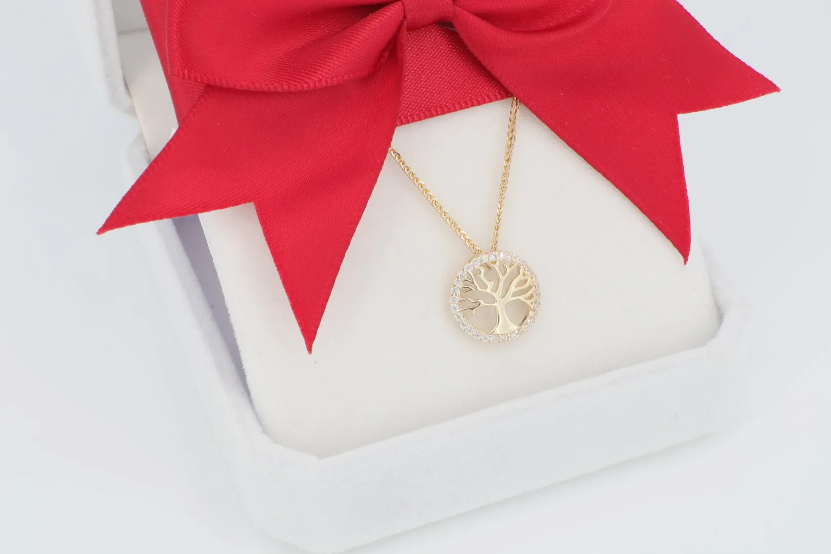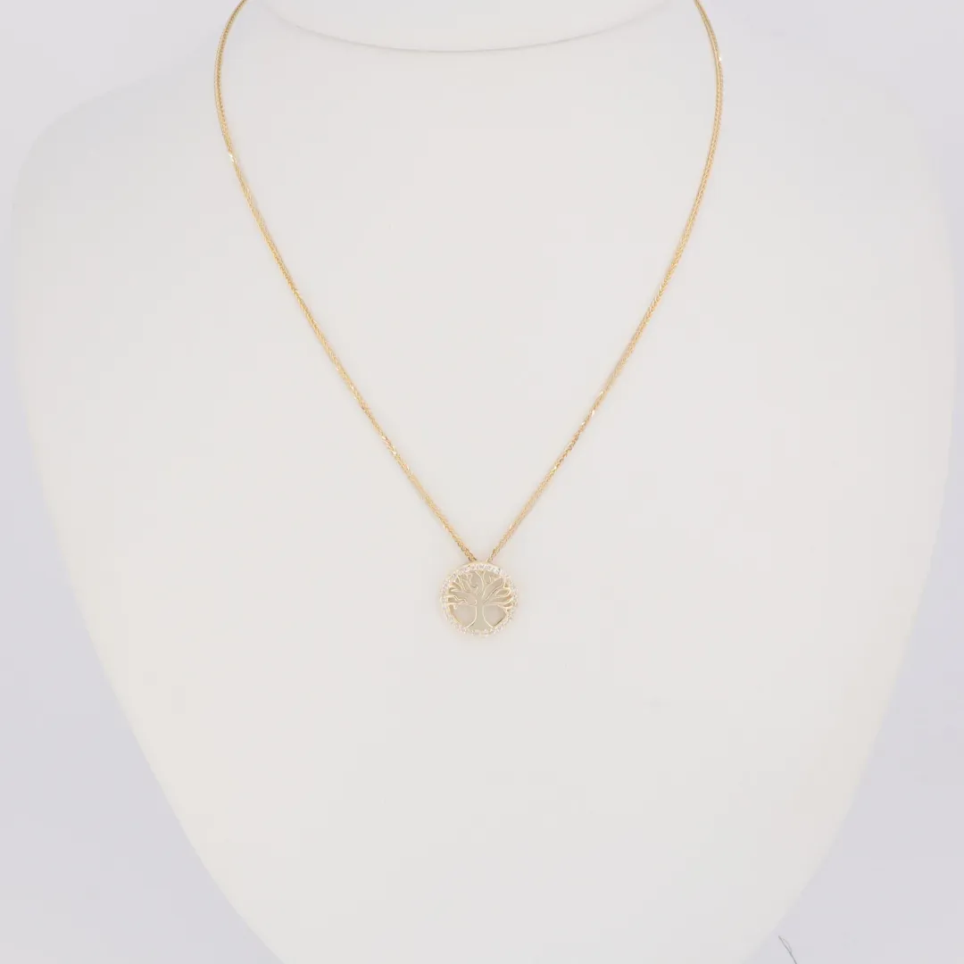 14 karátos sárga arany nyaklánc, klasszikus életfa medállal, körbe csillogó cirkónia kövekkel díszítve