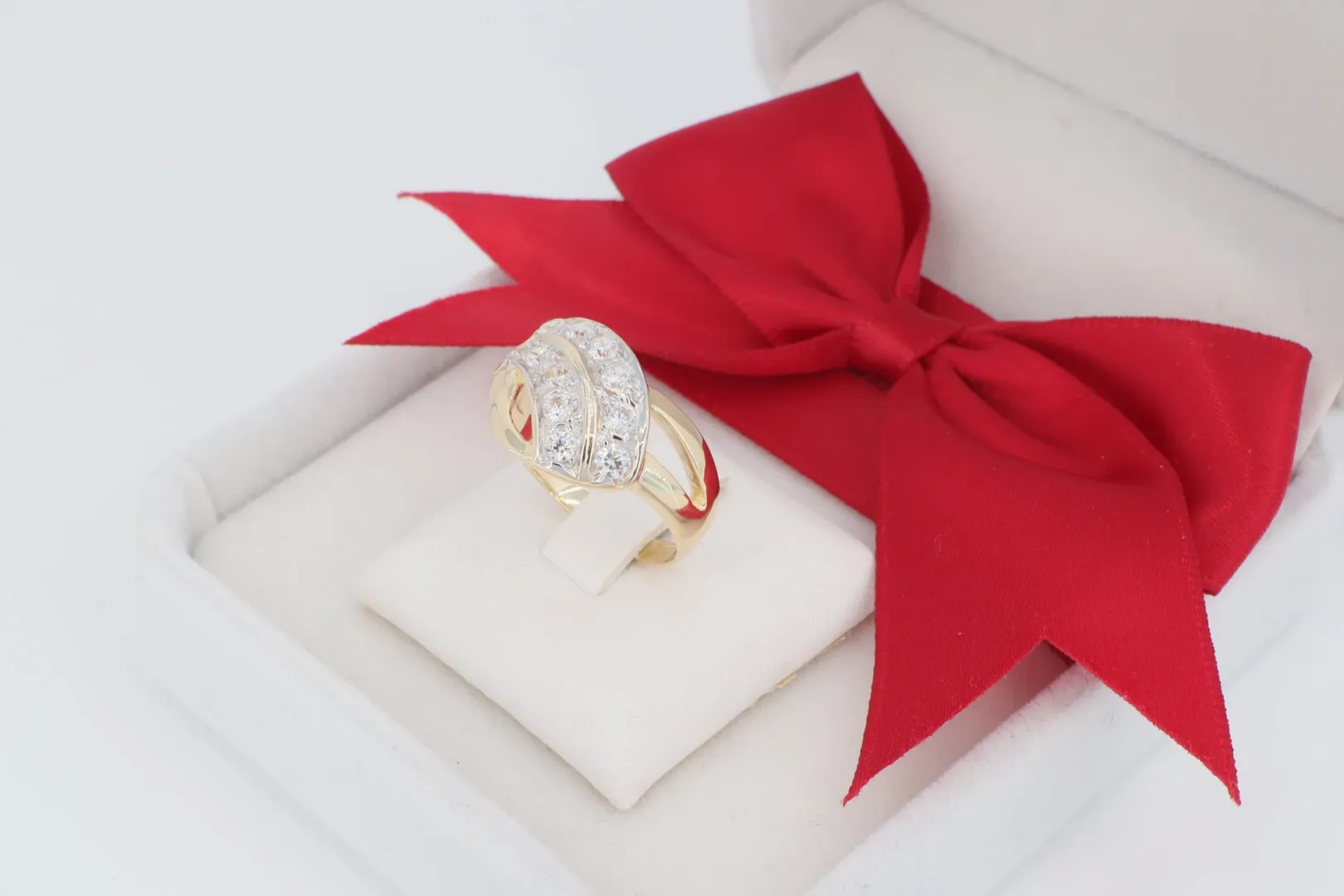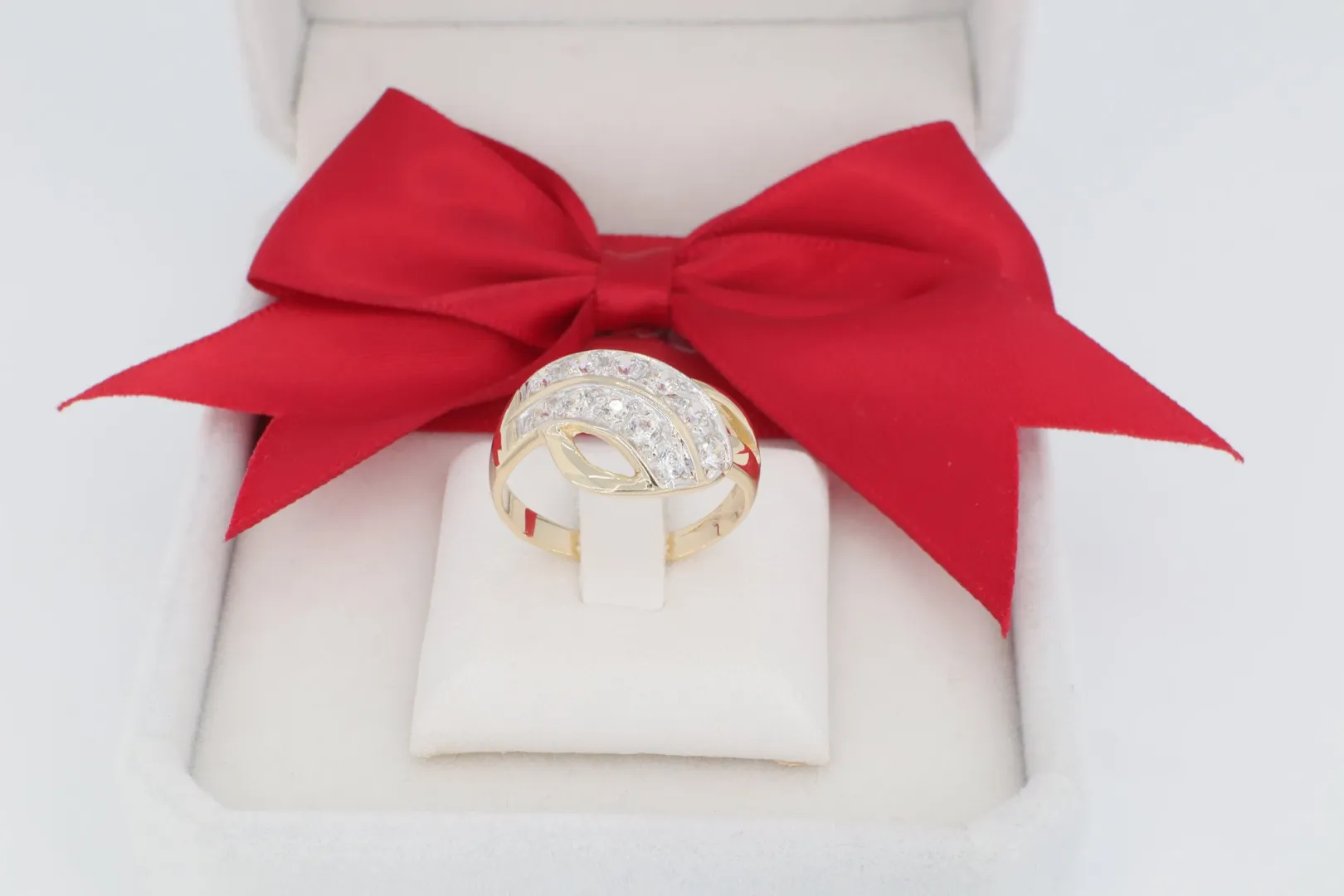 A GY0350 -14 karátos arany gyűrű a széles, látványos ékszerek kedvelőinek készült. A gyűrű feje masszív, ívelt sávokból áll, amelyek dinamikus mozgást és fényűző megjelenést kölcsönöznek a kéznek. Ez a design a hullámzás illúzióját kelti, melyet a ragyogó cirkónia sávok fokoznak.