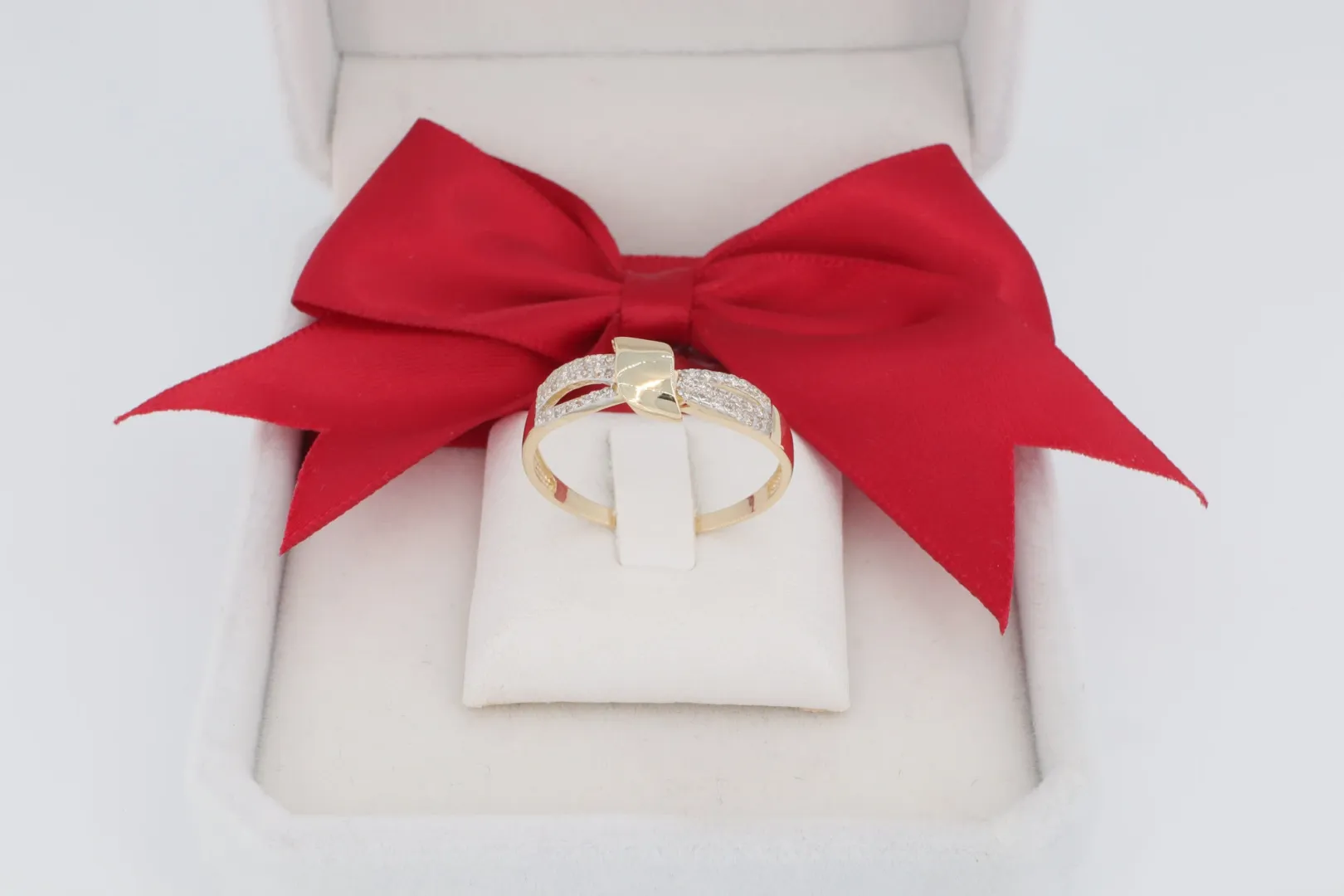 A forma egyik, hangsúlyos íve és a gyűrű sínjének felső része apró, sűrűn foglalt cirkónia kövekkel (pavé hatás) van kirakva. A kövek fehéren csillognak, ródiumozott (fehér arany hatású) foglalatban.