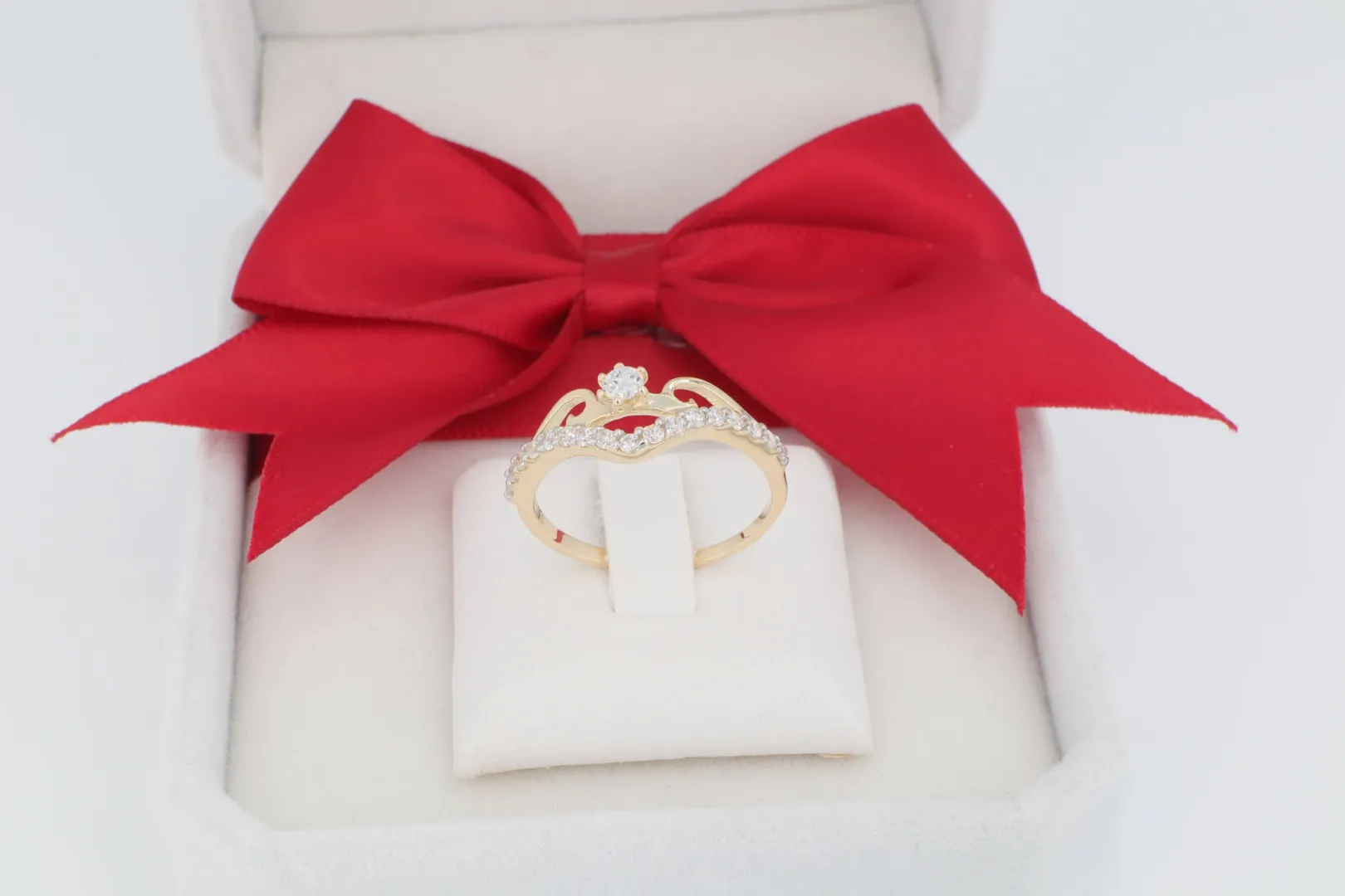 A GY1439 -14 karátos arany gyűrű a nőiesség, a romantika és a finom csillogás megtestesítője. Különleges, szív- vagy koronaszerű formája és az aprólékos kőberakás teszi ezt az ékszert ideális ajándékká, mellyel a szeretet és a megbecsülés kifejezhető. Ez a szív alakú arany gyűrű garantáltan felhívja magára a figyelmet.