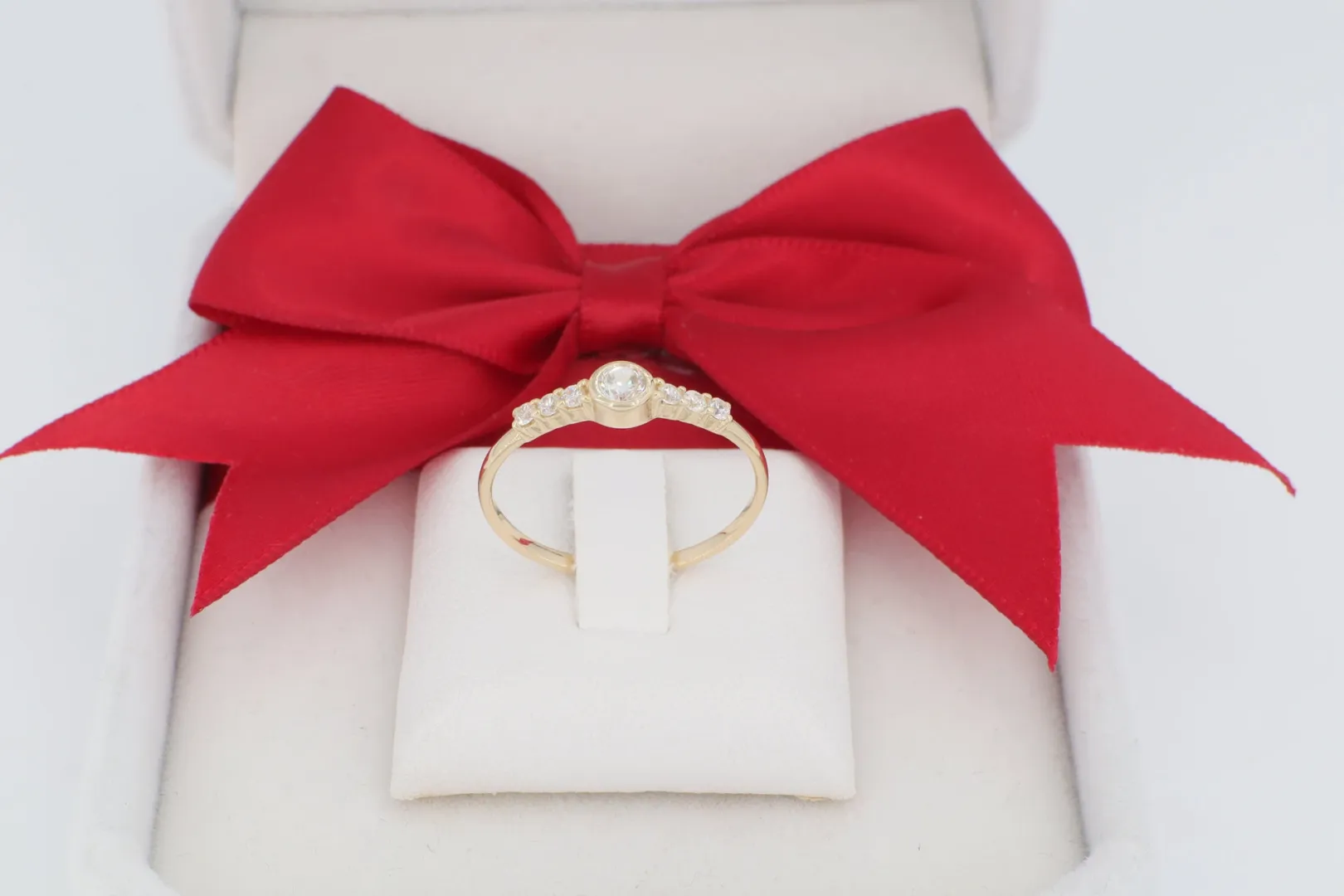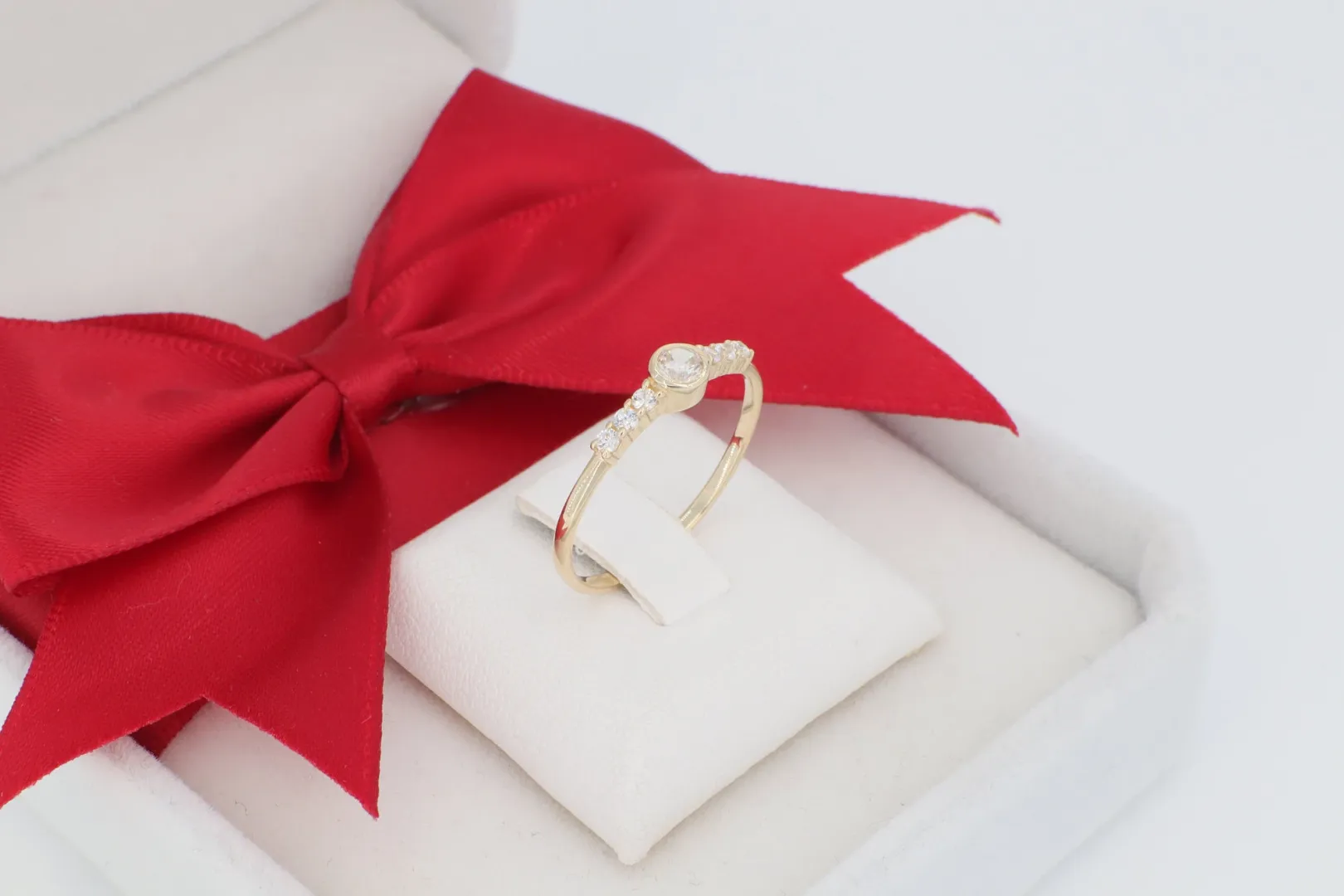 Központi Kövek: A gyűrű feje egy apró, de ragyogó cirkónia kőből és két-két kisebb kísérő kőből áll, amelyek elegánsan, egy sorban helyezkednek el a sín felső részén. Ez a köves arany gyűrű finom, de észrevehető ragyogást biztosít.