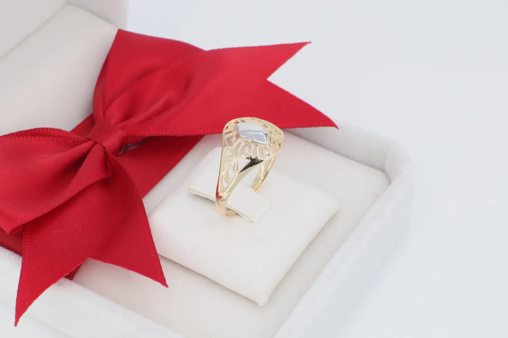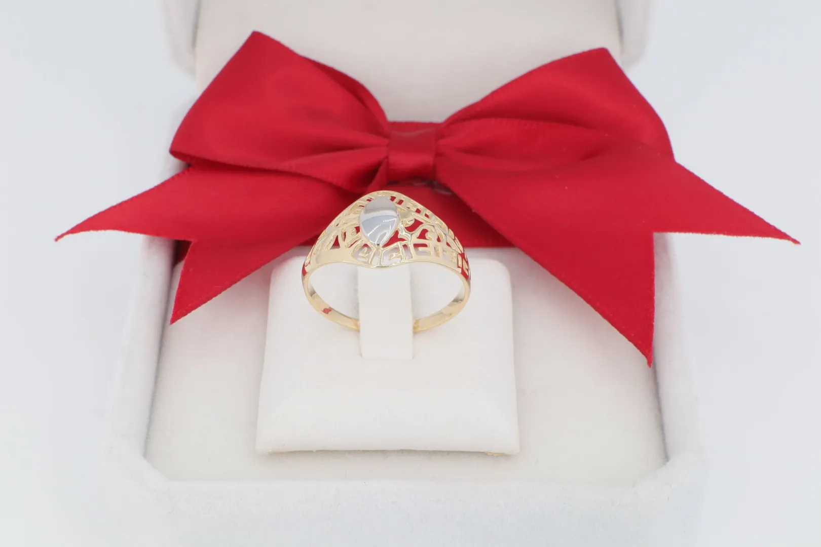 Finom Áttört Geometria: A mintázat egyedi, finoman kidolgozott, áttört rácsot alkot, amely könnyed és nőies megjelenést kölcsönöz a gyűrűnek.