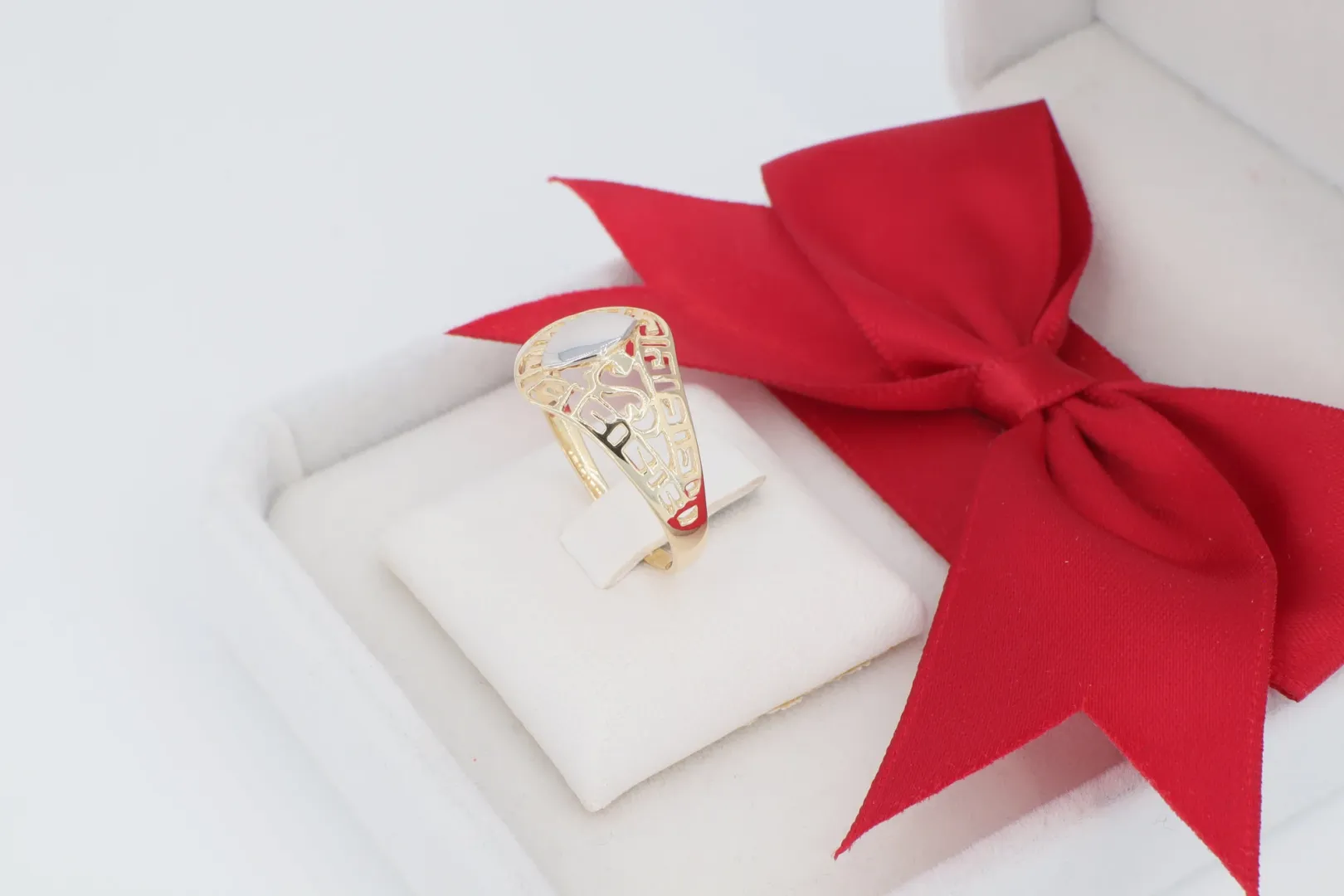 A GY0587 női arany gyűrű a finom elegancia és a letisztult, modern formatervezés kiváló példája. A gyűrű feje egy kecsesen megnyújtott, ovális alakú formát ölt, melyet egy aprólékosan kidolgozott, áttört geometriai minta tölt ki. A sárga arany vázat a motívum közepén elhelyezett, fehérarany hatású (ródiumozott) betét teszi különlegessé, ami a design fókuszpontjává válik, diszkrét kétszínű hatást kölcsönözve az ékszernek. Ez a könnyed, áttört arany gyűrű ideális a mindennapi elegancia megteremtéséhez.