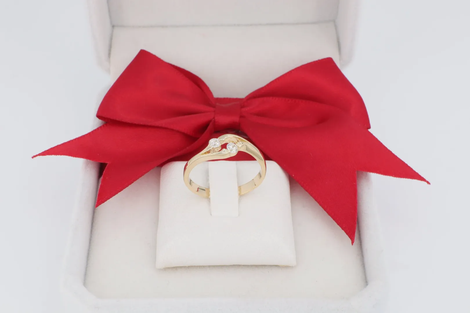 A két kő helyzete kiemeli az átlós elrendezést, eleganciát és modern csavart kölcsönözve a gyűrűnek.
