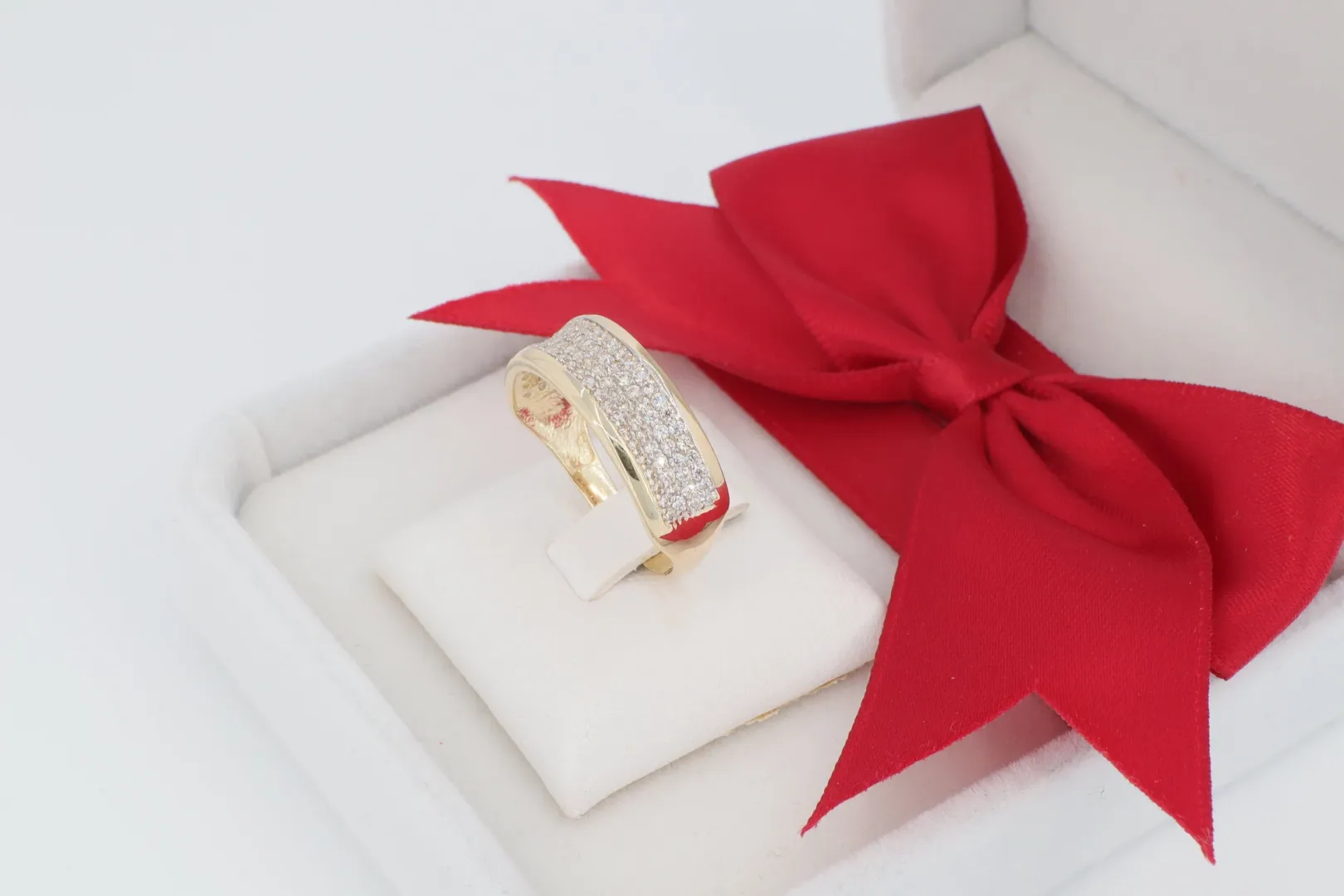 A GY1692 14 karátos arany gyűrű egy luxus megjelenésű, széles sávos ékszer, melynek teljes felületét beragyogó cirkónia kövek sora borítja. Ez a gyűrű egy igazi központi darab a kézen, ideális választás azoknak, akik a látványos, maximális csillogást biztosító ékszereket kedvelik.