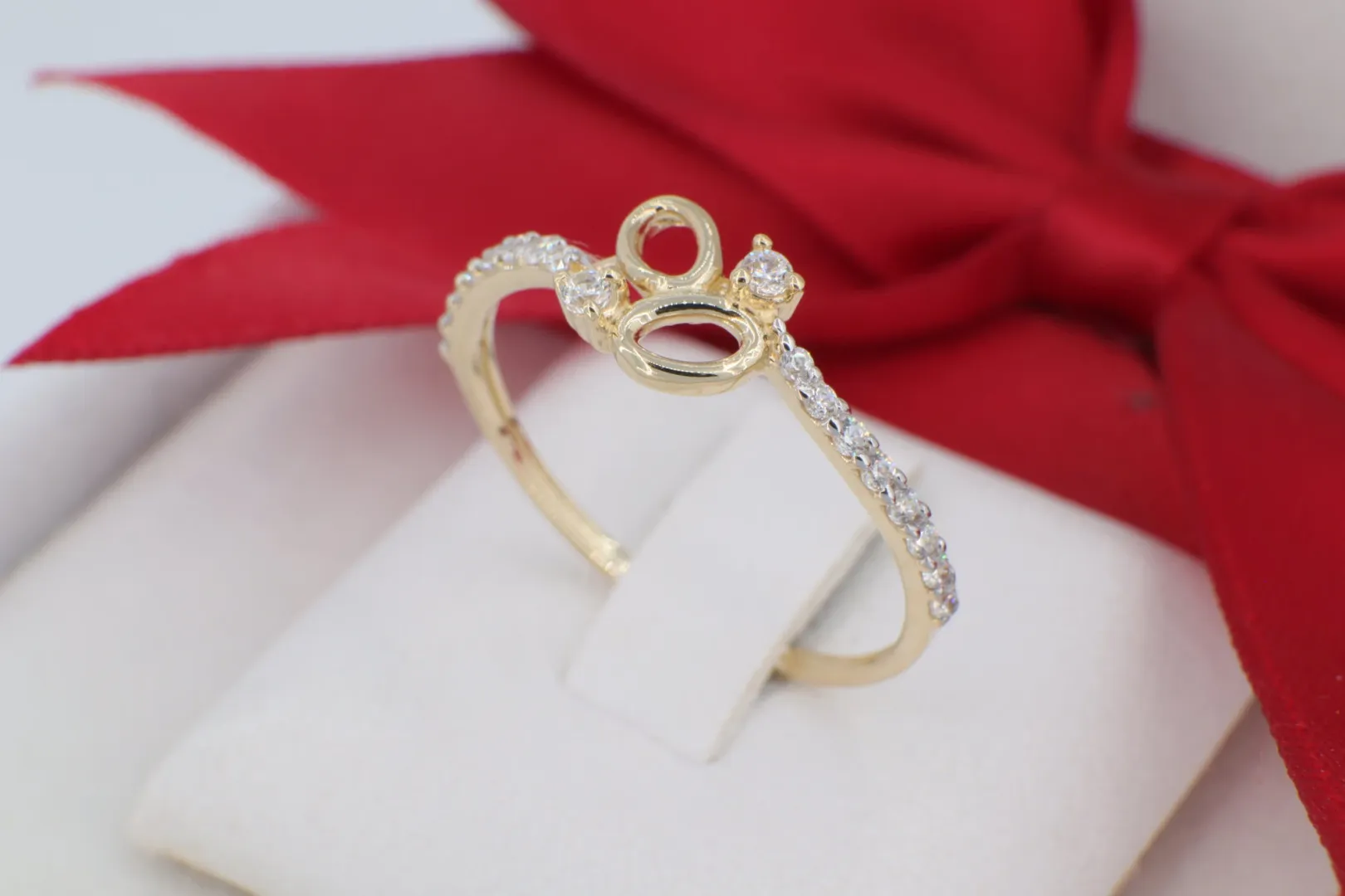 A gyűrű alapja hitelesített 14 karátos sárga arany (585‰ finomságú). A díszes fejrész és a kövezett ív fehér arany hatású ródium bevonatot kapott, amely felerősíti az apró cirkónia kövek fényét, és egy elegáns, kéttónusú luxusérzetet kölcsönöz a darabnak.