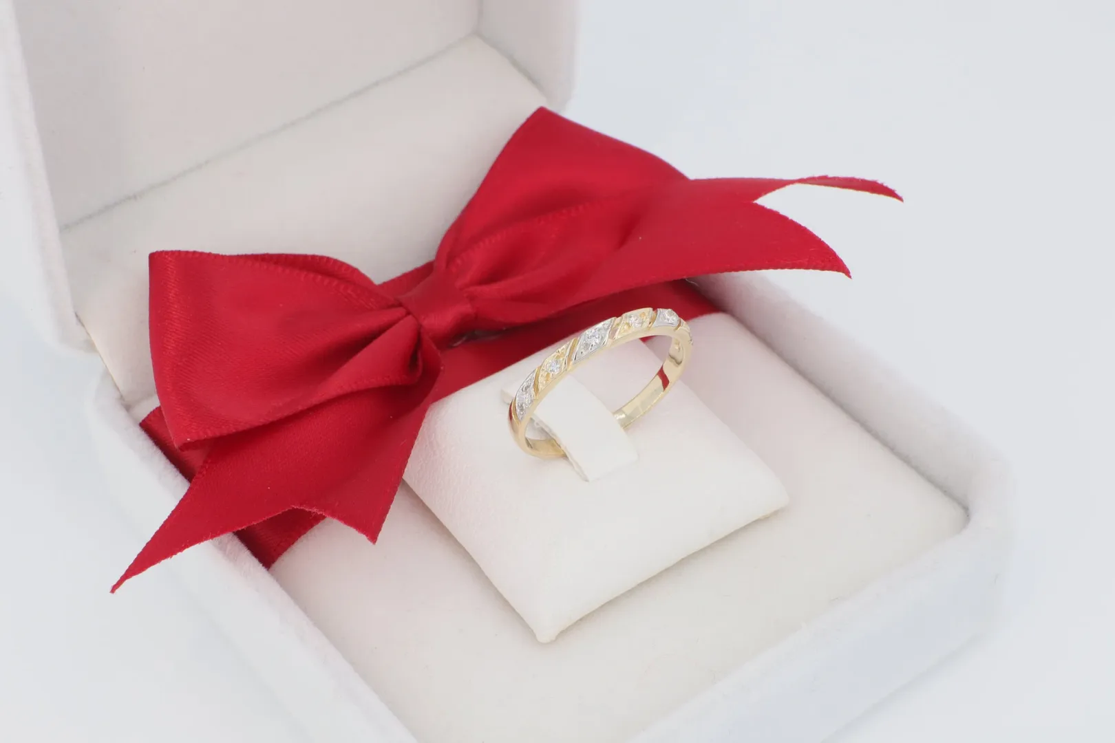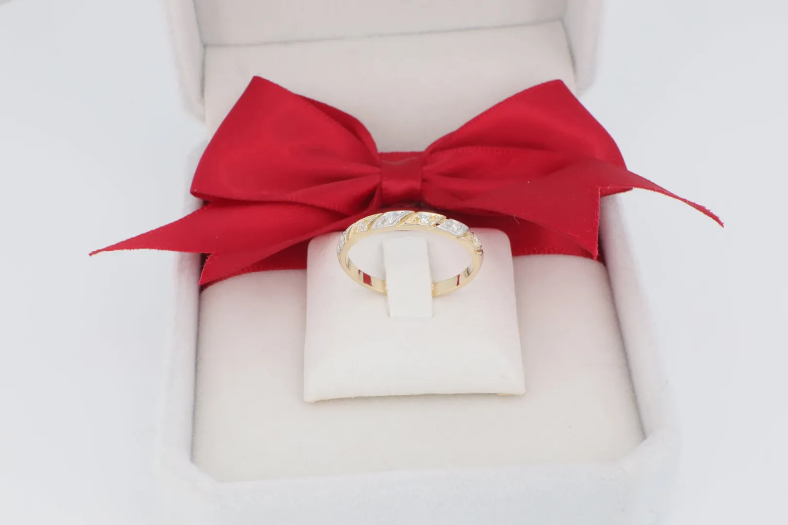 A gyűrű széles sínjének felső felületét ferdén, szakaszokban elhelyezett, ragyogó cirkónia kövek díszítik. A kövezett sávok között polírozott, sima arany sávok futnak, amelyek vizuálisan tagolják a felületet, és modern, geometrikus mintát adnak. Ez a ferde elrendezés dinamikus hatást kölcsönöz a gyűrűnek, és elegánsan vezeti a tekintetet.