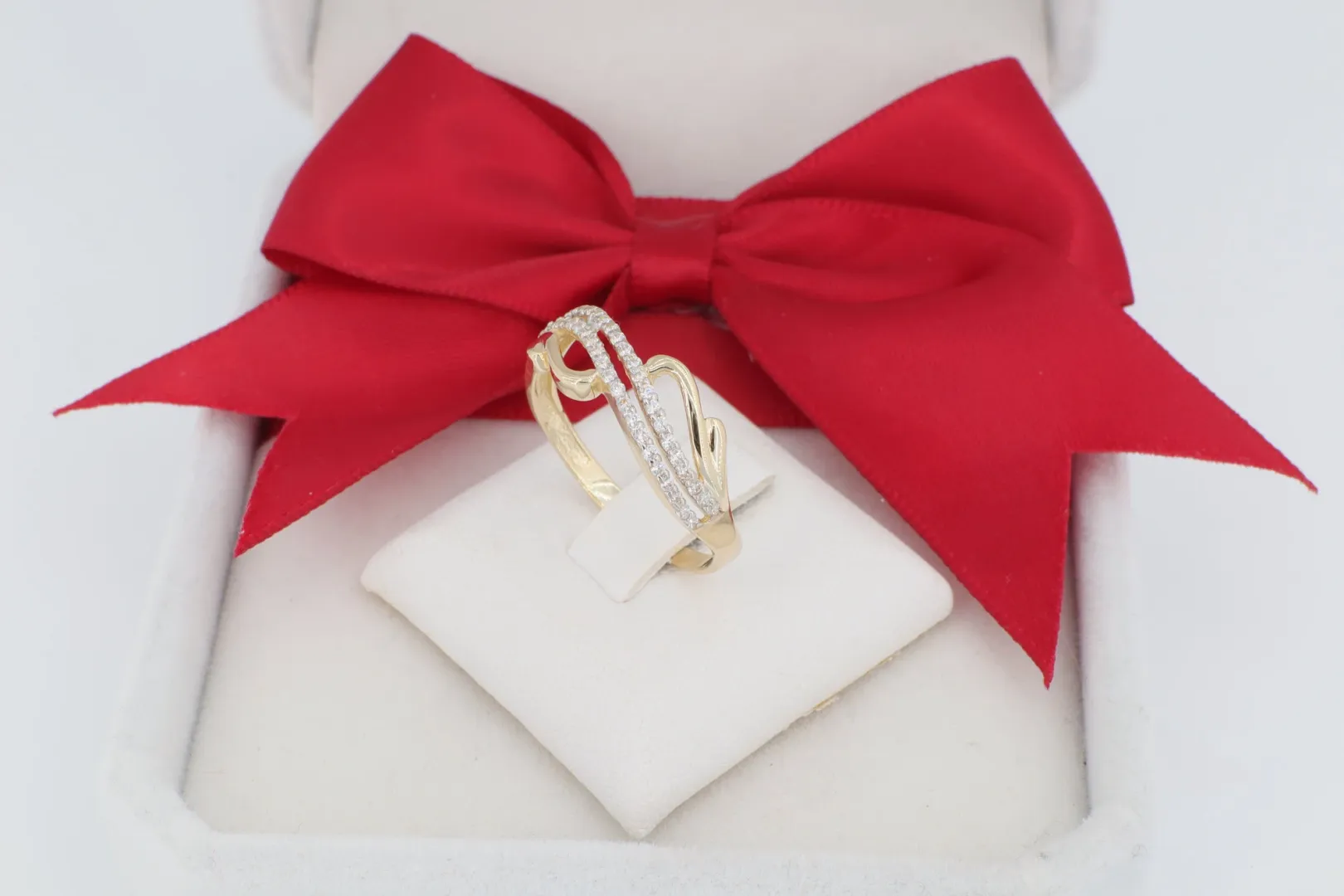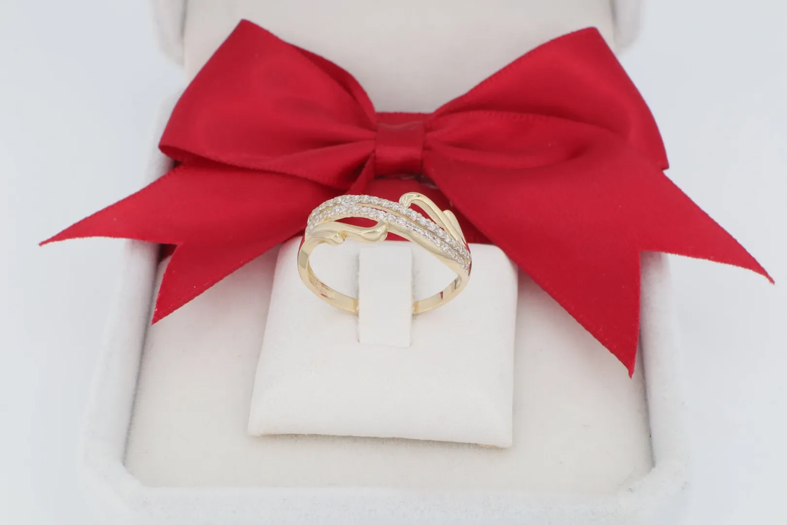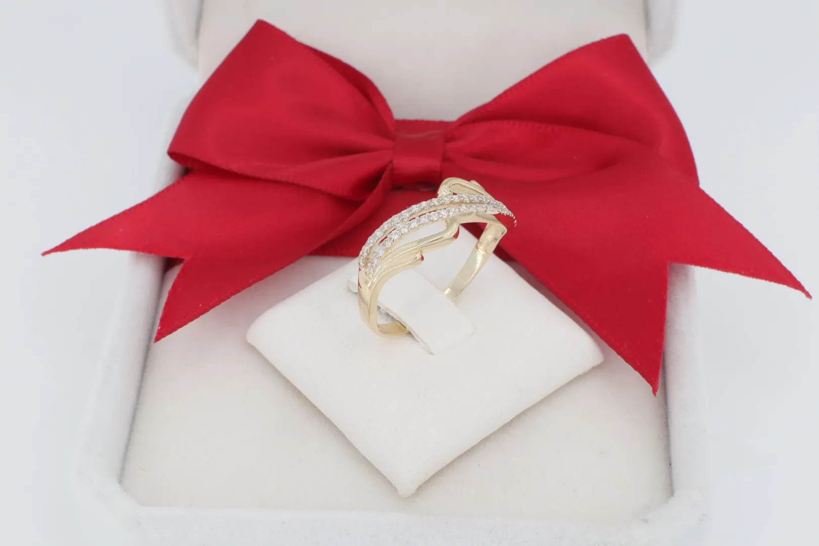 Ez a 14 karátos arany gyűrű a modern és feltűnő ékszerek kedvelőinek készült, amely a dinamikus vonalvezetést ötvözi a ragyogó kőberakással. A gyűrű feje egy organikus, áramló vagy hullámzó design, amelyet több sáv alkot, amelyek kecsesen keresztezik egymást.