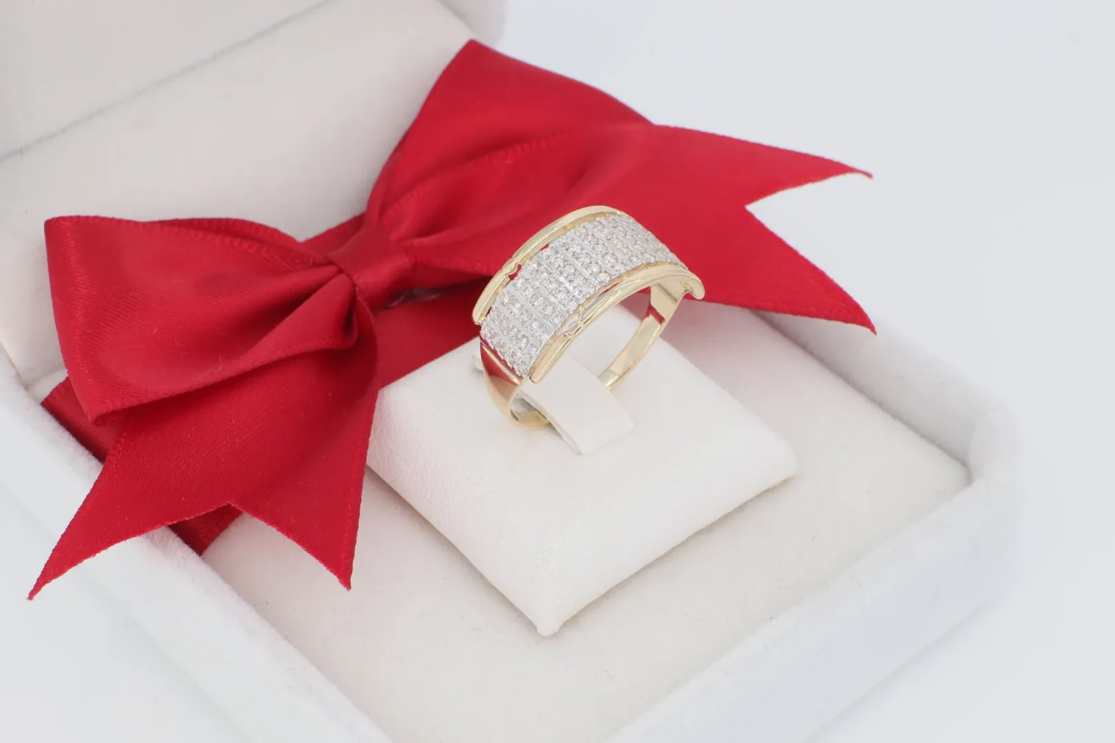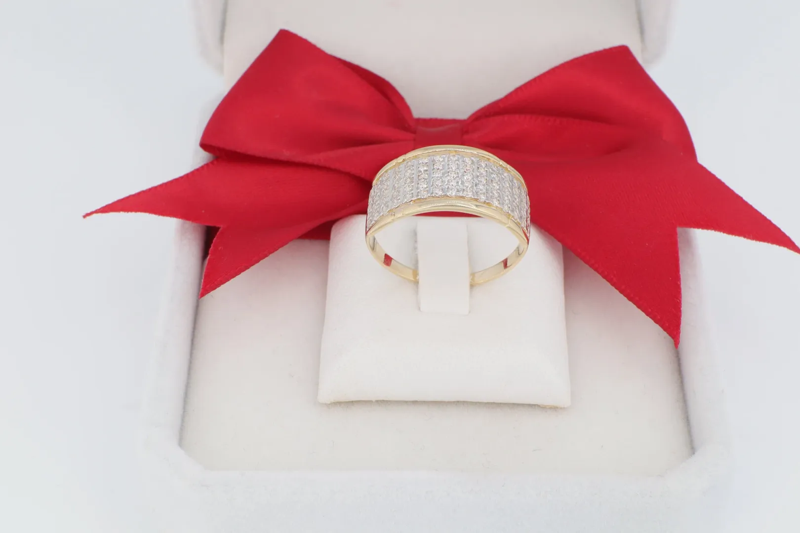Ez a különleges, 14 karátos sárga aranyból készült női gyűrű a klasszikus elegancia és a modern fényűzés tökéletes harmóniáját képviseli. A gyűrű széles sávját aprólékosan elhelyezett, csillogó cirkónia kövek díszítik, melyek minden mozdulatnál káprázatosan megtörik a fényt.