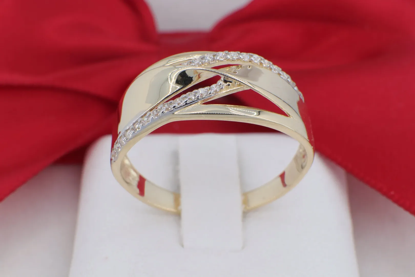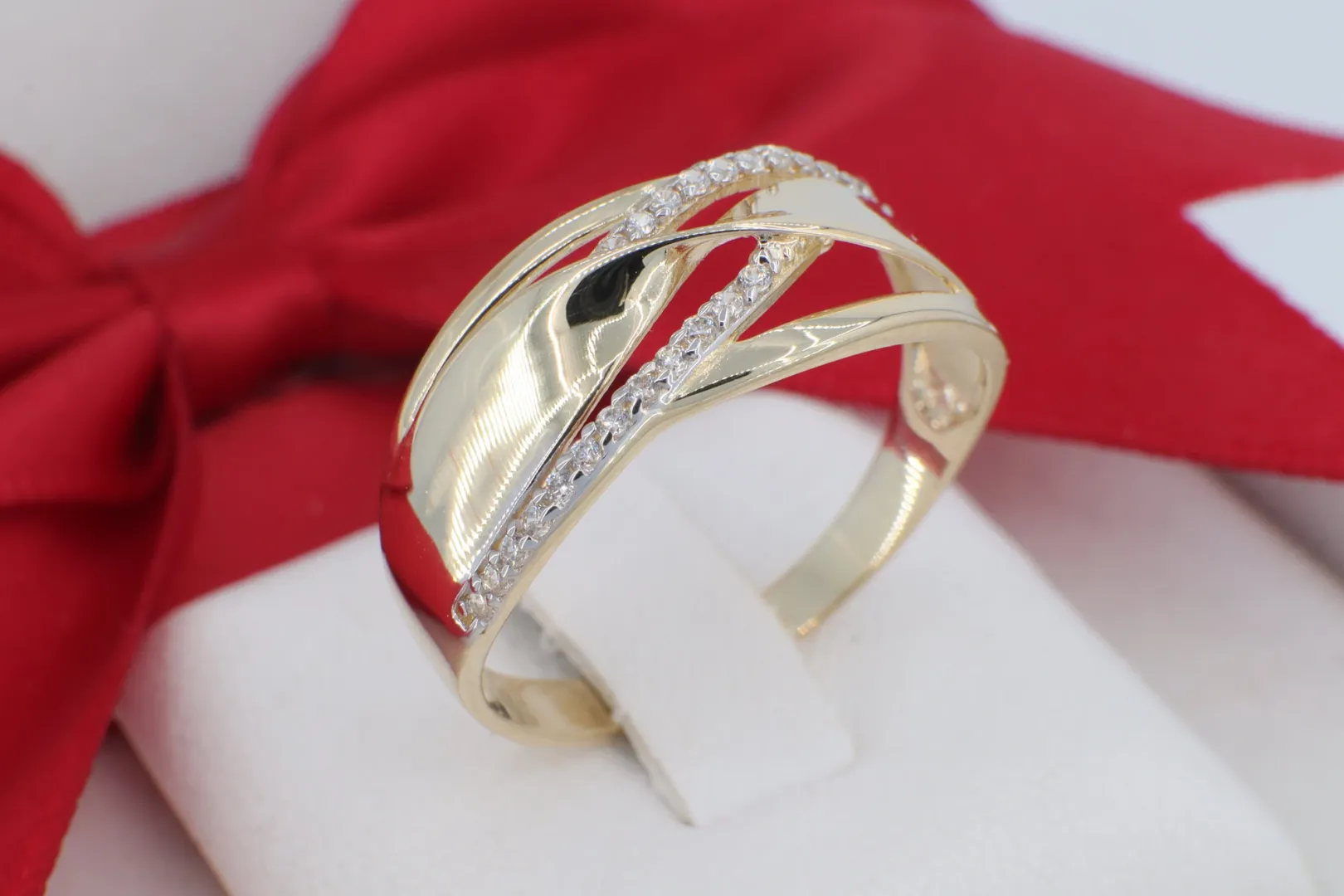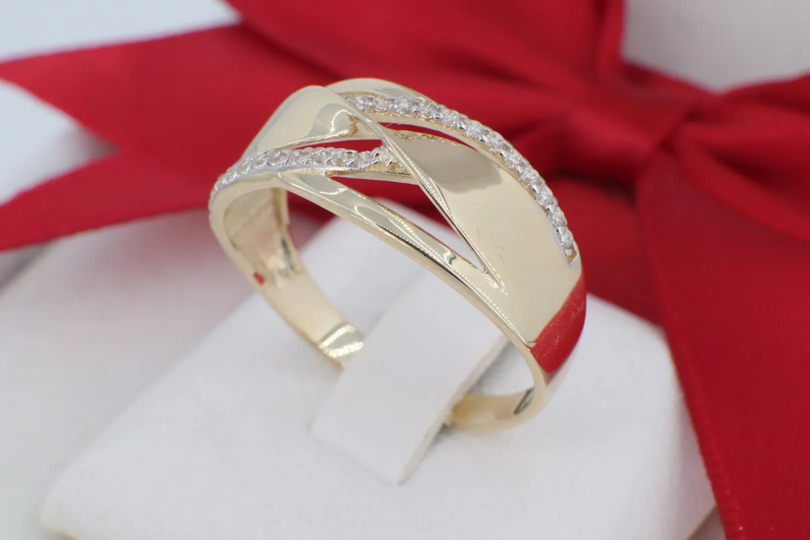 A GY1684-es kódszámú, 14 karátos arany gyűrű a modern aszimmetria és a klasszikus csillogás lenyűgöző ötvözete. Az ékszer fejrészét elegáns, egymást keresztező arany ívek alkotják, amelyek dinamikus és könnyed megjelenést kölcsönöznek a darabnak. Az egyik íven végigfutó, precízen foglalt cirkónia kősor ragyogó kontrasztot alkot a szélesebb, magasfényűre polírozott arany felületekkel. Ez a gyűrű tökéletes választás azoknak, akik egy modern, karakteres, mégis nőiesen finom ékszert keresnek a mindennapokra vagy különleges alkalmakra.