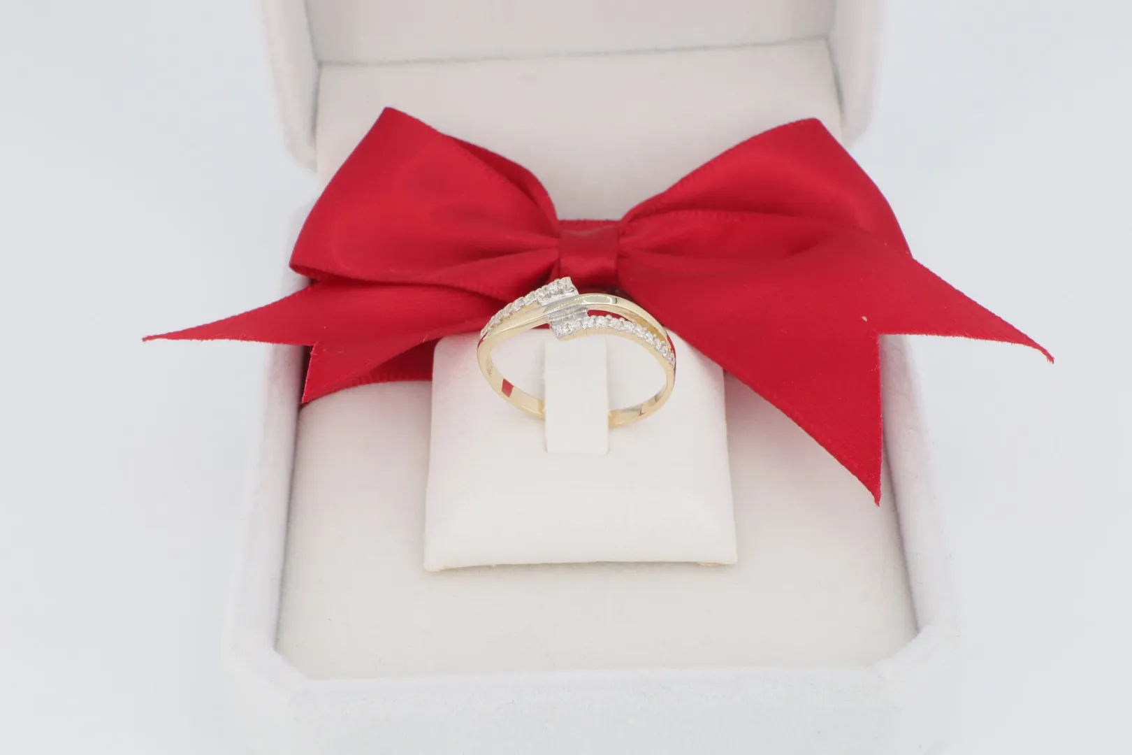 A GY1203 -14 karátos arany gyűrű a modern és dinamikus ékszertervezés kiváló példája. Kialakítása két, egymást áramlóan keresztező, ívelt sávra épül, melyek egy karakteres, enyhén cikcakkos formát hoznak létre a gyűrű fejezetén.