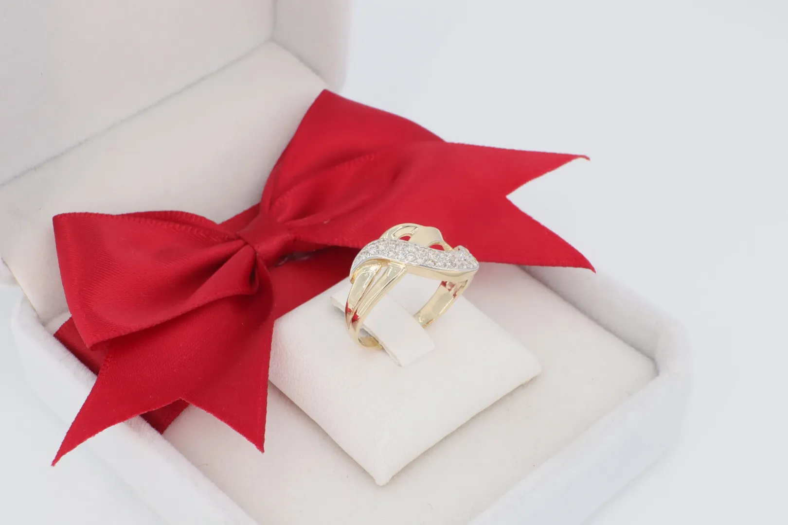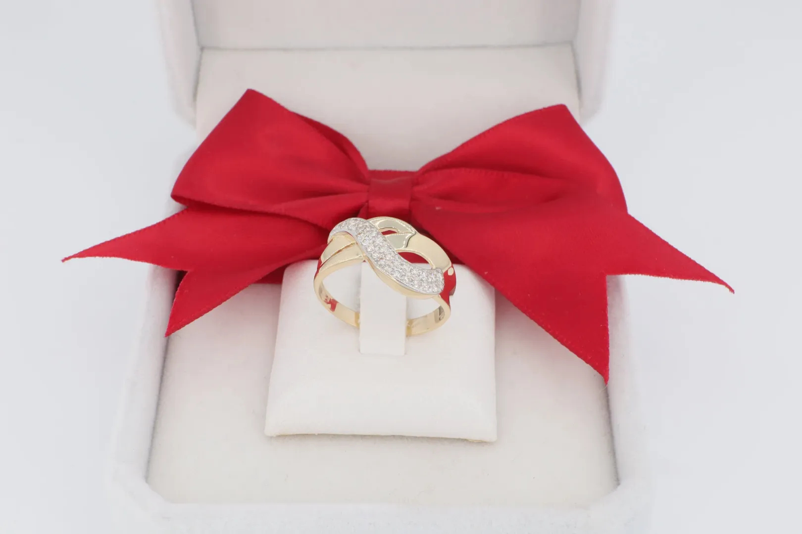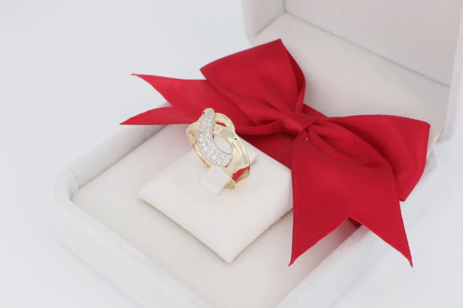 Keresztezett Design: A gyűrű feje két ívelt sávból áll, melyek kecsesen átfedik egymást. Ez a dinamikus forma optikai mélységet ad az ékszernek.