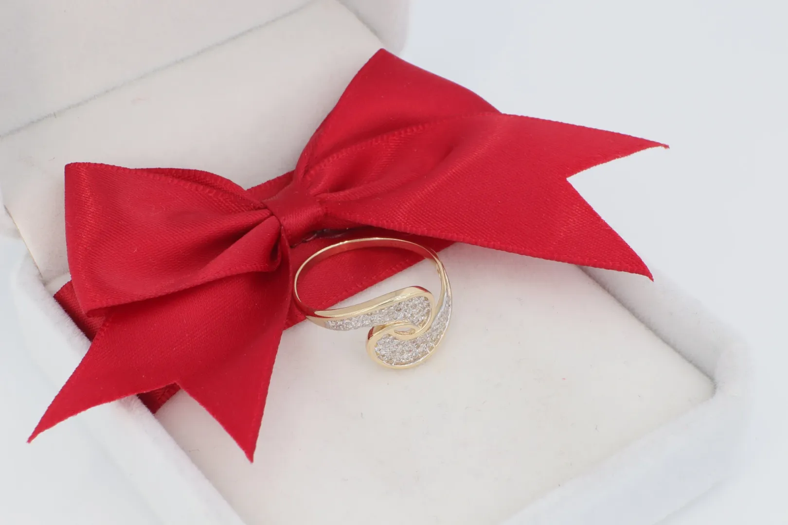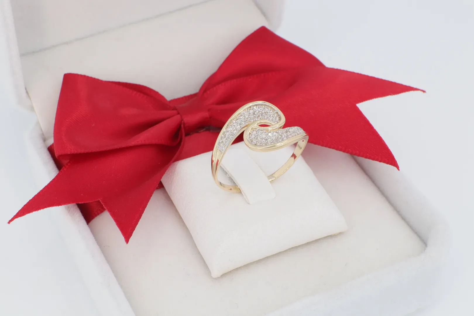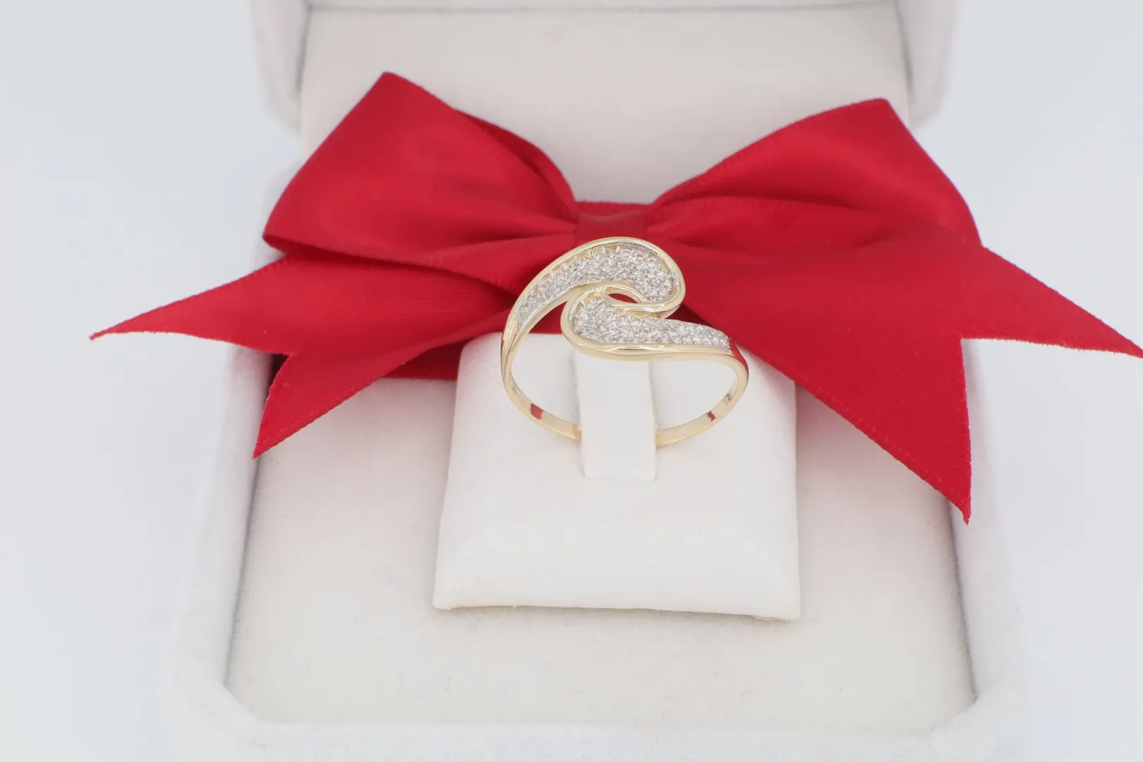 Dinamikus Forma: Az íves, folyékony hullám forma egyszerre modern és időtálló, egyedi megjelenést biztosít viselőjének. A sárga arany meleg fénye gyönyörűen érvényesül a kövek fehér csillogása mellett.