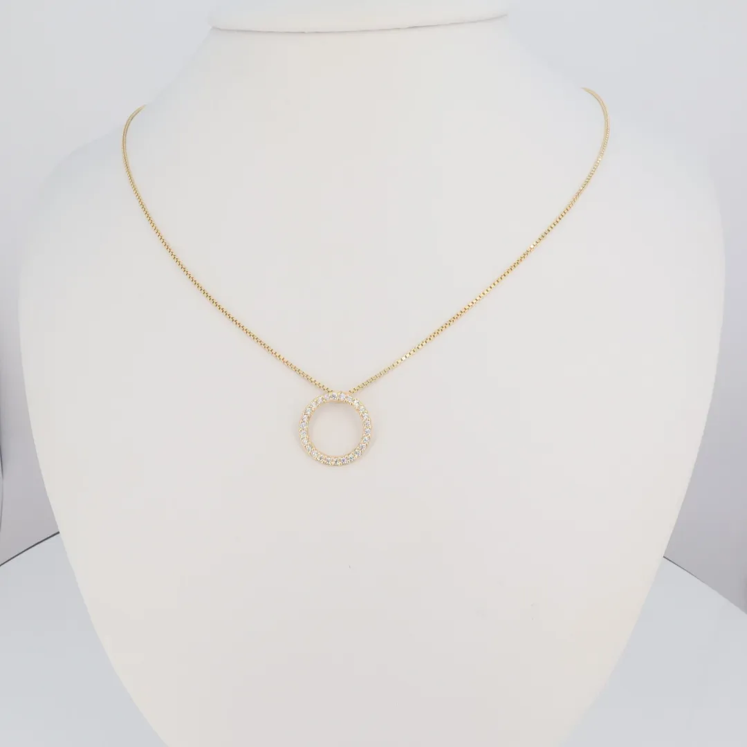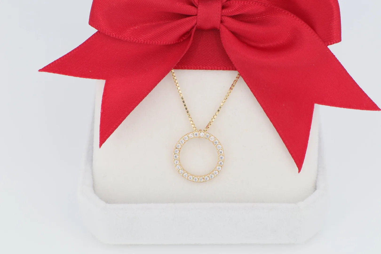 Készleten, várható szállítási idő: 2026.03.18. 14 karátos sárga arany nyaklánc, divatos kerek medállal, körbe csillogó cirkónia kövekkel díszítve