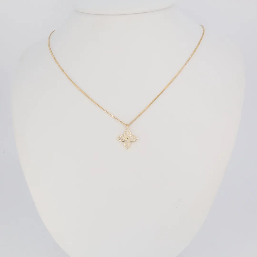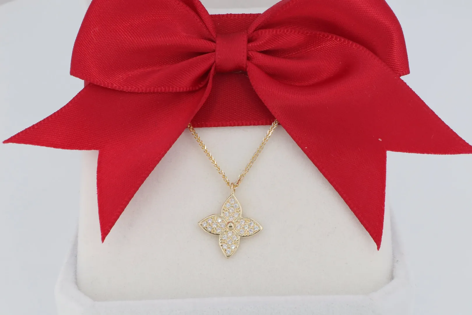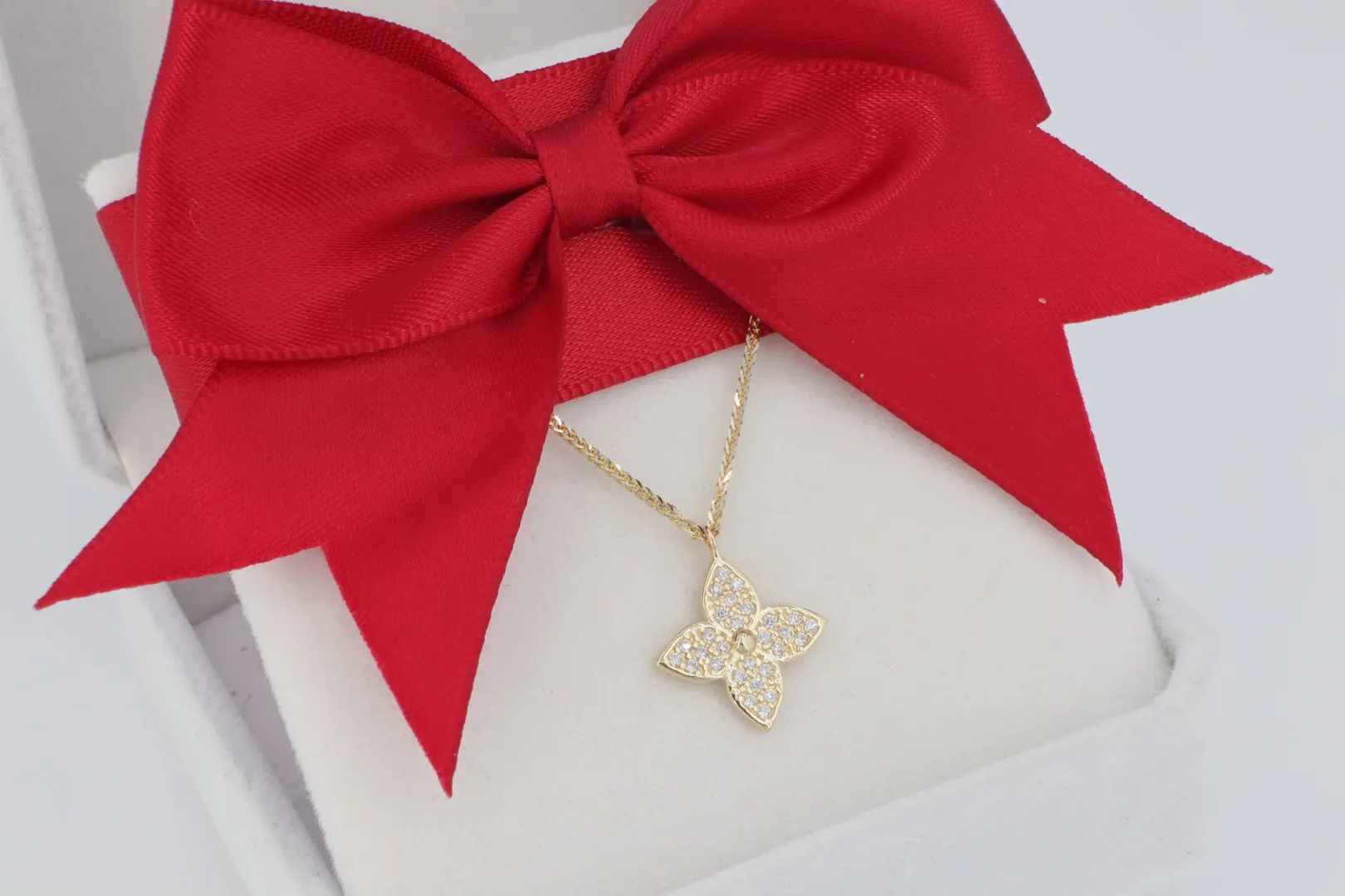 Ez a 14 karátos arany nyaklánc a természet és a finom elegancia elbűvölő kombinációja. A medál egy stilizált, négyszirmú virág vagy lóhere motívumot ábrázol, amelynek minden szirma különállóan, briliáns csiszolású cirkónia kövekkel van kirakva. A szirmok a középpontból indulnak ki, és finoman íveltek, maximalizálva a kövek által visszavert fény mennyiségét. Ez a design gazdag, mégis finom csillogást biztosít, és ideális választás azoknak, akik a nőies, szimbolikus ékszereket kedvelik.