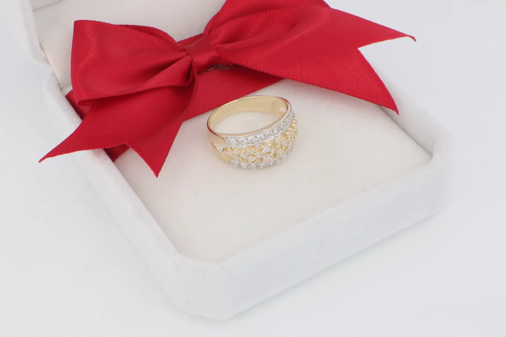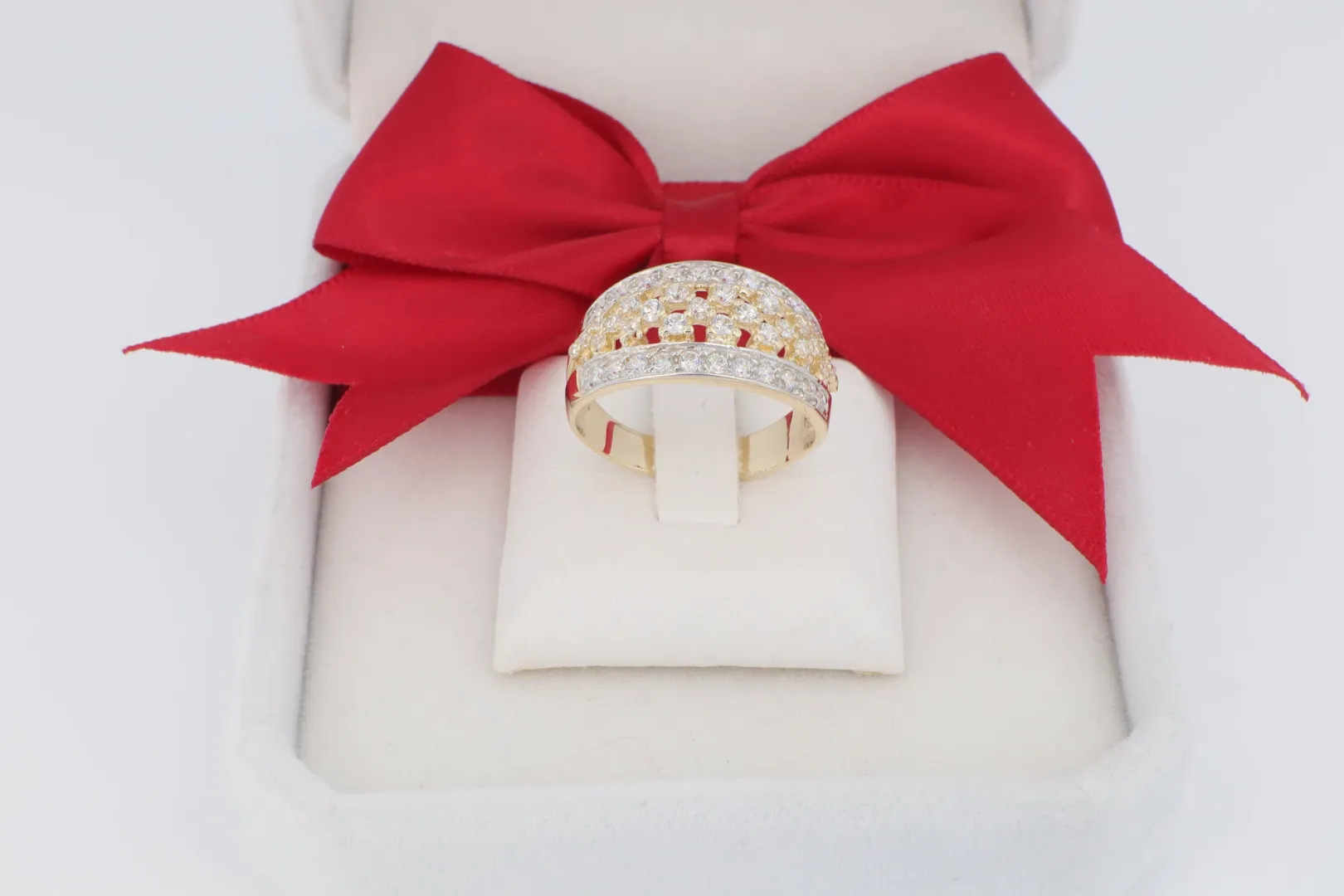 A GY0053 gyűrű az arany klasszikus erejét és a cirkóniák modern csillogását ötvözi egyetlen, lenyűgöző darabban.