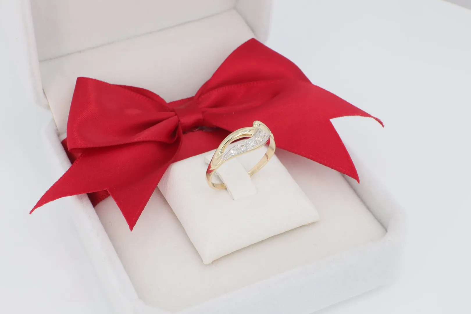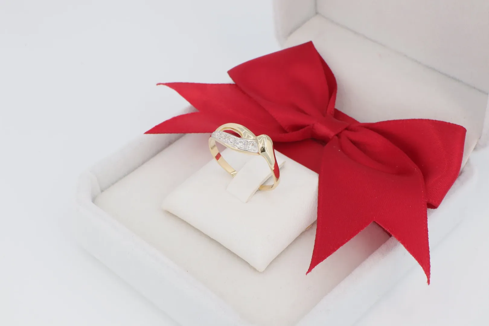 Kéttónusú Részletek: A gyűrű fő anyaga a meleg sárga arany, míg a köves berakás feletti felület fehér arany hatású (ródium bevonattal) van kiemelve. Ez a kontraszt eleganciát ad, és kiemeli a kövek tisztaságát.
