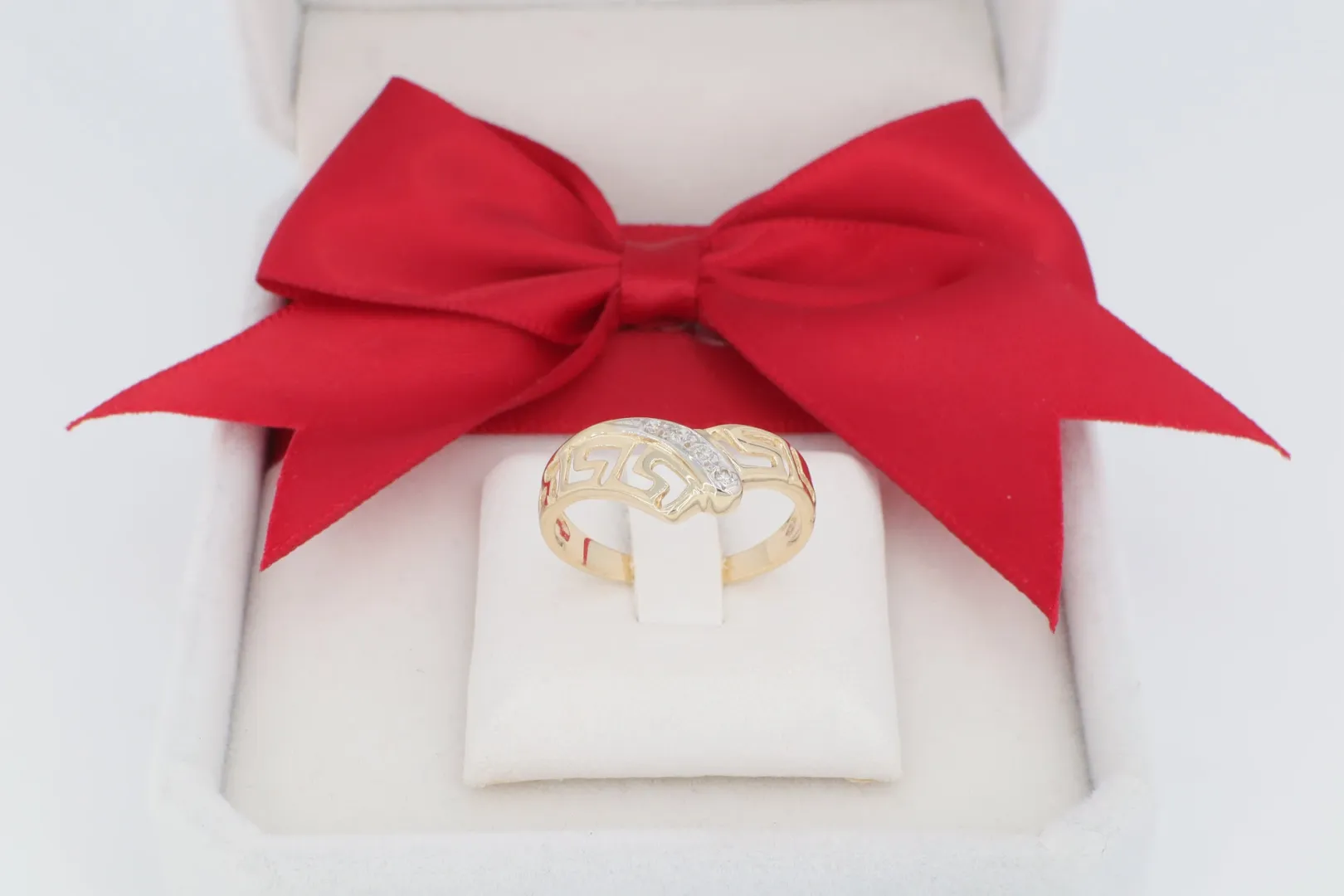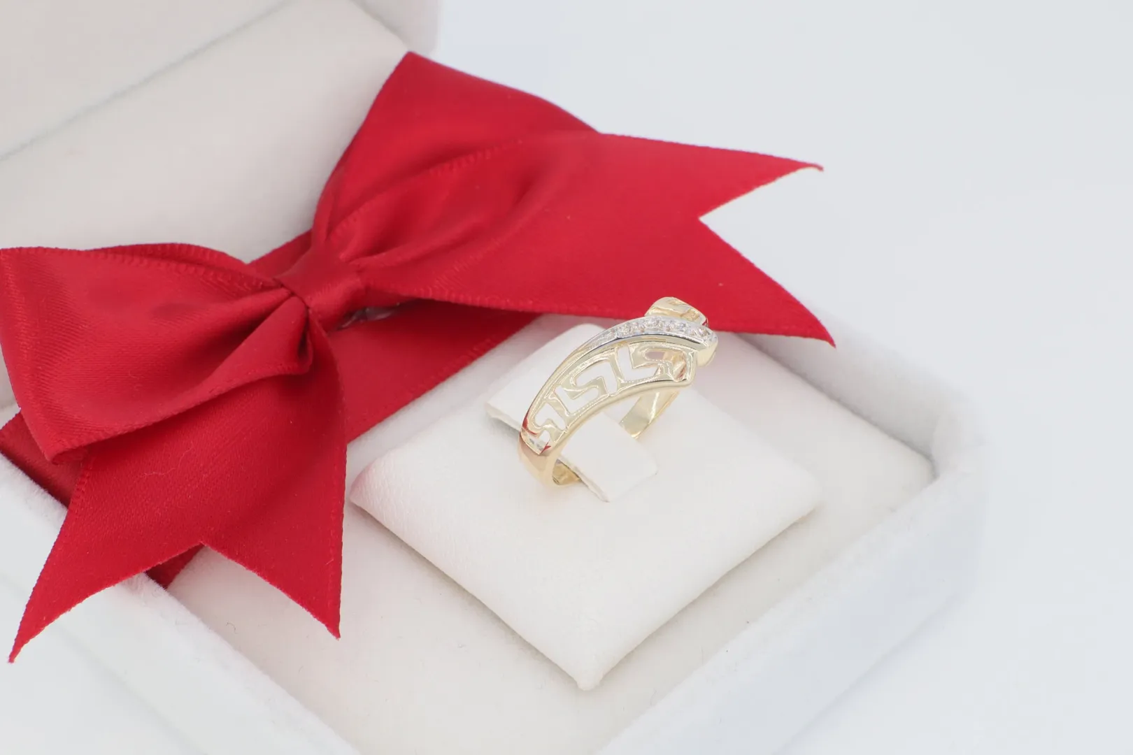 A GY0635 női arany gyűrű a kortárs ékszertervezés kivételes darabja, amely a szerkezeti eleganciát ötvözi a fényűző ragyogással. A gyűrű feje egy szélesebb, markánsabb sávot alkot, melyet különleges, áttört geometriai minta díszít. A design dinamikus kétszínű hatású, ahol a klasszikus sárga arany meleg fénye a minta belsejében megjelenő fehérarany hatású (ródiumozott) elemek hűvös kontrasztjával találkozik. A gyűrű közepét három, gondosan foglalt cirkónia kő teszi teljessé, melyek extra csillogást kölcsönöznek. Ez a modern arany gyűrű ideális azoknak, akik egy feltűnő, texturált és elegáns darabot keresnek.