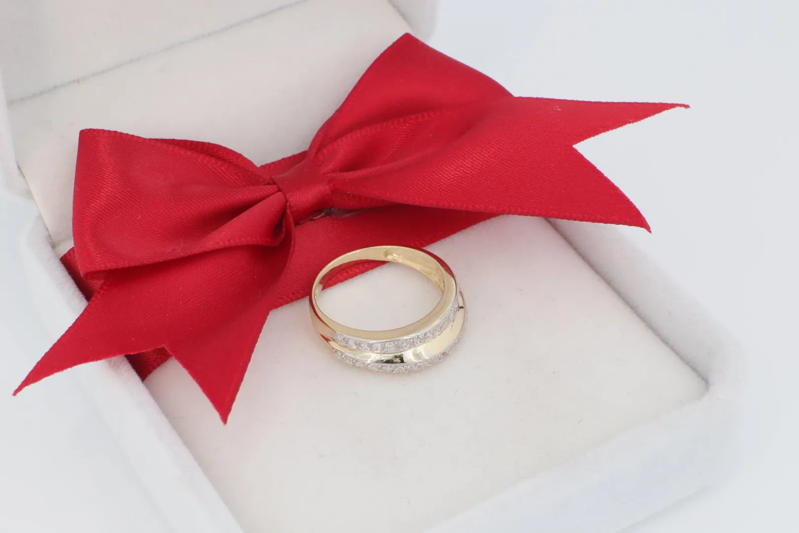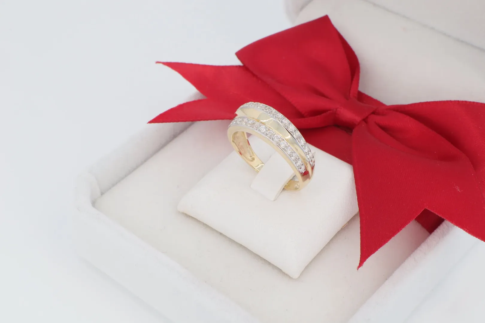 Ez a fenséges 14 karátos arany gyűrű (585‰ finomság) a modern pompa és a klasszikus sárga arany tökéletes házasítása. A dizájn alapját két, elegánsan ívelt, egymással párhuzamos sáv adja, amely vizuálisan megduplázza a gyűrű szélességét és a csillogás intenzitását.