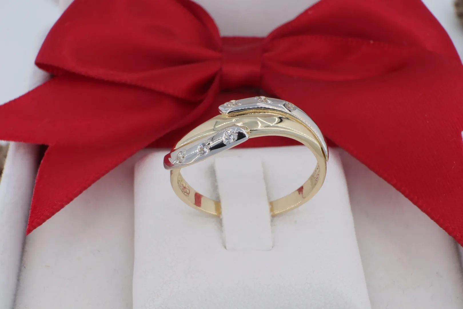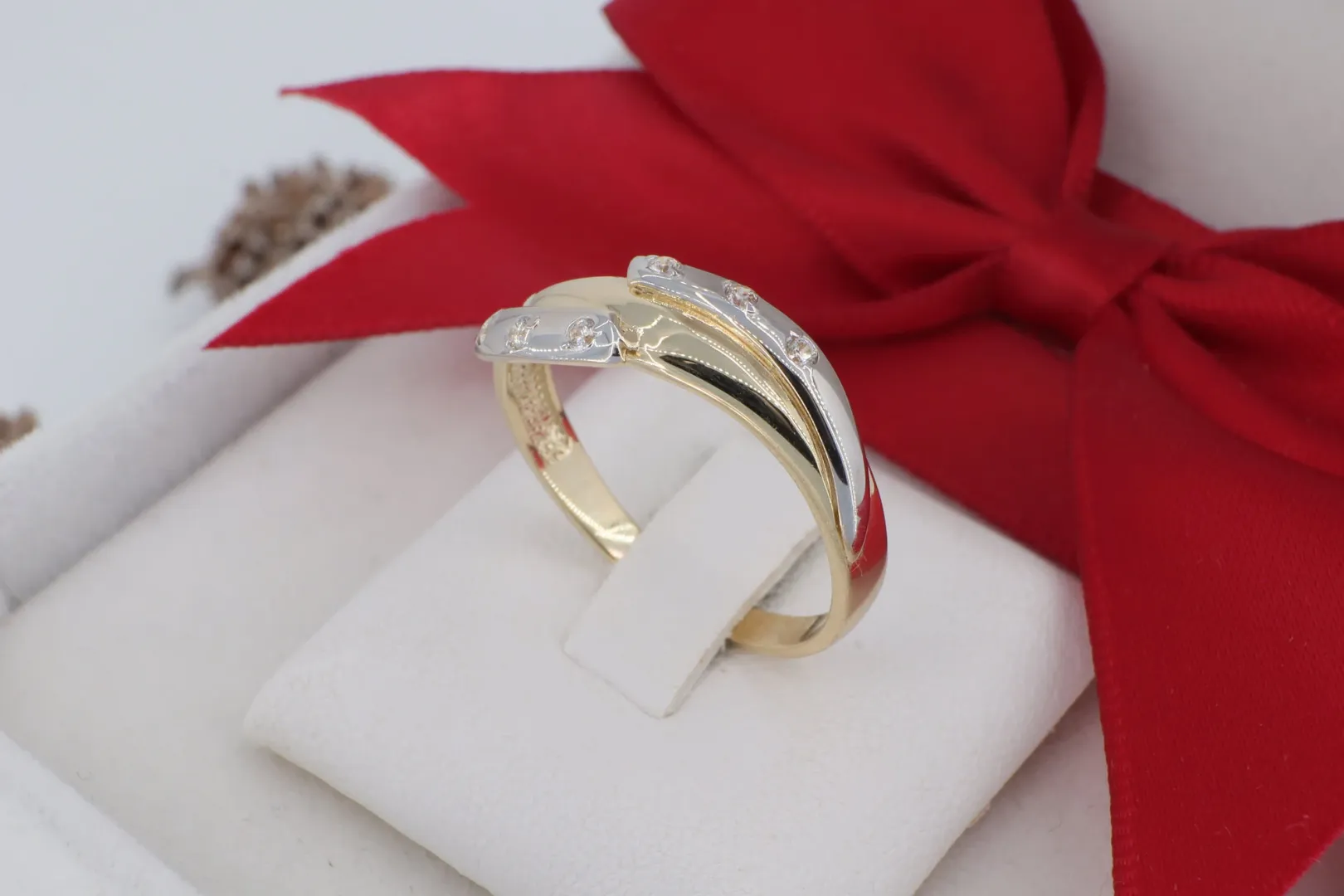 A gy0580-as azonosítójú, 14 karátos sárga arany gyűrű a klasszikus eleganciát modern, plasztikus formavilággal ötvözi. Az ékszer fejrészét két oldalt egy-egy kiemelkedő, íves motívum díszíti, amelyek dinamikusan emelkednek ki a gyűrű síkjából. Mindkét ívbe 3-3 darab briliáns csiszolású cirkónia követ foglaltak, amelyek a fehér arany hatású ródium bevonatnak köszönhetően még intenzívebb fényt árasztanak. A ródiumozott felület hűvös csillogása és a gyűrűtest meleg sárga arany fénye közötti kontraszt teszi ezt a darabot igazán stílusossá és értékessé.