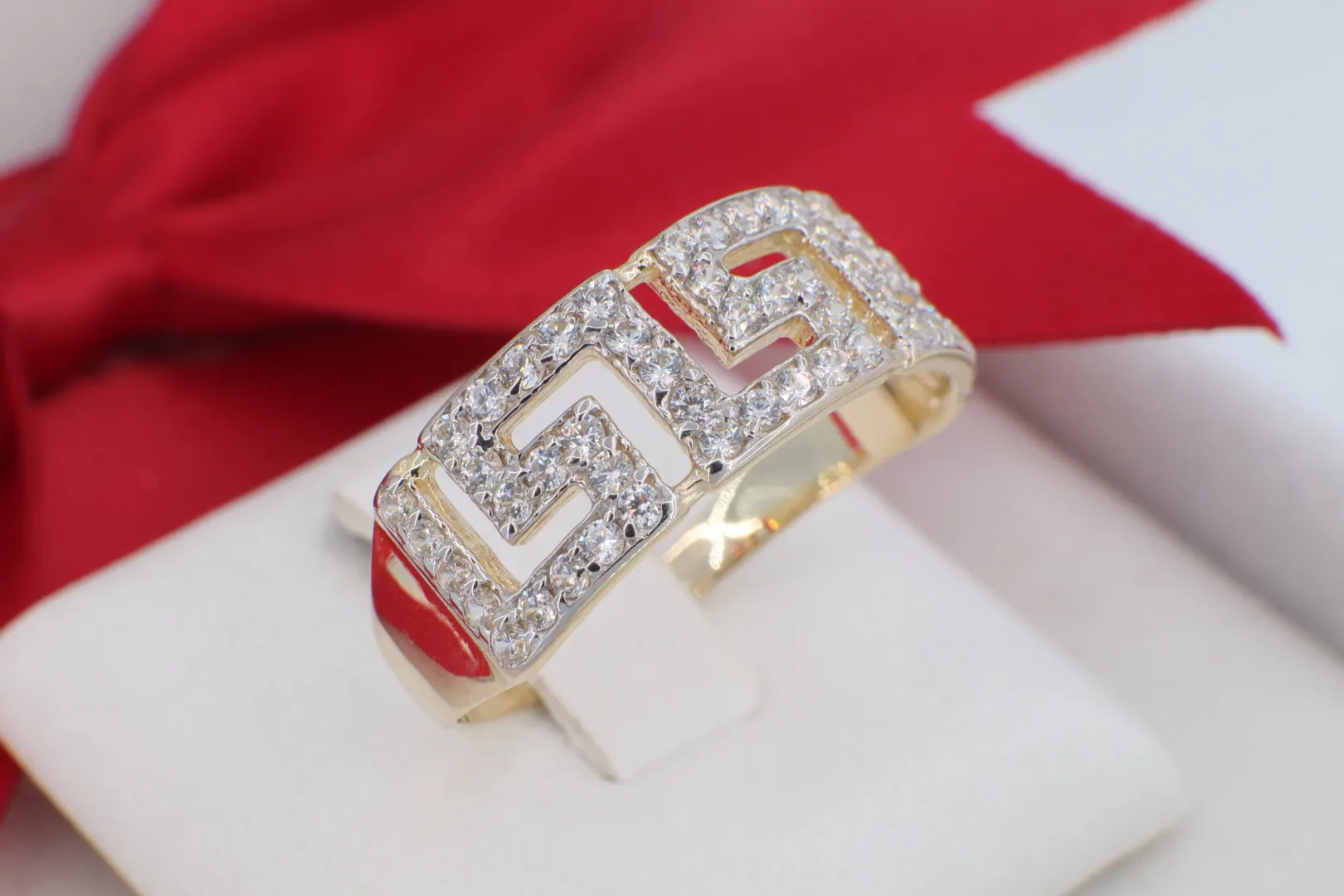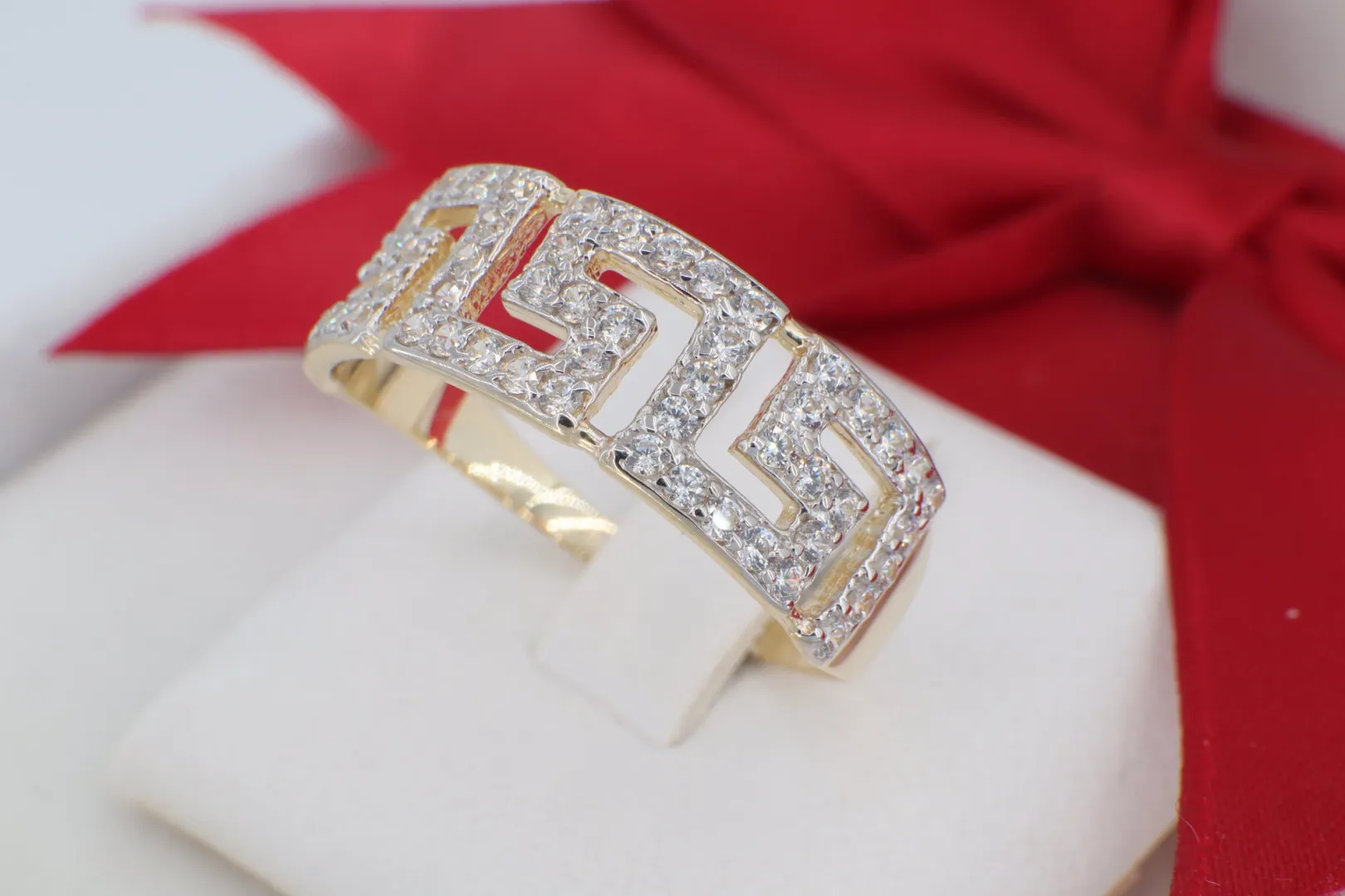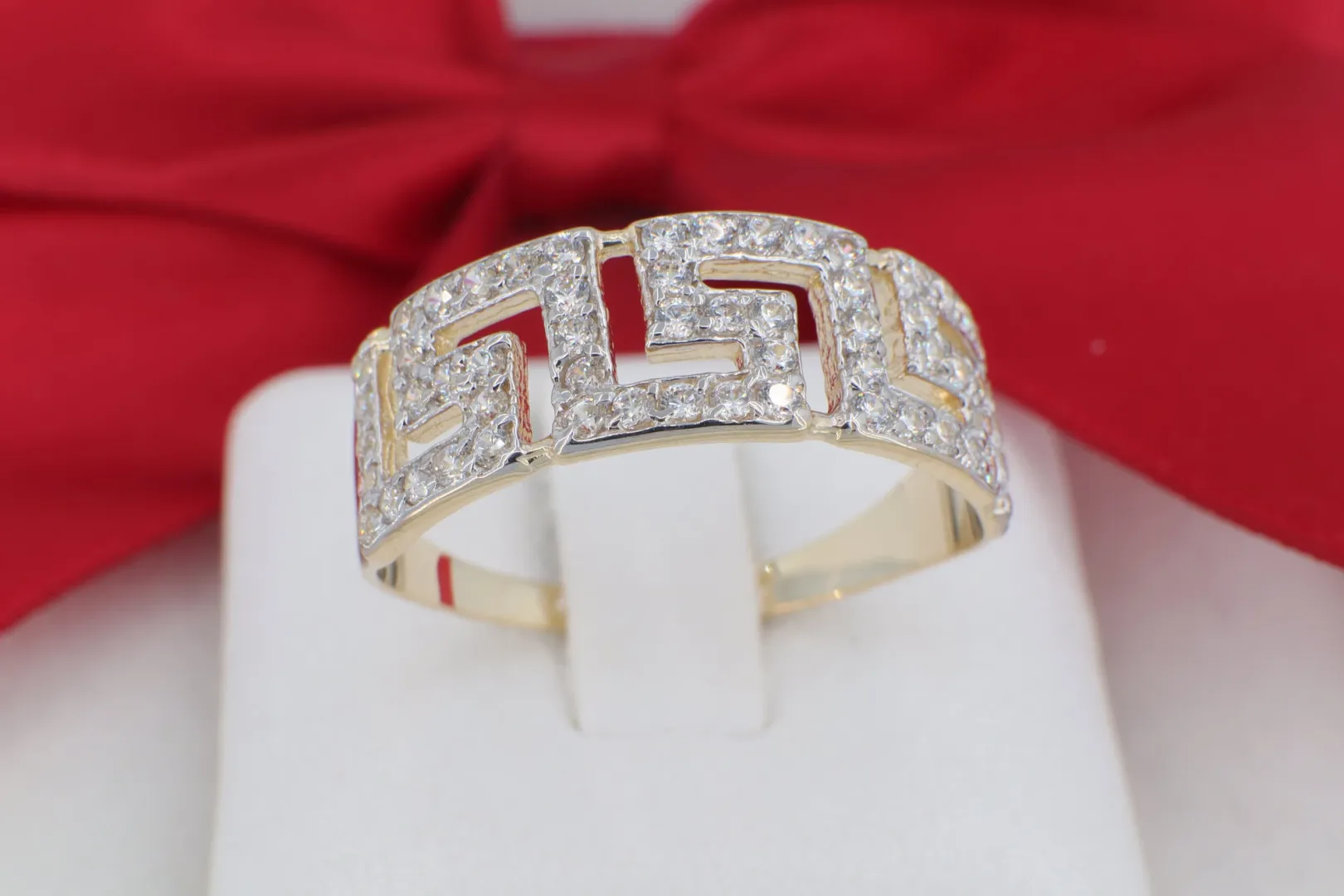 A GY0693-as kódszámú, 14 karátos arany gyűrű az antik világ időtlen eleganciáját és a modern luxust ötvözi. A gyűrű feje egy látványos, áttört görög kulcs (Meander) motívumot formáz, amely az örökkévalóság és az egység szimbóluma. A geometrikus mintázatot sűrűn elhelyezett, briliáns fényű cirkónia kövek borítják, amelyek minden szögből visszaverik a fényt, garantálva a lenyűgöző csillogást. Ez az ékszer ideális választás azoknak, akik egy karakteres, történelmi ihletésű, mégis rendkívül nőies darabot keresnek.