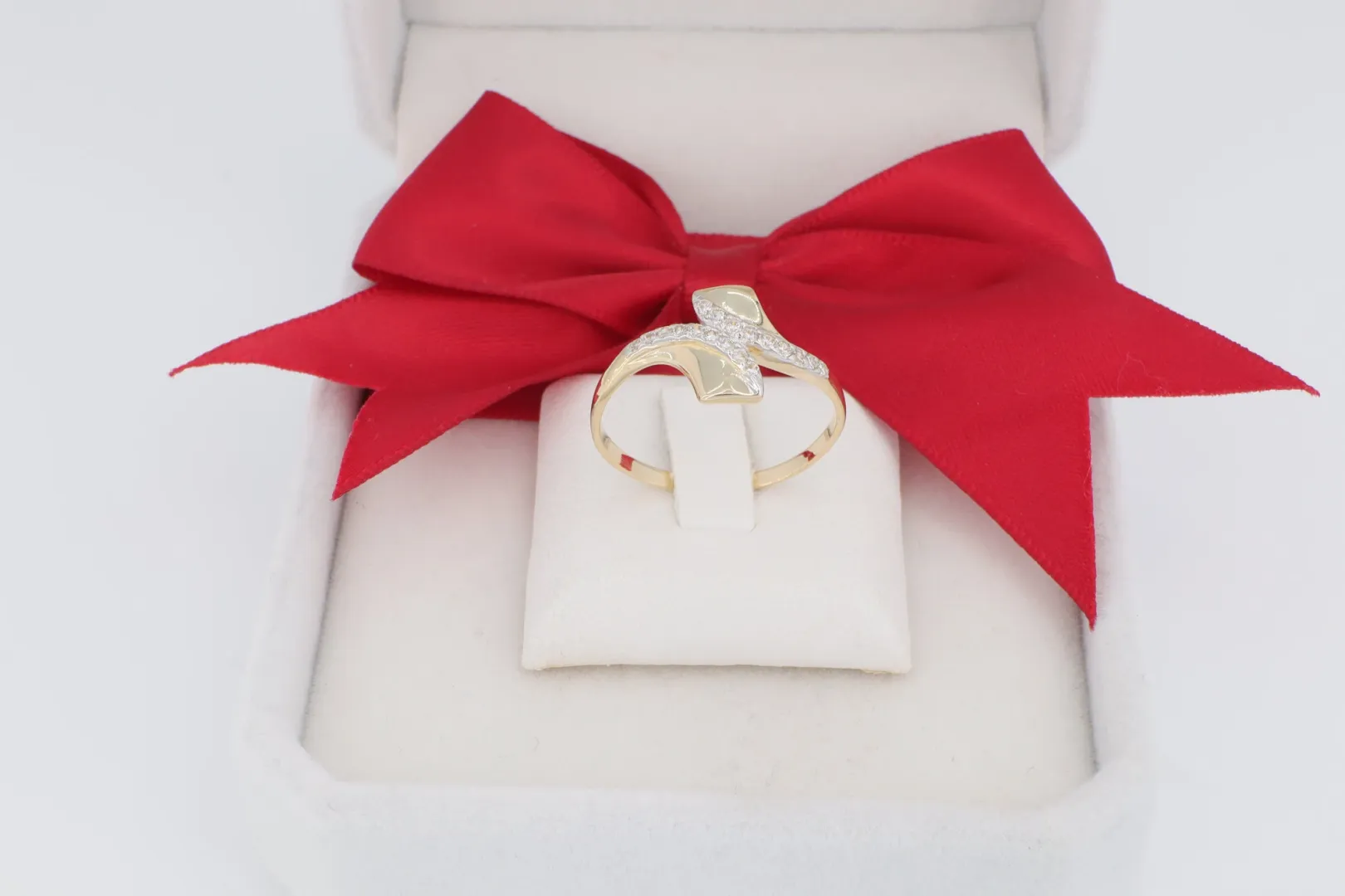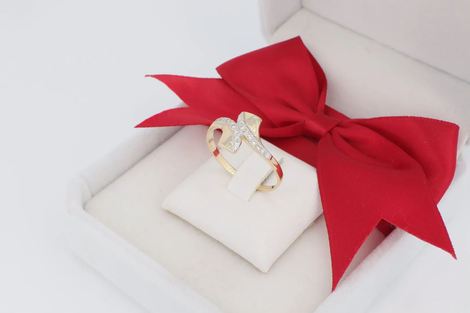 A design kiemelt eleme a kéttónusú megmunkálás és a kőberakás. A sárga arany sín polírozott, klasszikus melegséget áraszt. A másik, átlósan kereszteződő elem fehér ródium bevonattal van ellátva, és teljes felületén sűrűn foglalt, apró cirkónia kövek ragyognak. A két szín és felület (fényes sárga arany és csillogó fehér arany/cirkónia) kontrasztja teszi a gyűrűt különösen látványossá.