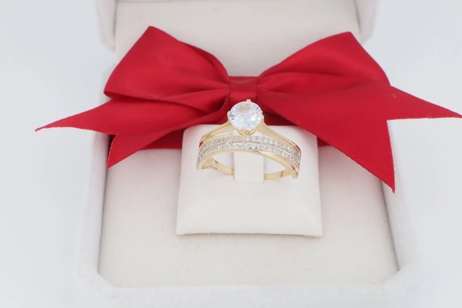 Ez a különleges 14 karátos arany gyűrű egyetlen darabban nyújtja a kísérőgyűrűvel ellátott eljegyzési szett hatását. A design két párhuzamos sínre épül, amelyek modern és elegáns megjelenést kölcsönöznek viselőjének.