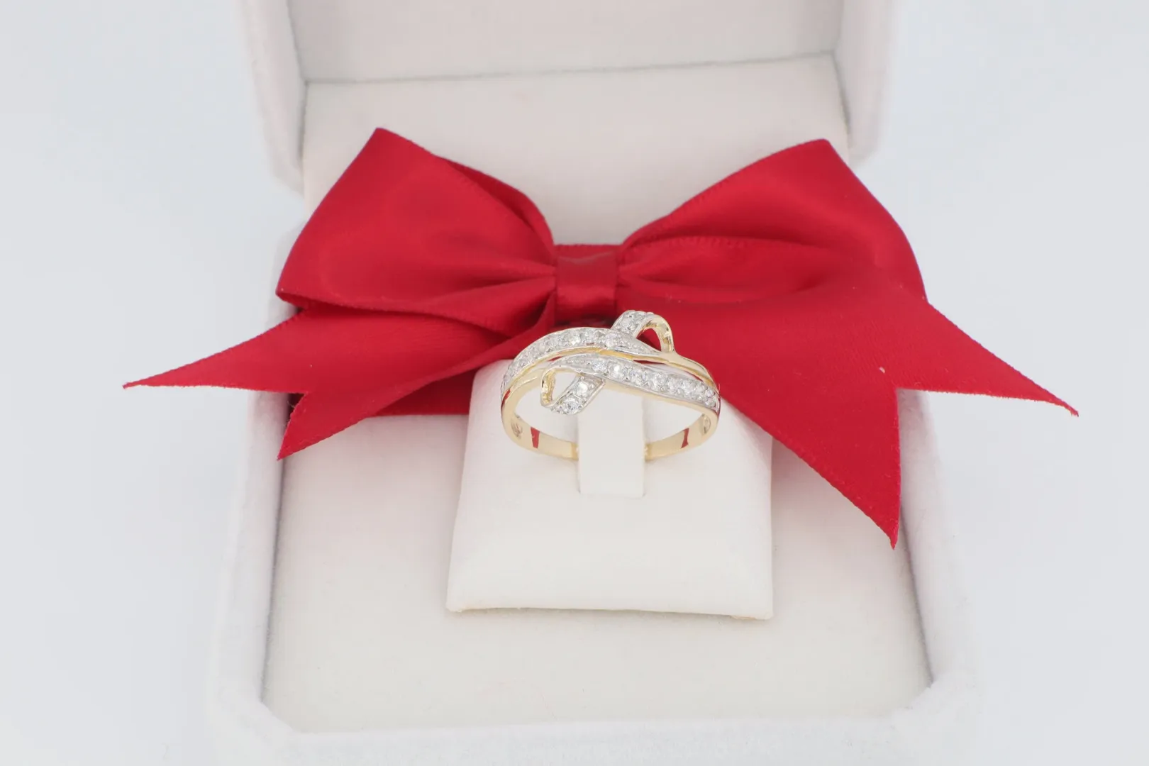 A gyűrű feje széles és áramló, egy komplex, de harmonikus formát alkotva. A dizájnt két, egymást lágyan keresztező, ívelt sáv uralja. Mindkét sáv felületét sűrűn sorba foglalt, ragyogó cirkónia kövek díszítik. A sávok kereszteződésénél a formák összefonódnak, elegáns, "végtelen" vagy organikus hatást keltve. A sávok közötti részek áttörtek, ami könnyedséget és légiesebb érzetet ad a széles kialakításnak.