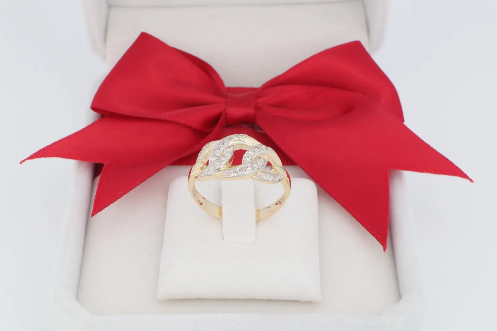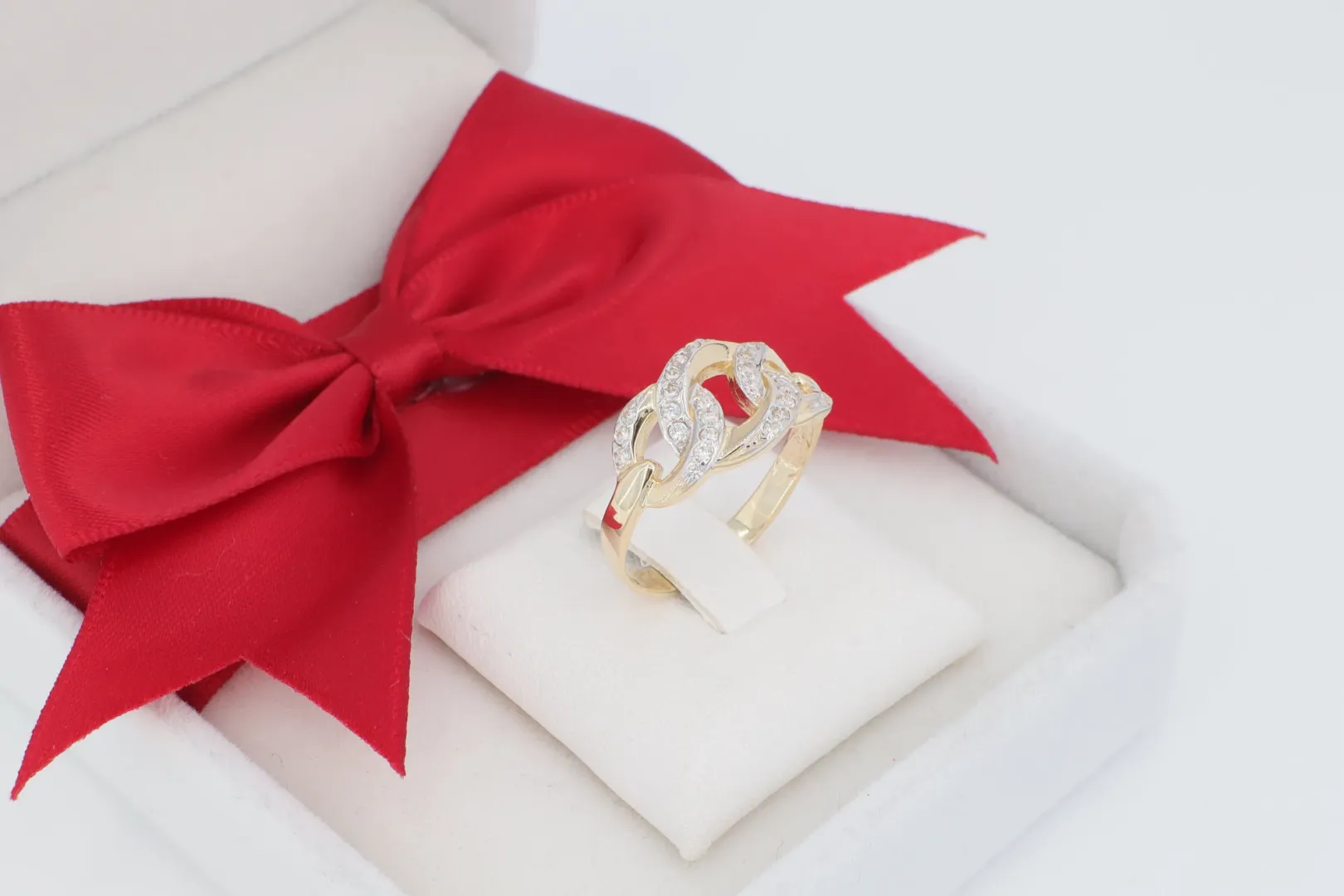 Láncszem Design: Két áttört, egymásba fonódó láncszem alkotja a gyűrű központi részét, dinamikus és modern hatást keltve.