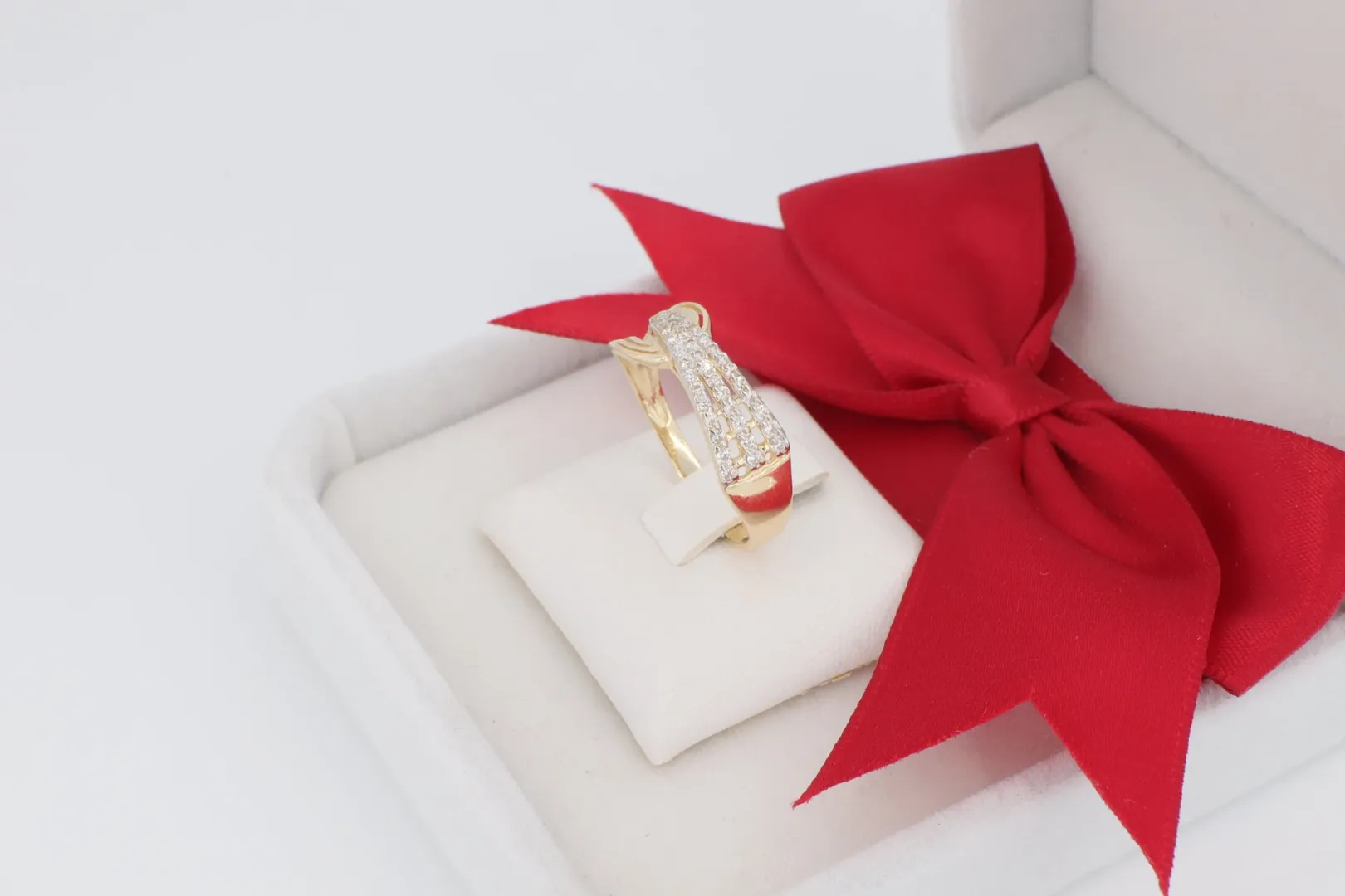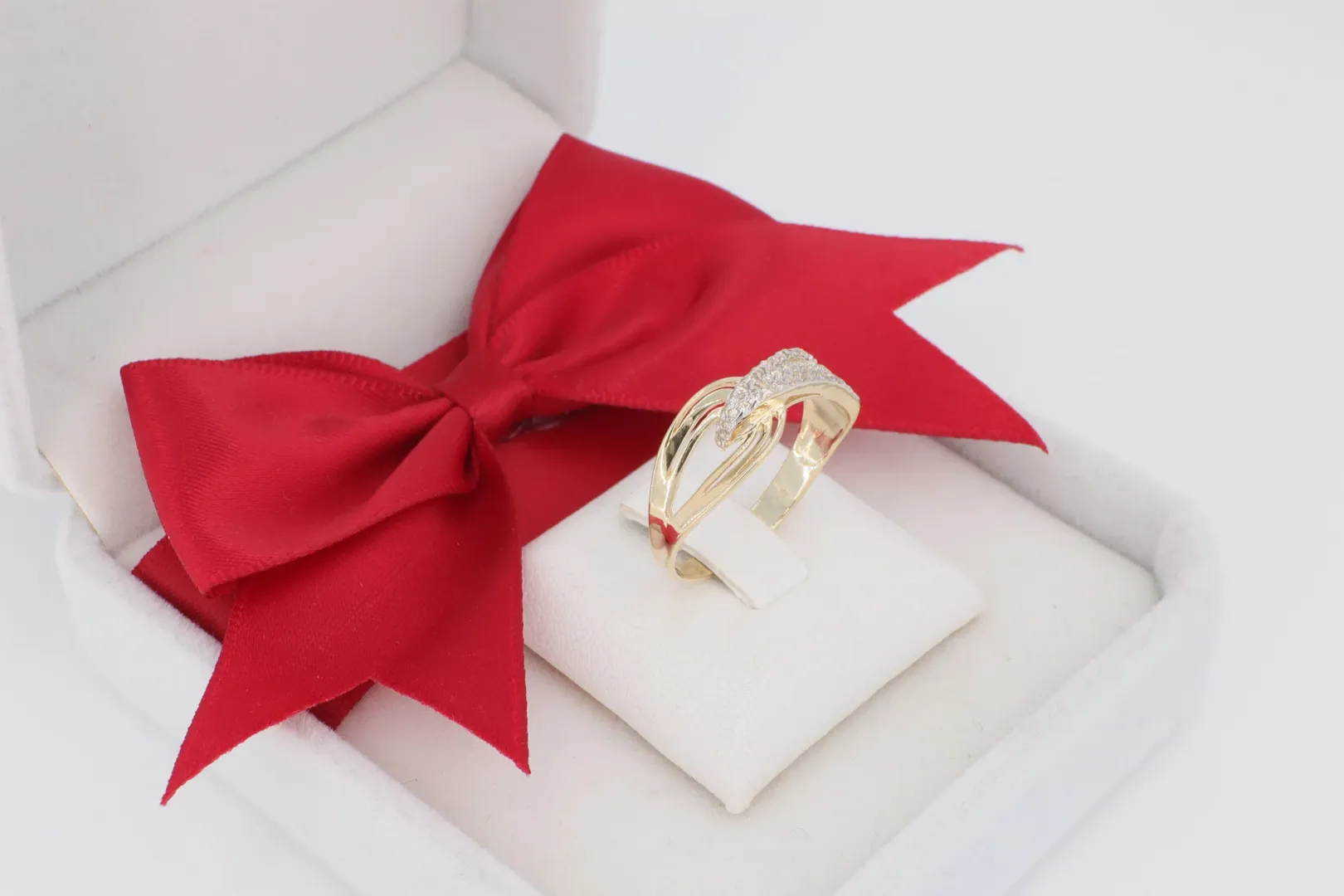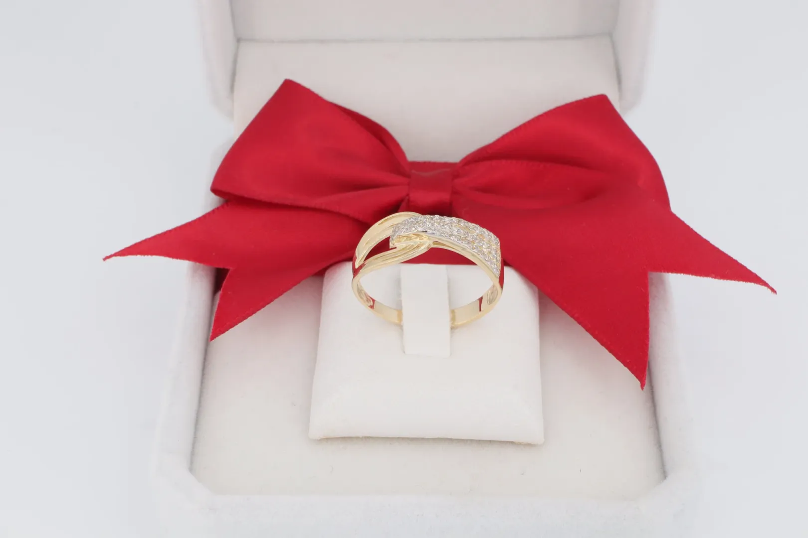 Ez a női arany gyűrű remek ajándék lehet bármilyen alkalomra, különösen azoknak, akik a modern, mégis elegáns vonalvezetésű, csillogó ékszereket kedvelik.