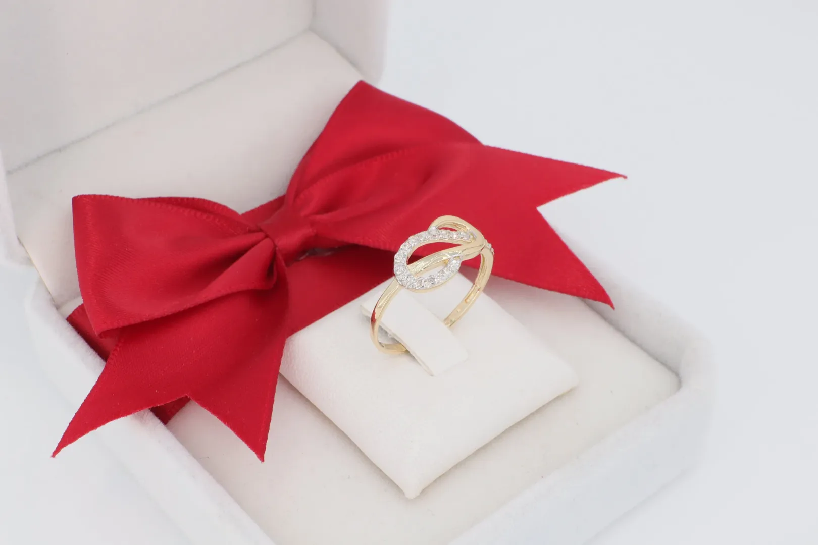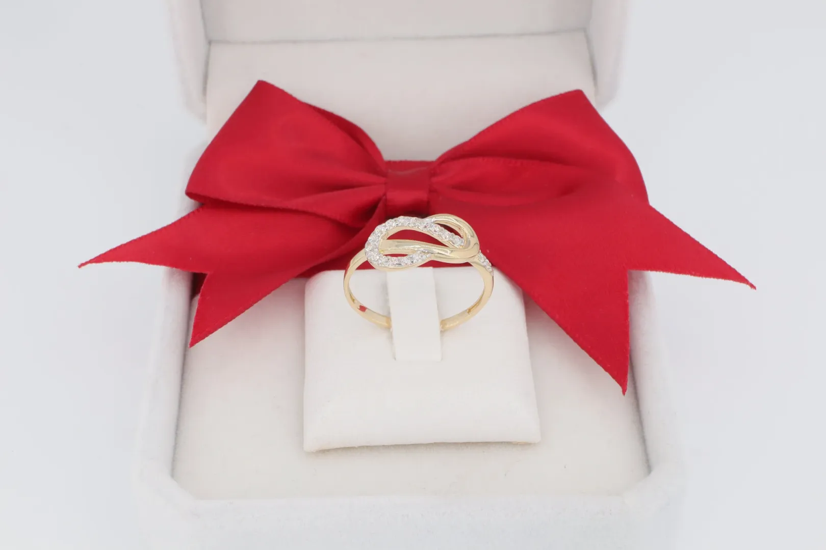 A gyűrű anyaga minőségi 14 karátos sárga arany (585‰ finomságú), melynek meleg fénye kiválóan érvényesül a hurokszerű, áttört kialakításban. A felső, összefonódó rész egyik ívét apró, ragyogó cirkónia kövek díszítik, amelyek finom, szikrázó csillogást kölcsönöznek a darabnak.