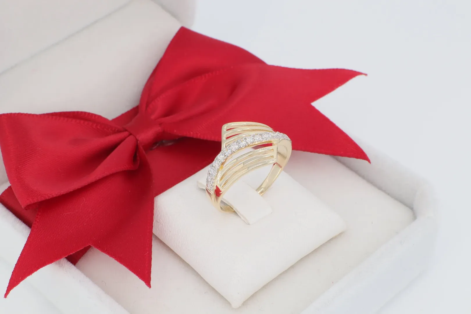 Csillogó Kőberakás: Az arany sávok közül egy vonal apró, ragyogó cirkónia kövekkel van kirakva. A kövek sorban futnak az ívelt forma mentén, növelve a gyűrű dinamikus hatását.
