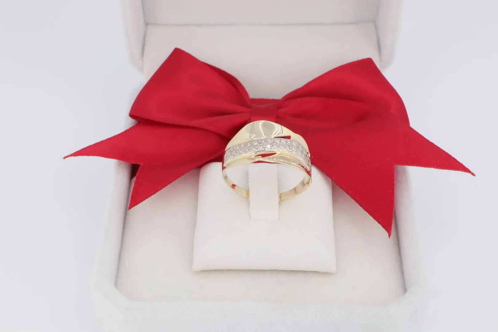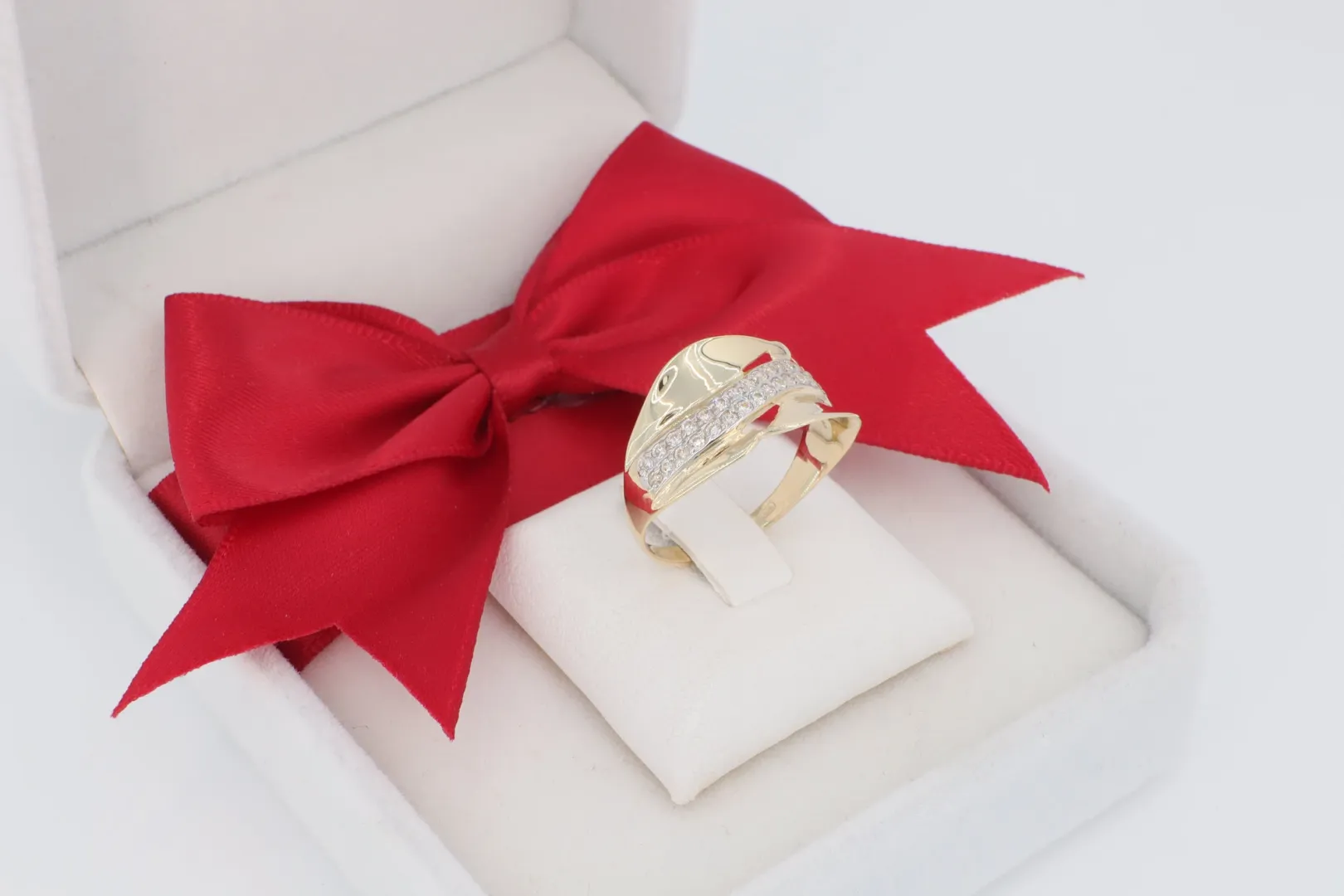A GY1005 14 karátos arany gyűrű egy igazi „statement” darab. Széles, masszív megjelenésű, anélkül, hogy nehézkes lenne. A design dinamikus áttört íveket használ, amelyek elegánsan ötvözik a sima aranyfelületet a kövek ragyogásával.