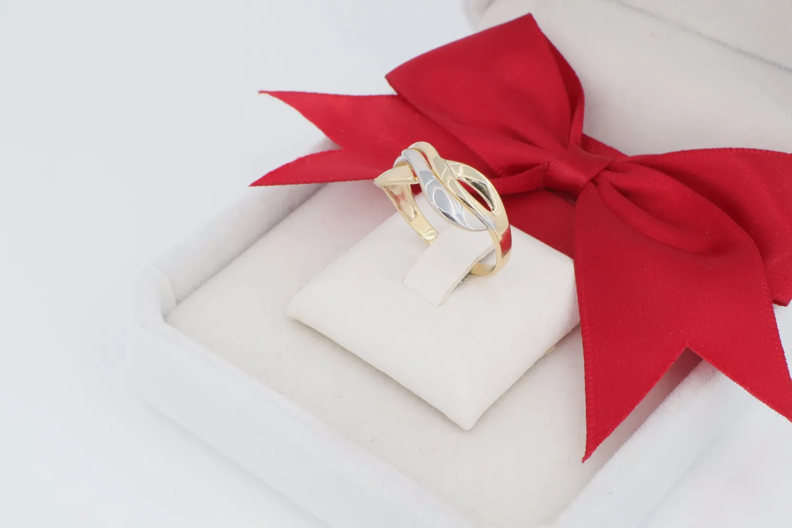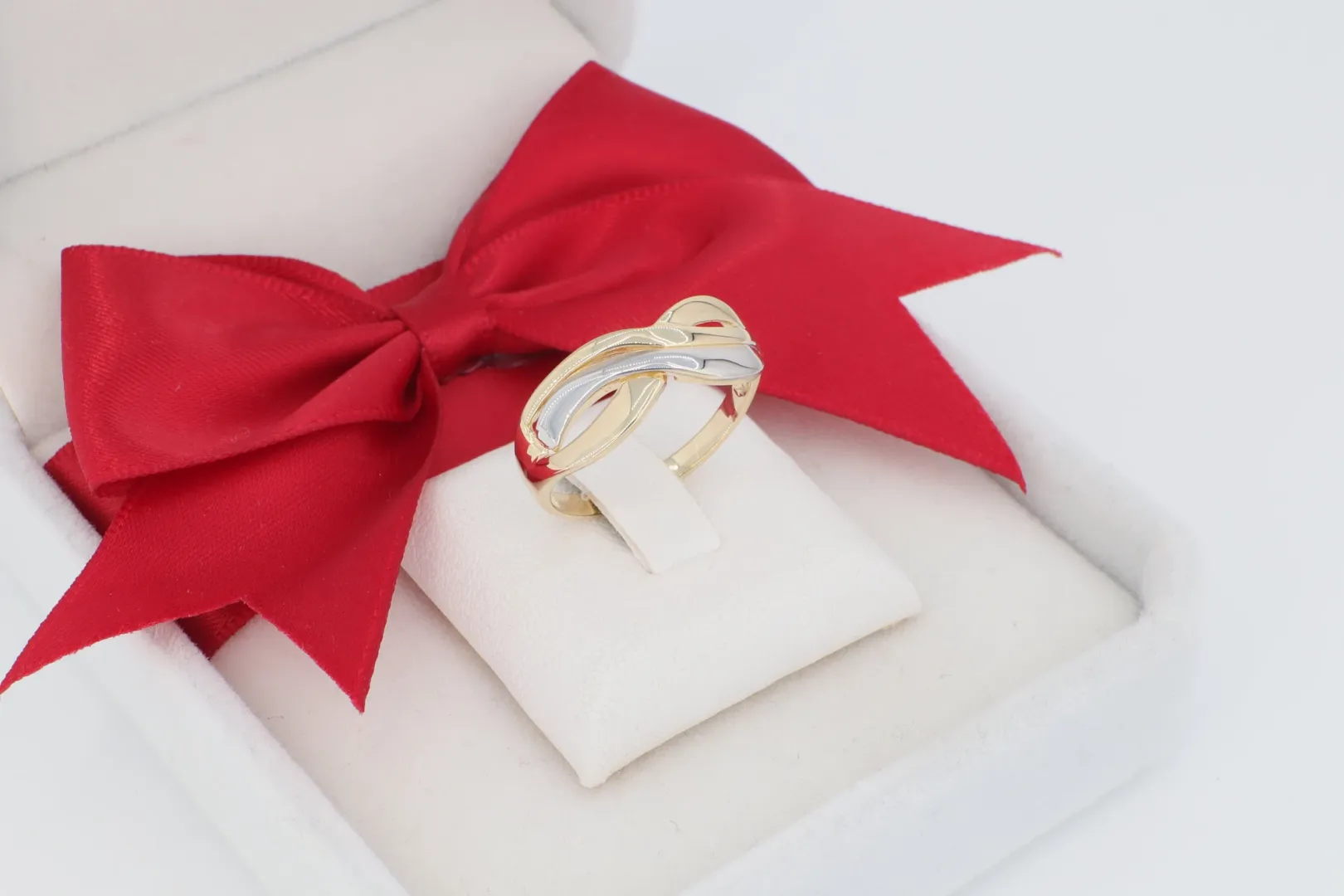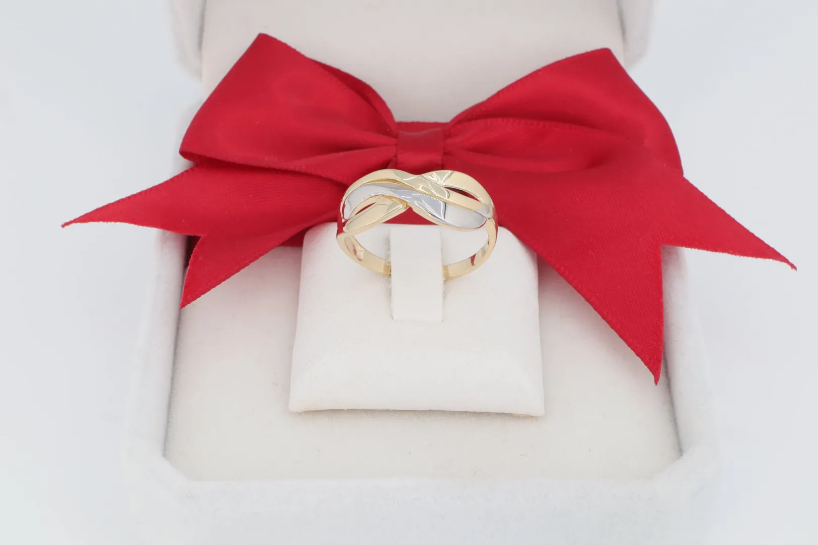 Kétszínű Arany Varázsa: A gyűrű egy része fényes, klasszikus sárga aranyból készült, míg a kereszteződésben lévő másik sáv ródium bevonattal van ellátva. Ez a kontrasztos kétszínű arany hatás adja a gyűrű egyedi báját és modern eleganciáját.