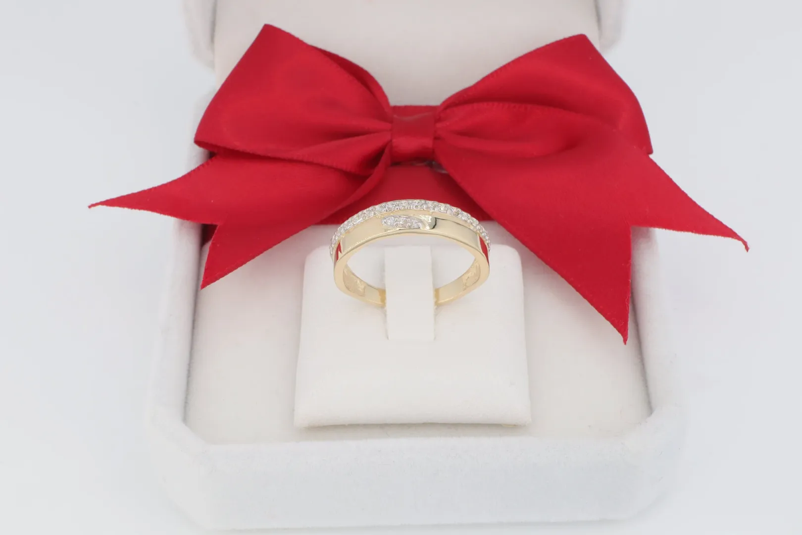 A gyűrű feje egy modern, téglalap alakú sávot formáz, melynek felületét két párhuzamosan futó, sűrűn sorba foglalt ragyogó cirkónia kősáv díszíti. A két kősor között egy vékony, polírozott arany sáv húzódik, amely tovább emeli a kövek ragyogását és texturális kontrasztot teremt. A kősávok elegánsan futnak körbe a gyűrű felső részén, intenzív fényt adva.