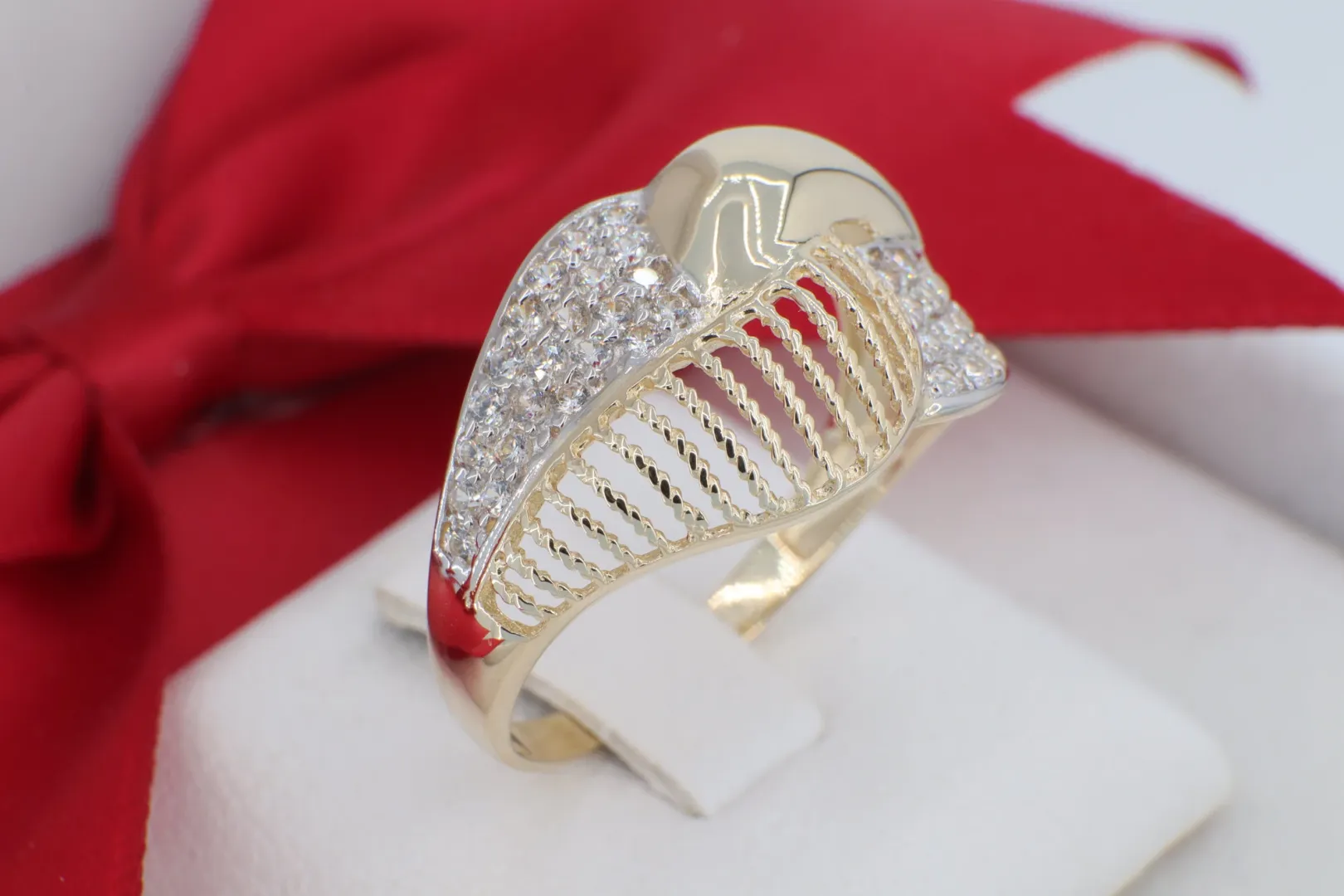 A GY1586-os modellszámú, 14 karátos arany gyűrű a nőies finomság és a luxus csillogás tökéletes egyensúlya. Az ékszer fejrészét két párhuzamosan futó, briliáns csiszolású cirkónia kövekkel díszített sáv alkotja, amelyeket középen egy kecses, áttört motívum választ el egymástól. Ez a különleges, "üreges" kialakítás nemcsak légies és modern hatást kelt, hanem hagyja, hogy a fény az ékszer minden részét átjárja, fokozva ezzel a kövek természetes tüzét.