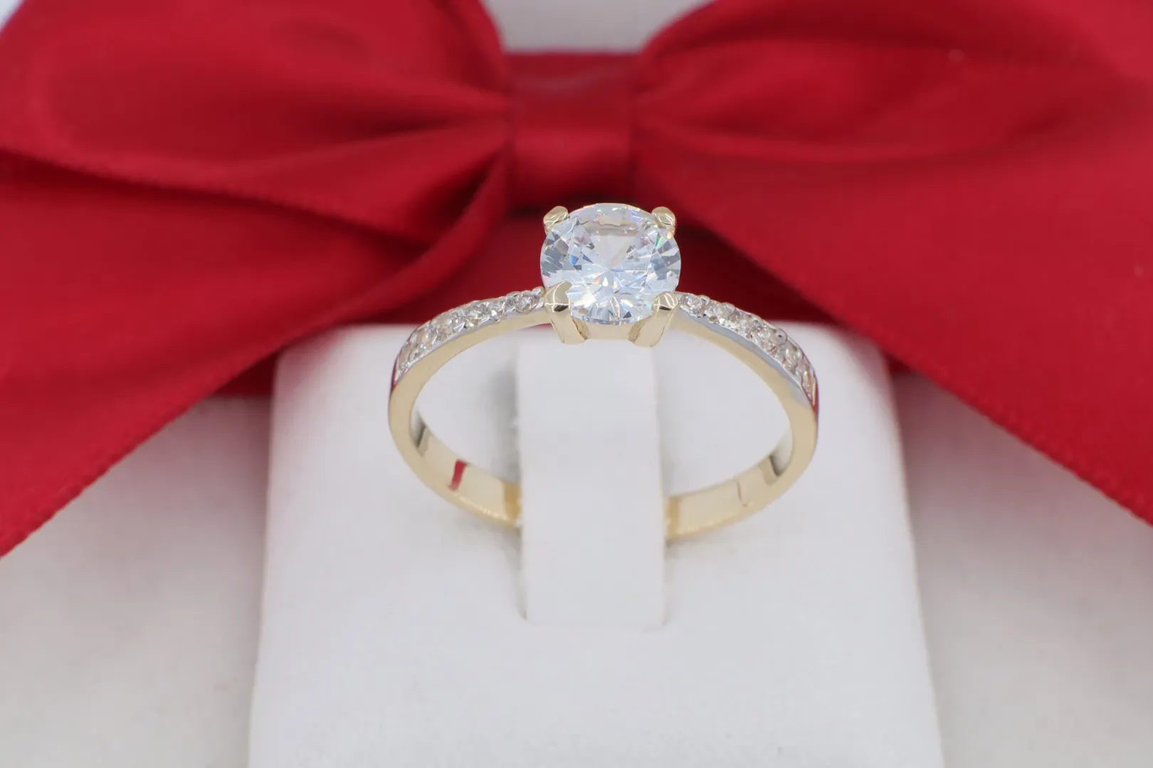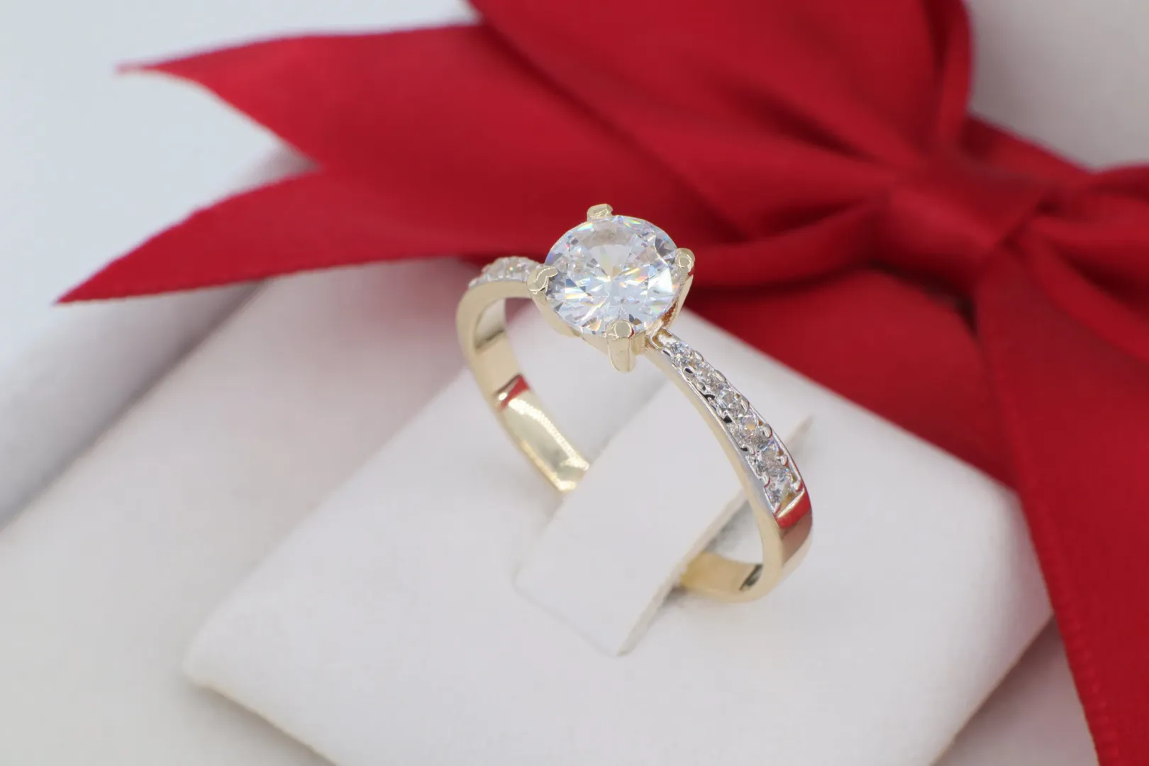 Fehér Arany Hatású Ródiumozás: A köves részek ródiumos finiselése kiemeli a cirkóniák tisztaságát a sárga arany környezetben.