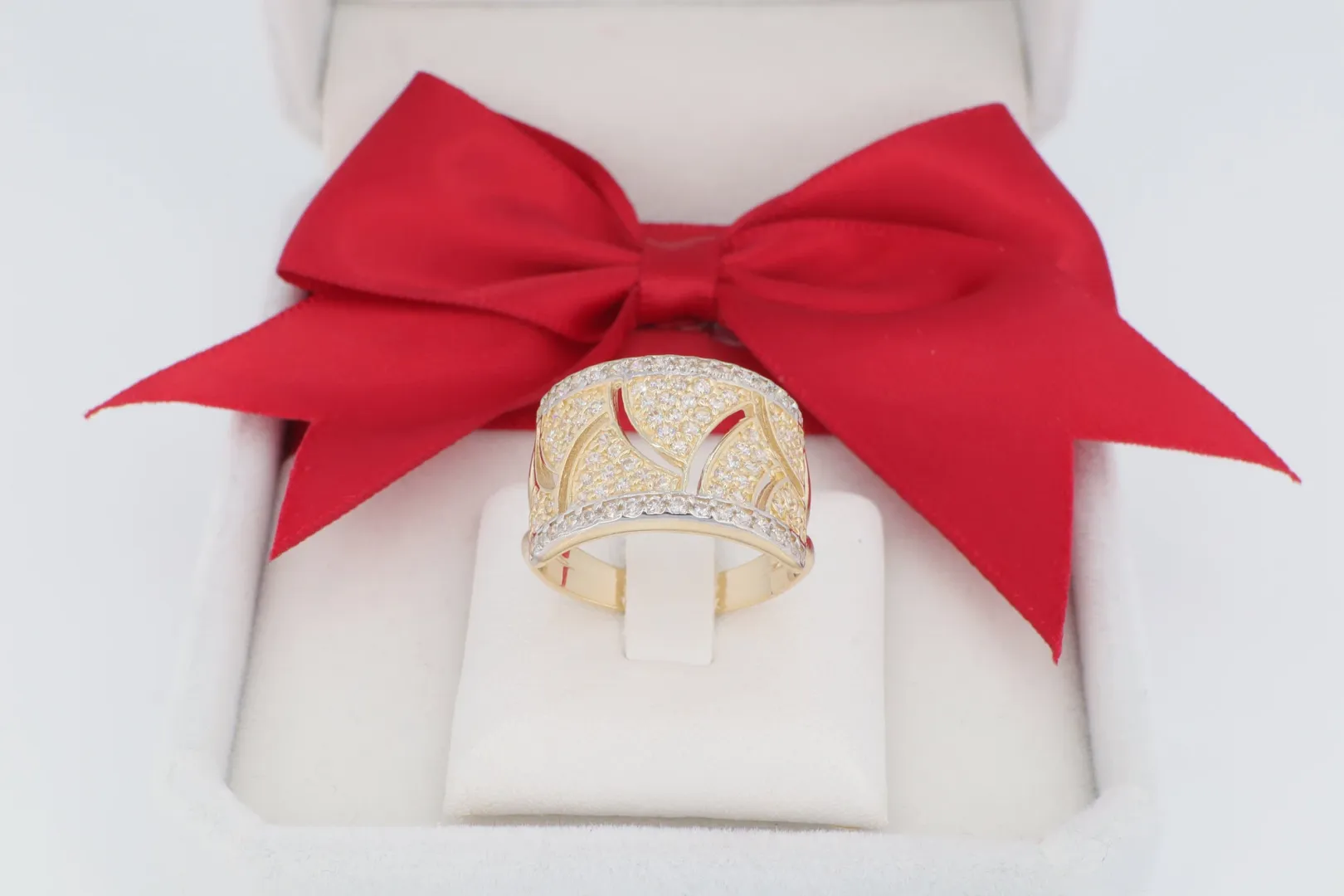 A GY0568 női arany gyűrű egy látványos, extra széles band gyűrű, amely a luxus és a modern elegancia tökéletes találkozása. A gyűrű domináns felületét áramló, hullámzó vonalak tagolják, melyek gazdagon beültetett cirkónia kövek és sima, fényes sárga arany felületek között váltakoznak. A ragyogást tovább fokozza, hogy a gyűrű széleit is apró, szikrázó cirkónia kövek szegélyezik (pave foglalás), így minden mozdulattal maximális fényt ver vissza. Ez az egyedi, széles arany gyűrű ideális koktélgyűrű alternatíva, amely garantáltan magára vonzza a tekintetet.