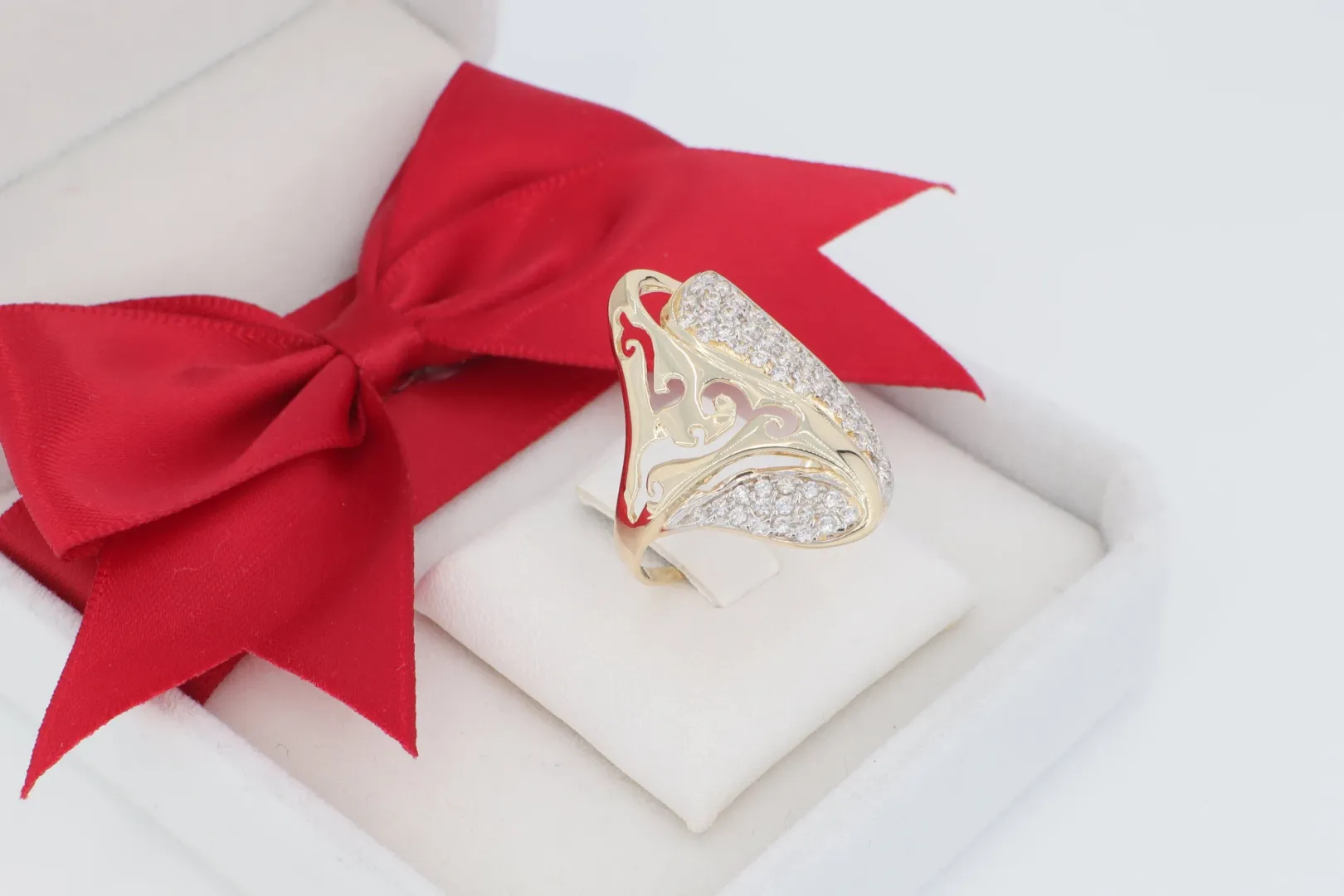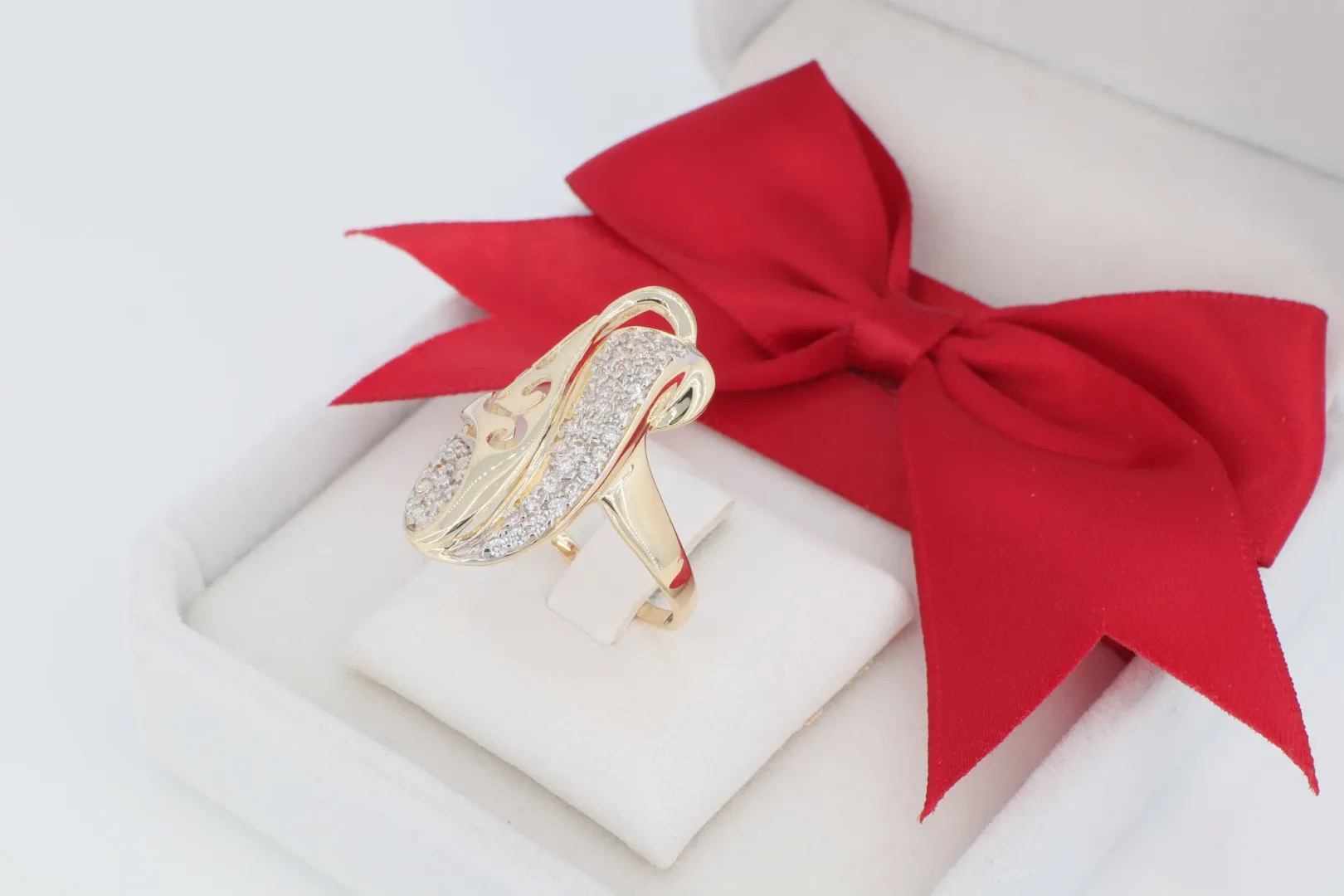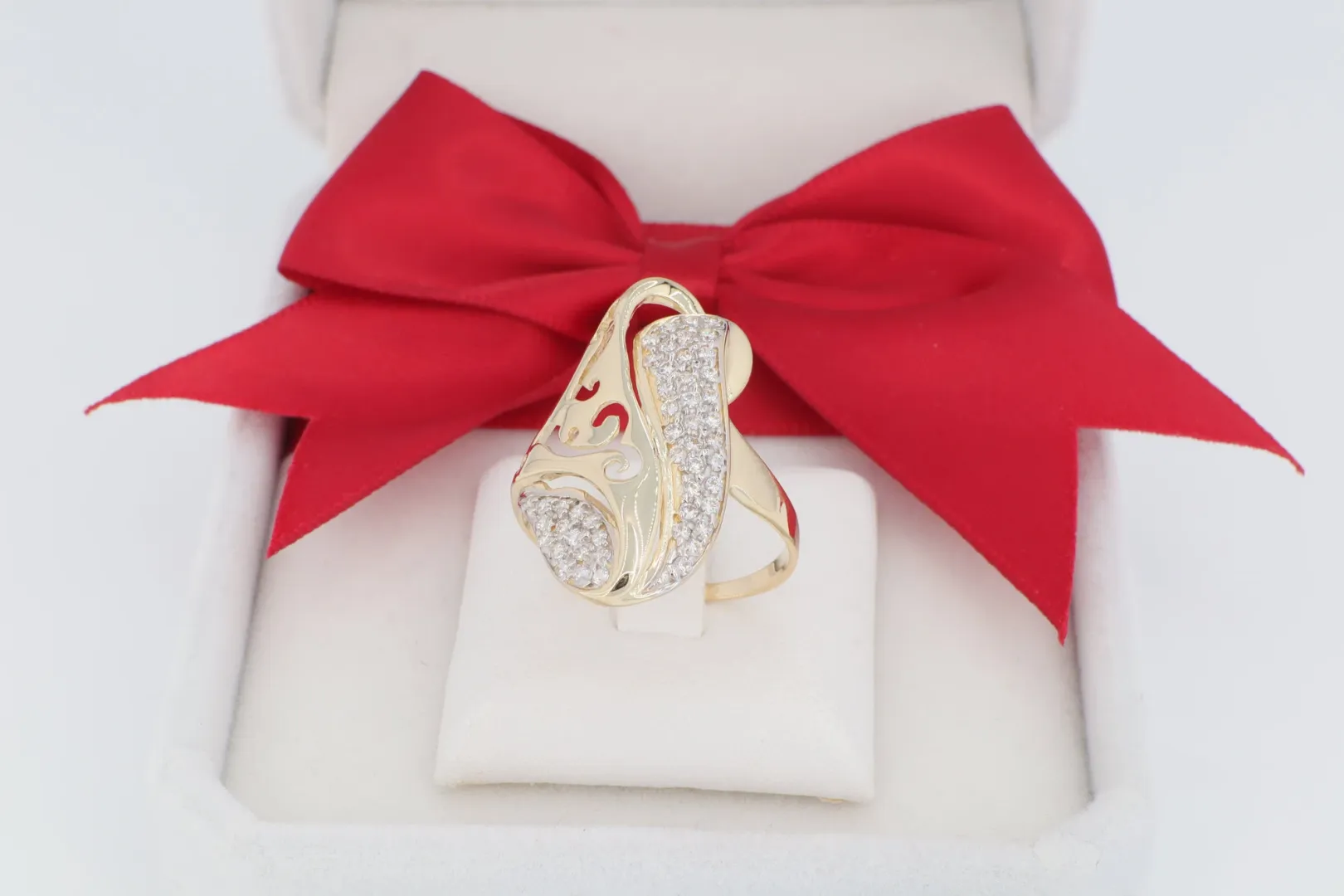 A GY0594 női arany gyűrű egy extravagáns, széles gyűrű, amely a modern ékszertervezés merészségét tükrözi. A gyűrű feje egy látványos, megnyújtott, aszimmetrikus formát mutat be, melyet dinamikus, áttört ívek és szikrázó felületek tagolnak. A klasszikus sárga arany alapot nagyméretű, sűrűn foglalt cirkónia kövek borítják, melyek intenzív ragyogást kölcsönöznek. A dizájn egyes részei fehérarany hatású (ródiumozott) felülettel vannak ellátva, ami fokozza a csillogást és modern kontrasztot teremt. Ez a nagy méretű arany gyűrű ideális azoknak, akik egy igazi statement darabbal szeretnék kiegészíteni ruhatárukat.