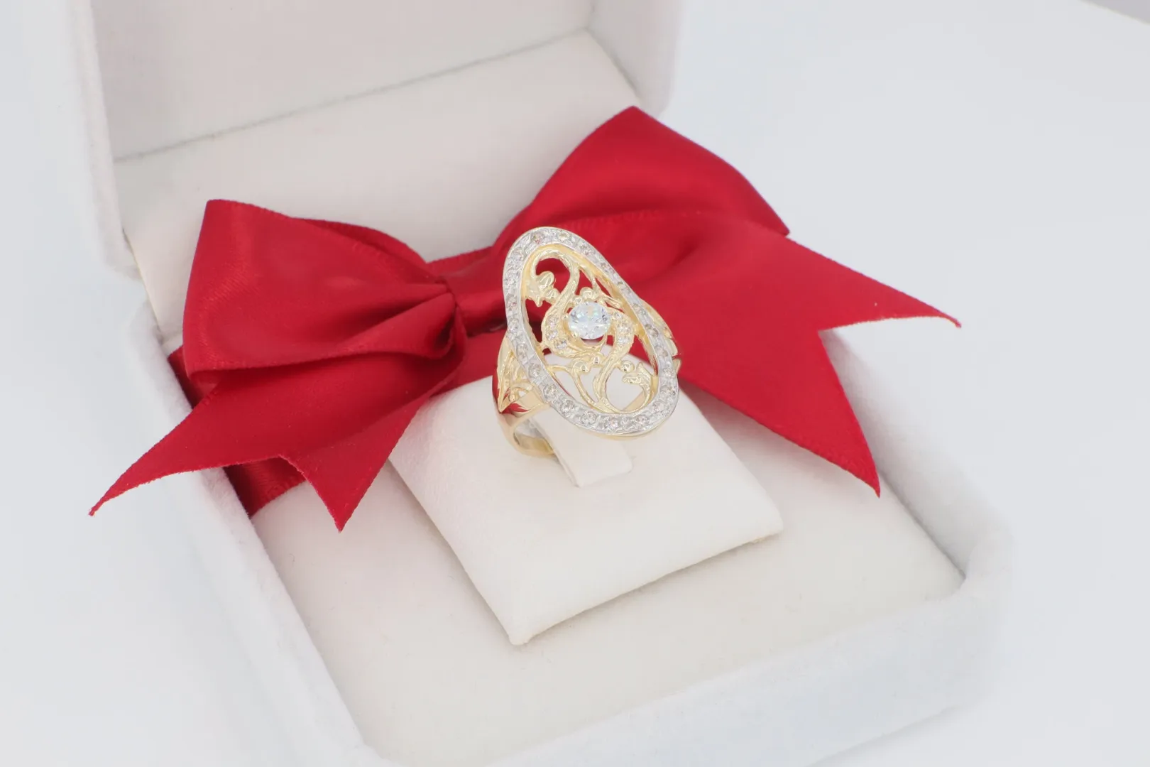 Hosszúkás, Áttört Fejrész: A gyűrűfej hosszúkás, ovális alakú, amelyet finom, áramló, indamotívumokra emlékeztető arany szálak hálója alkot. Az áttört kivitelezés könnyed, szoborszerű hatást kelt.